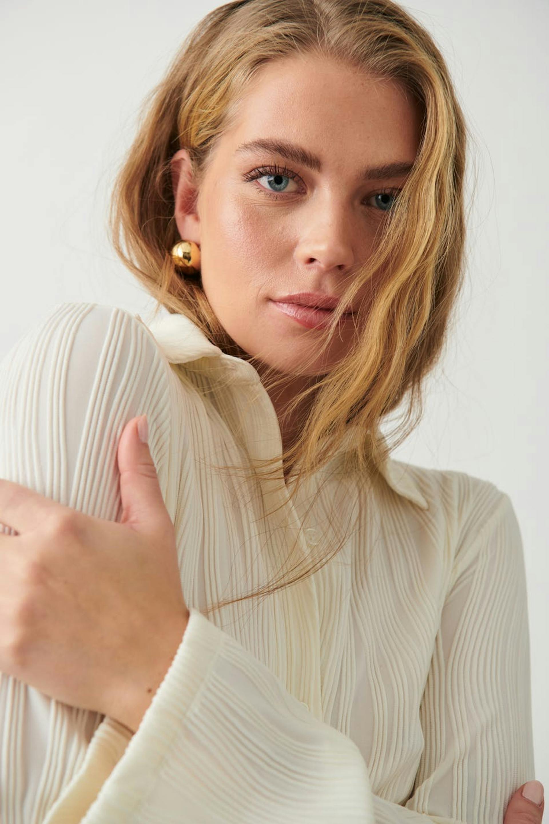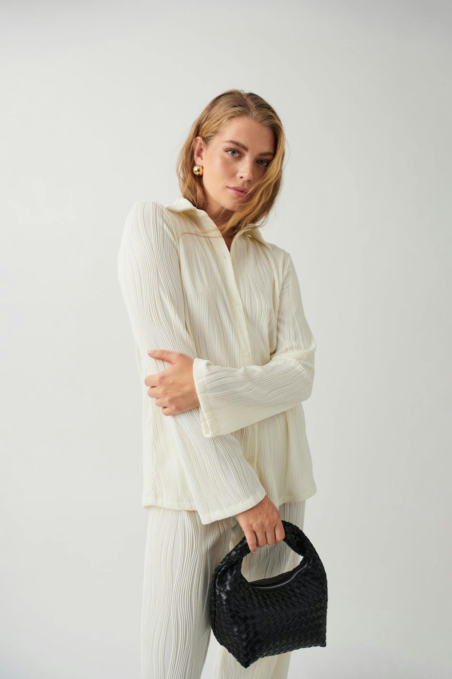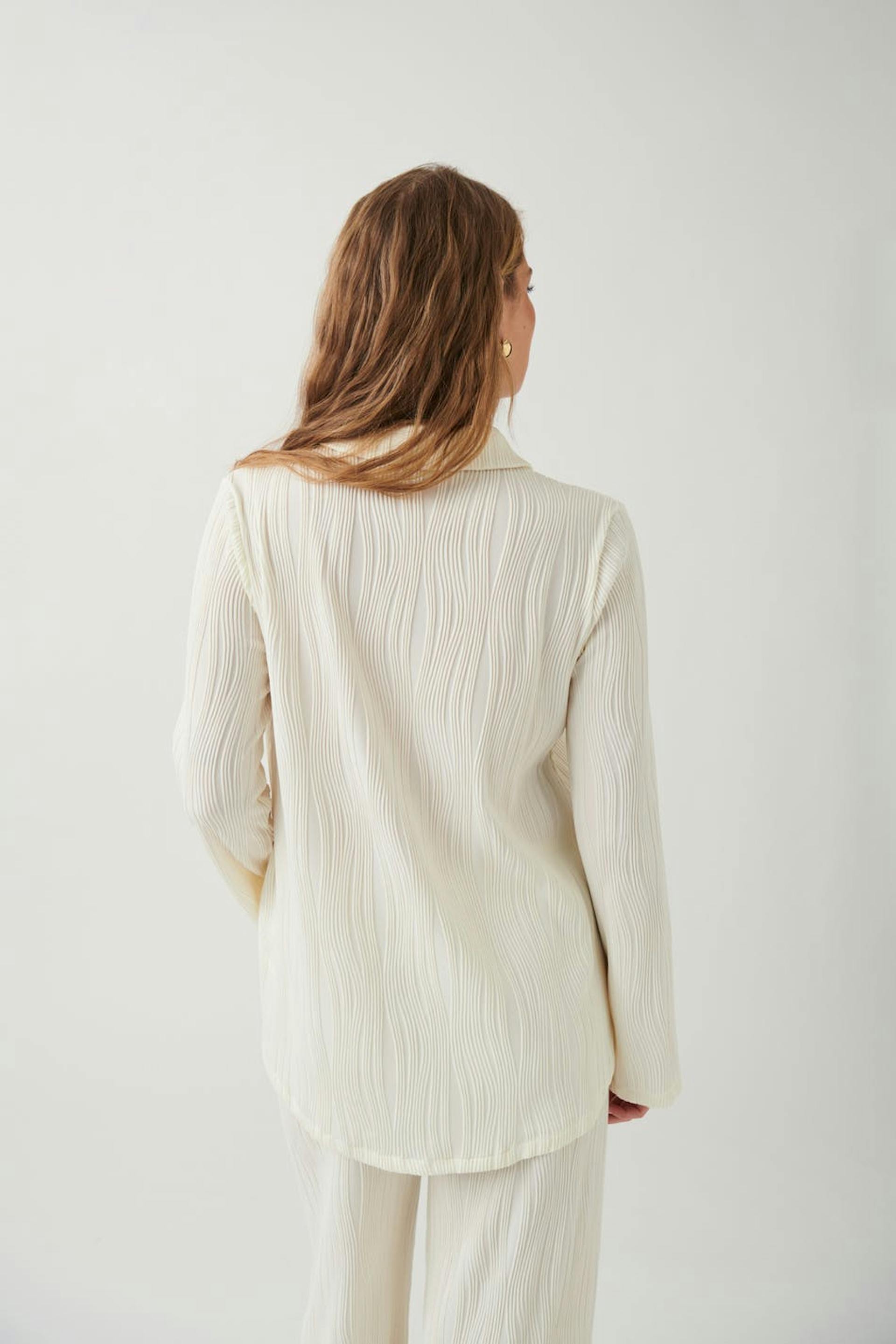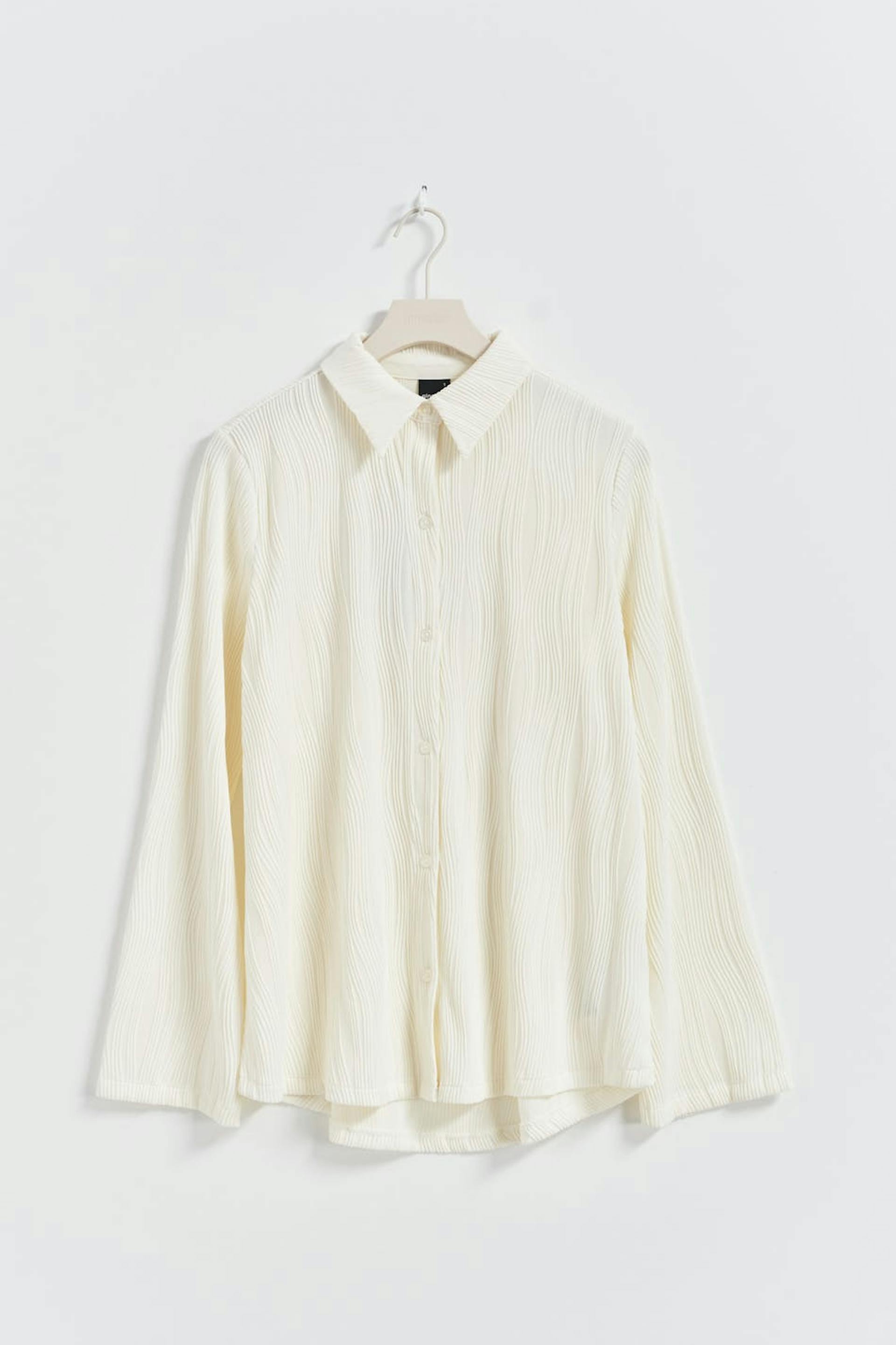 Gestructureerd hemd met dichtknopen aan de voorkant. Het hemd is wit en heeft lange mouw.