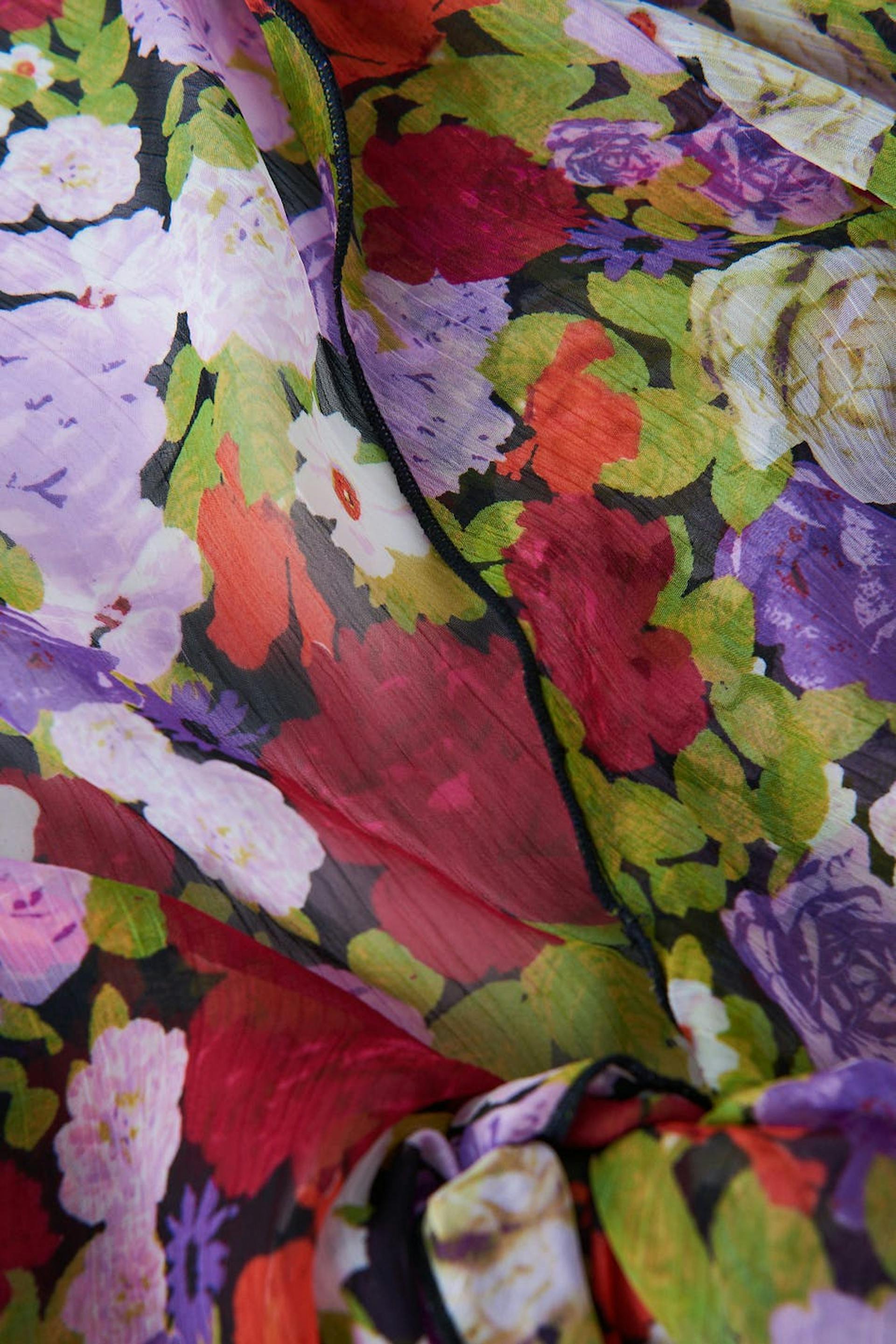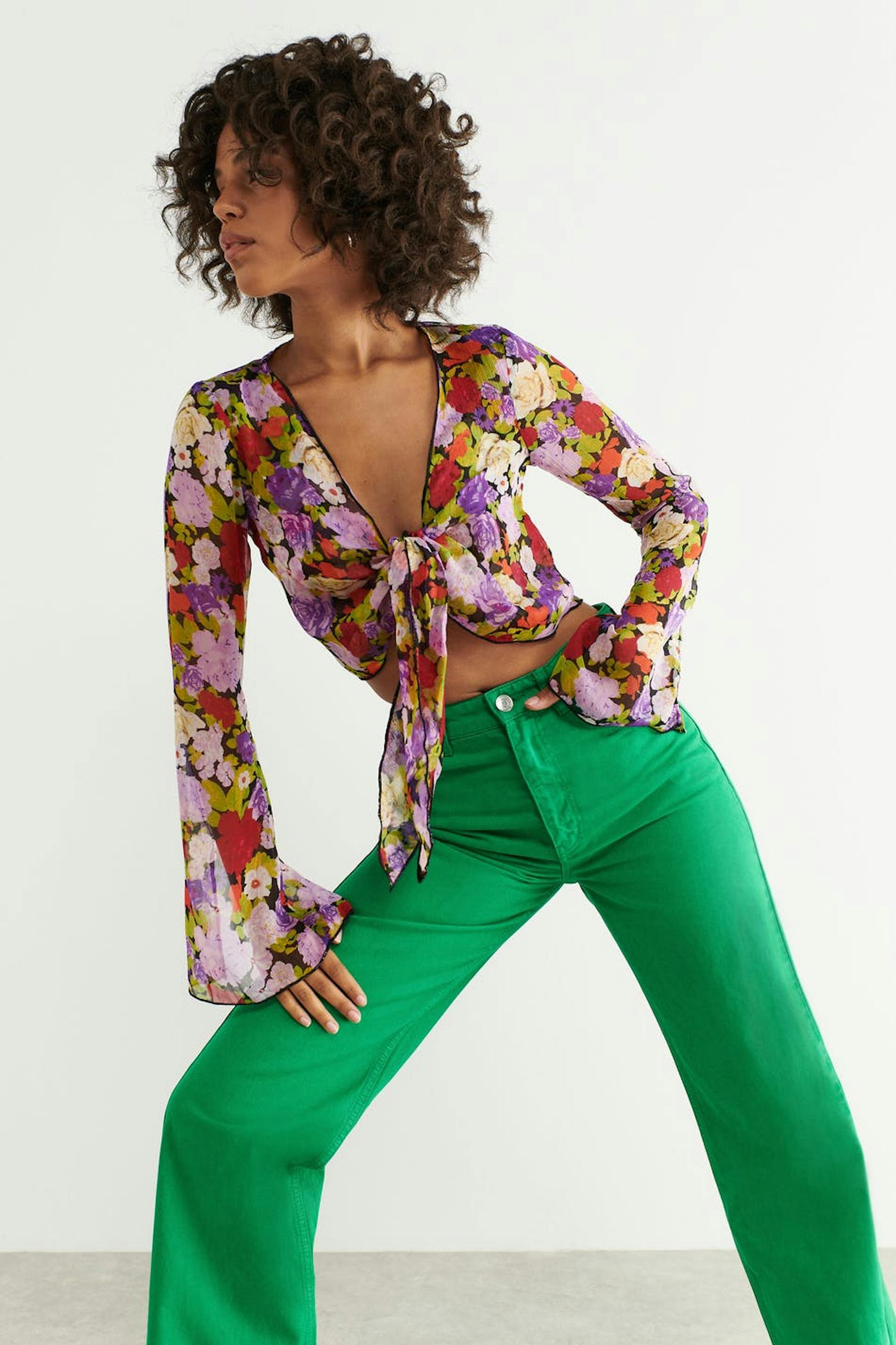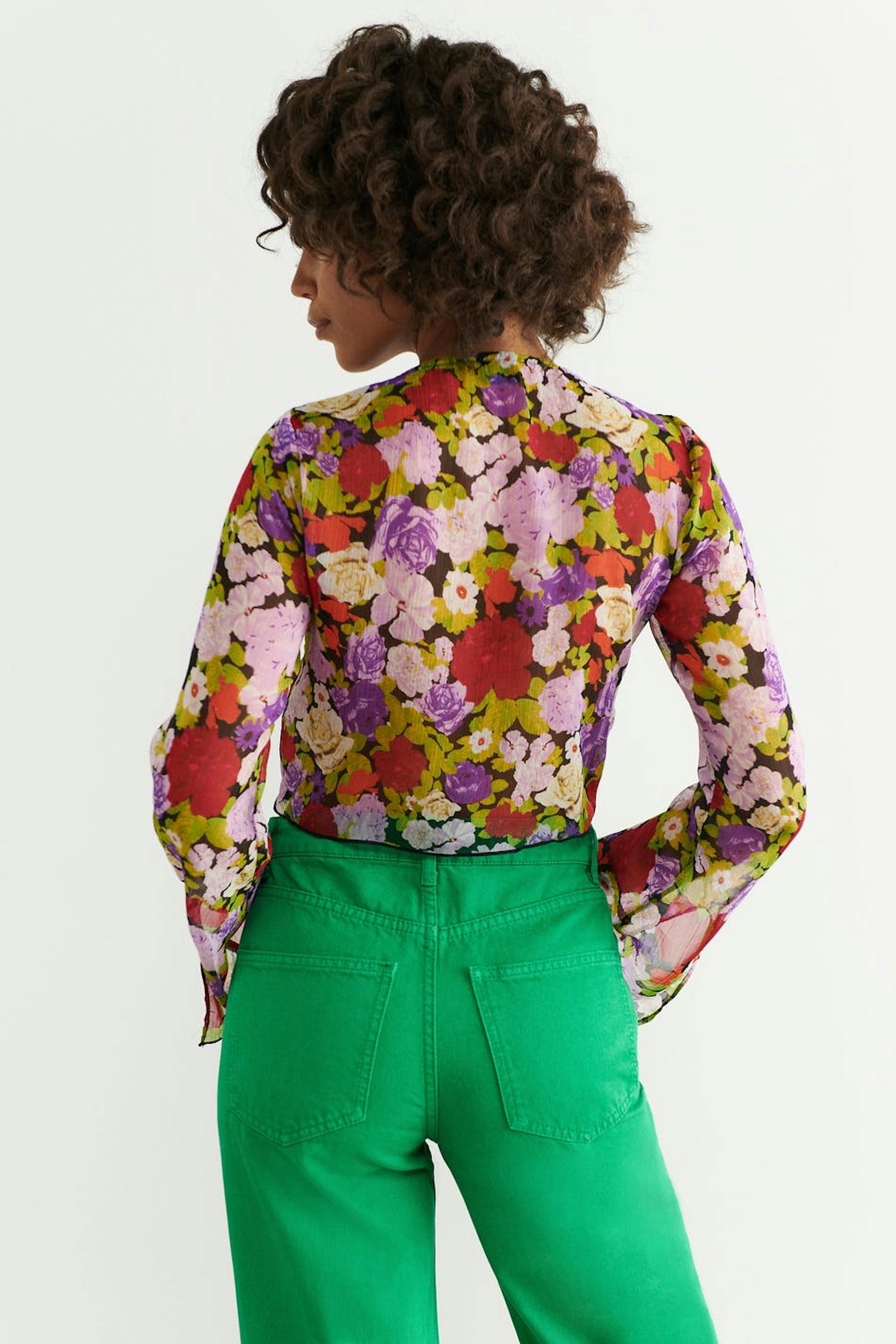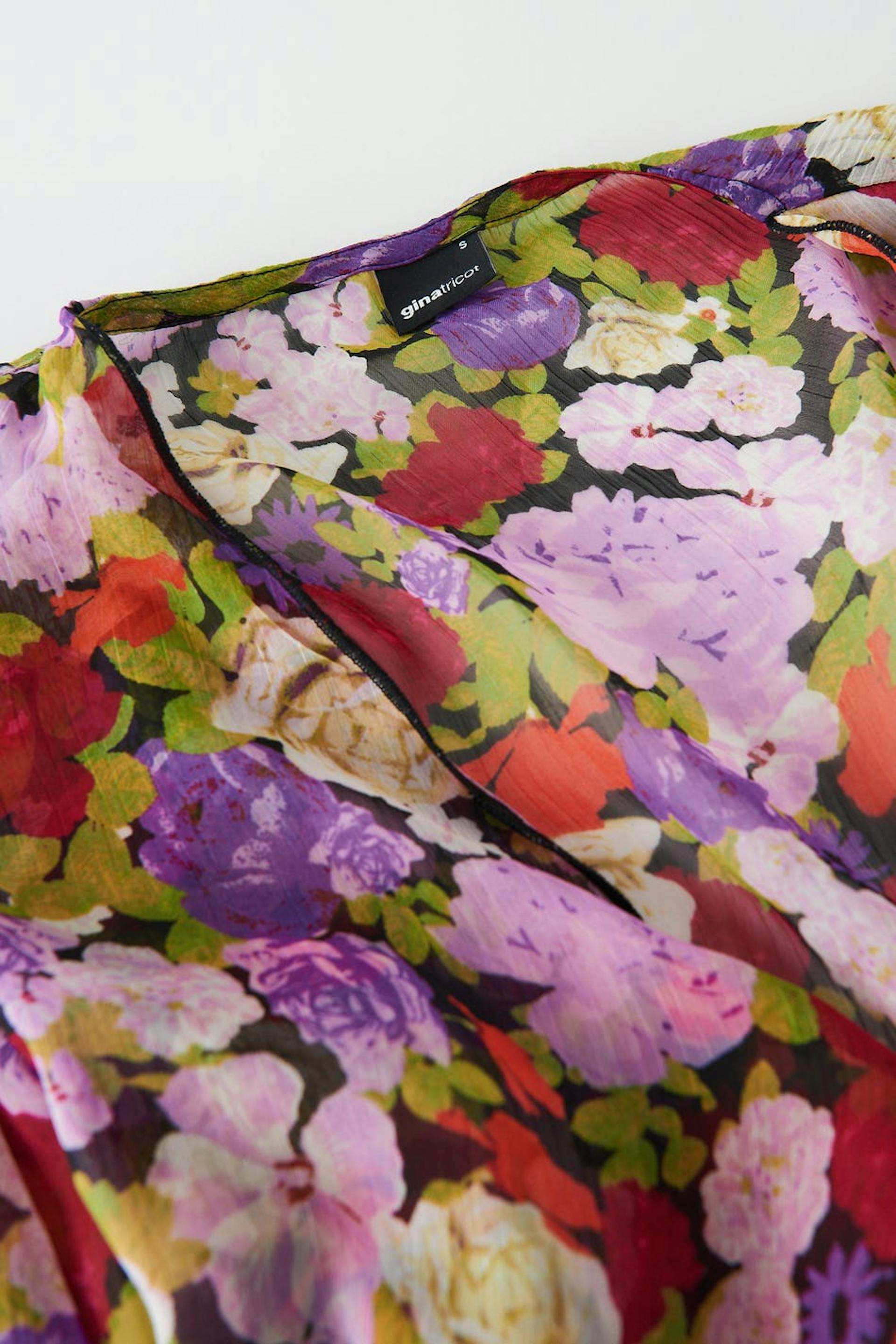 Bloemige blouse met binding aan de hals van chiffon met v-necksnit. De bloes is met lange mouwen, gevlochten en afgesneden. Het heeft knoop sluiting aan de voorzijde en spleet met zelfbinder aan de uiteinden van de mouwen.