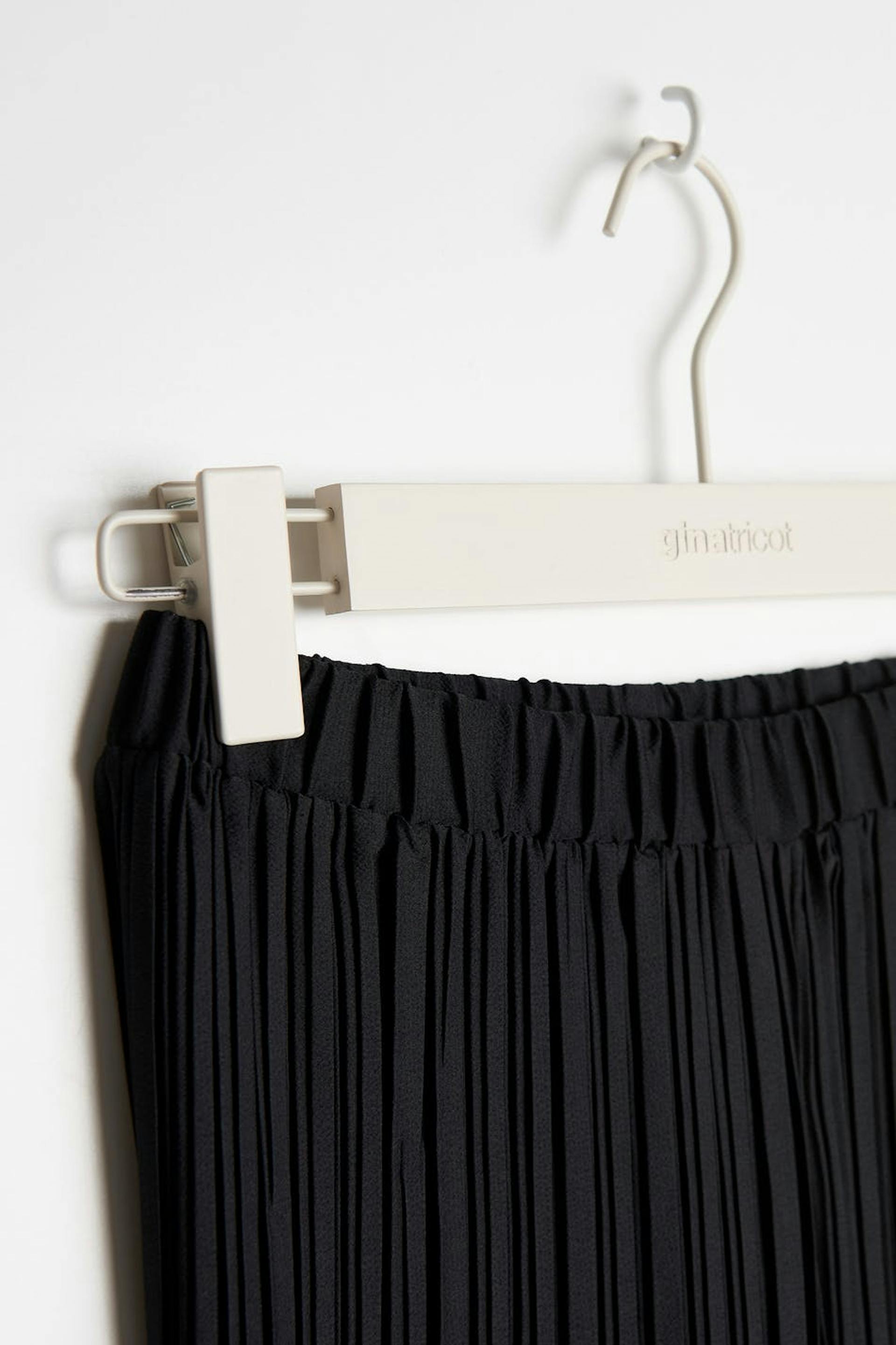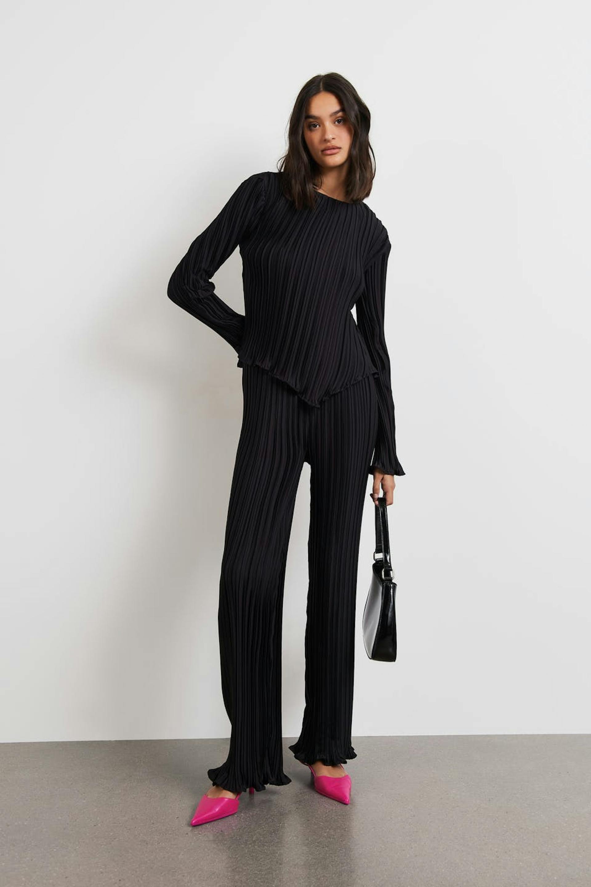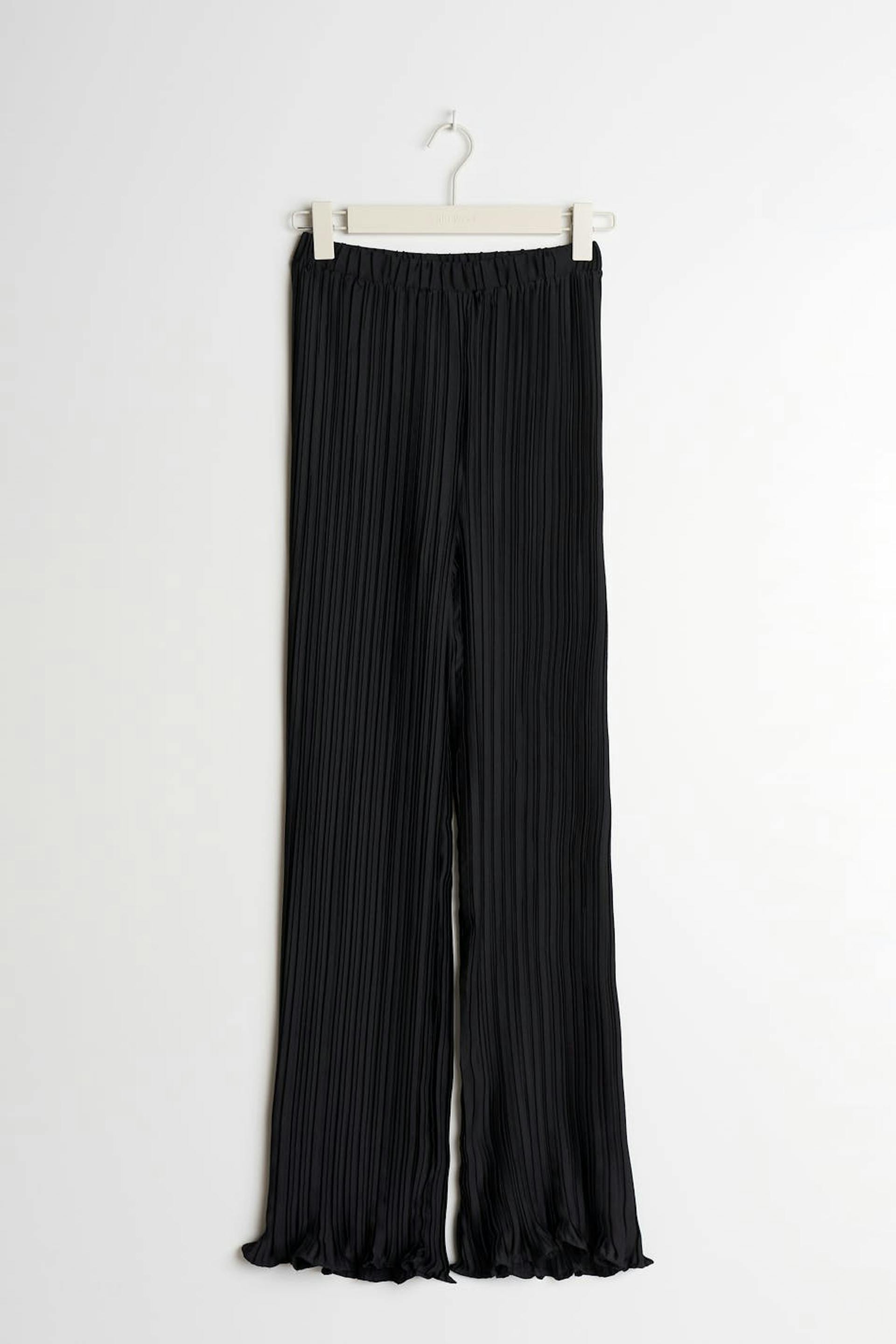 Geplisseerde broeken met een ontspannen pasvorm. De broeken zijn perfect voor het feest en zwart en hebben een zachte elastiek aan de taille. Het heeft rechte broekspijpen en smalle ruches aan het uiteinde van de benen.