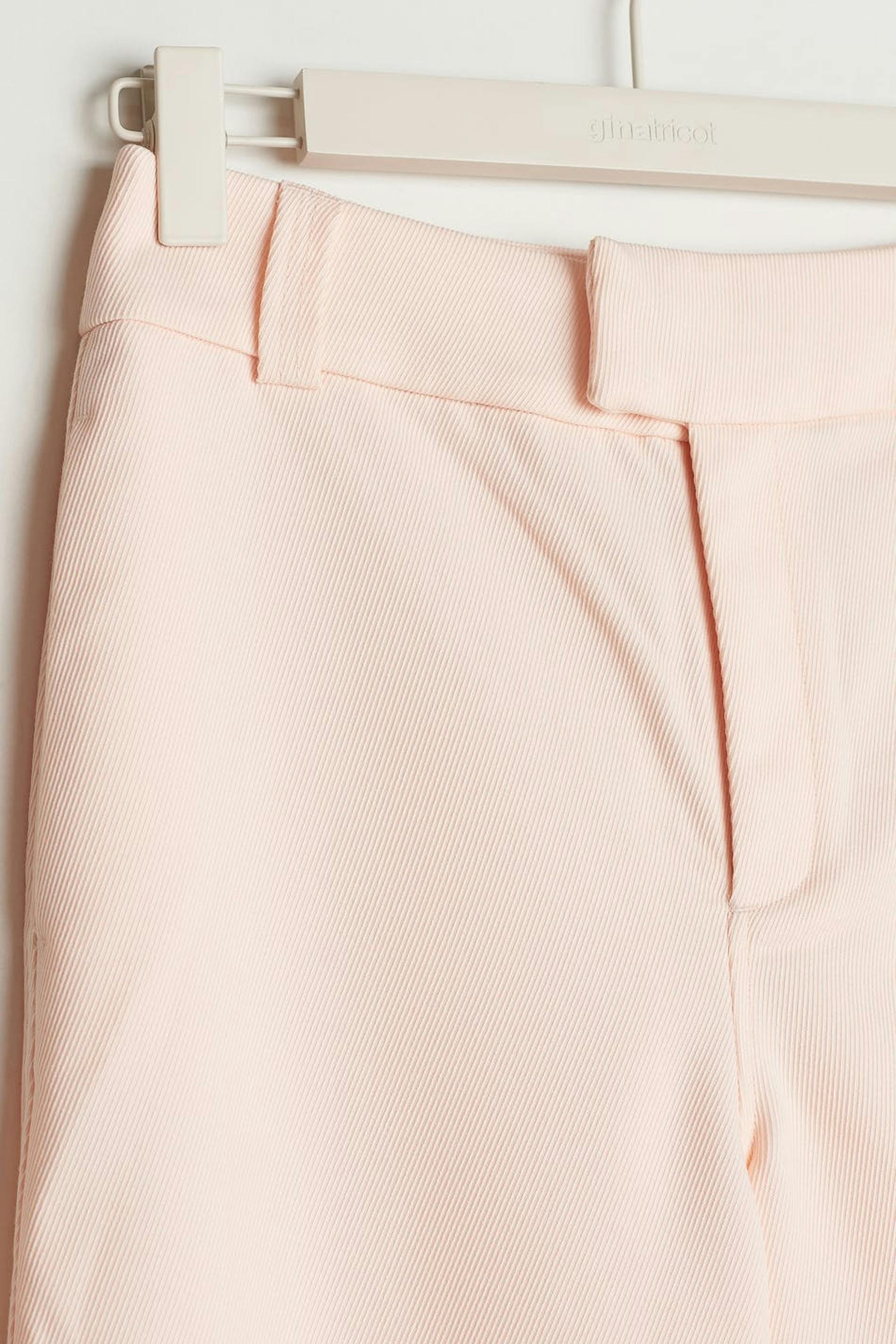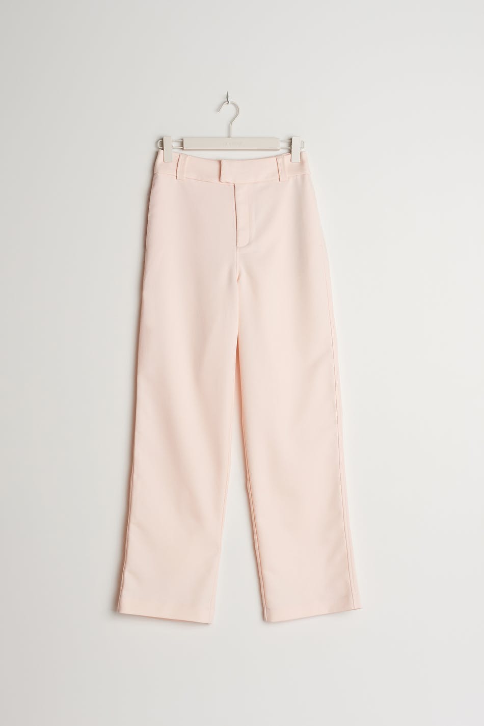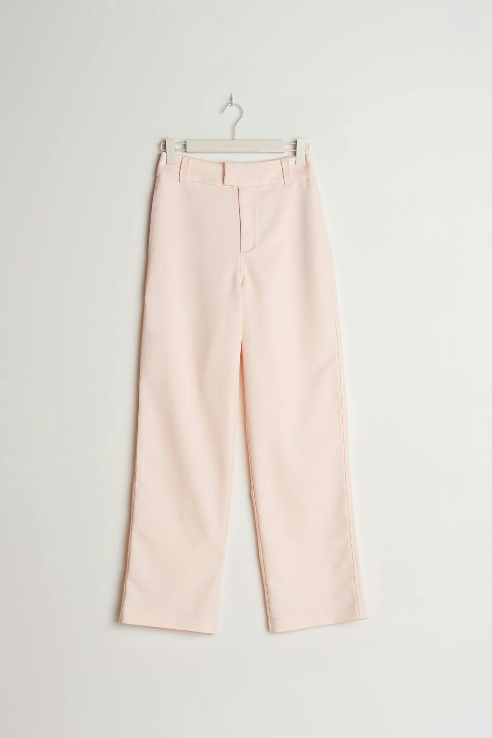 Pantalonnen met een rechte pasvorm. De broeken zijn roze en hebben een keperbinding. Het heeft een hoge taille, een rits met rits, zakken aan de zijkanten, paspelzakken achter en een ceintuur met brede riem lussen.