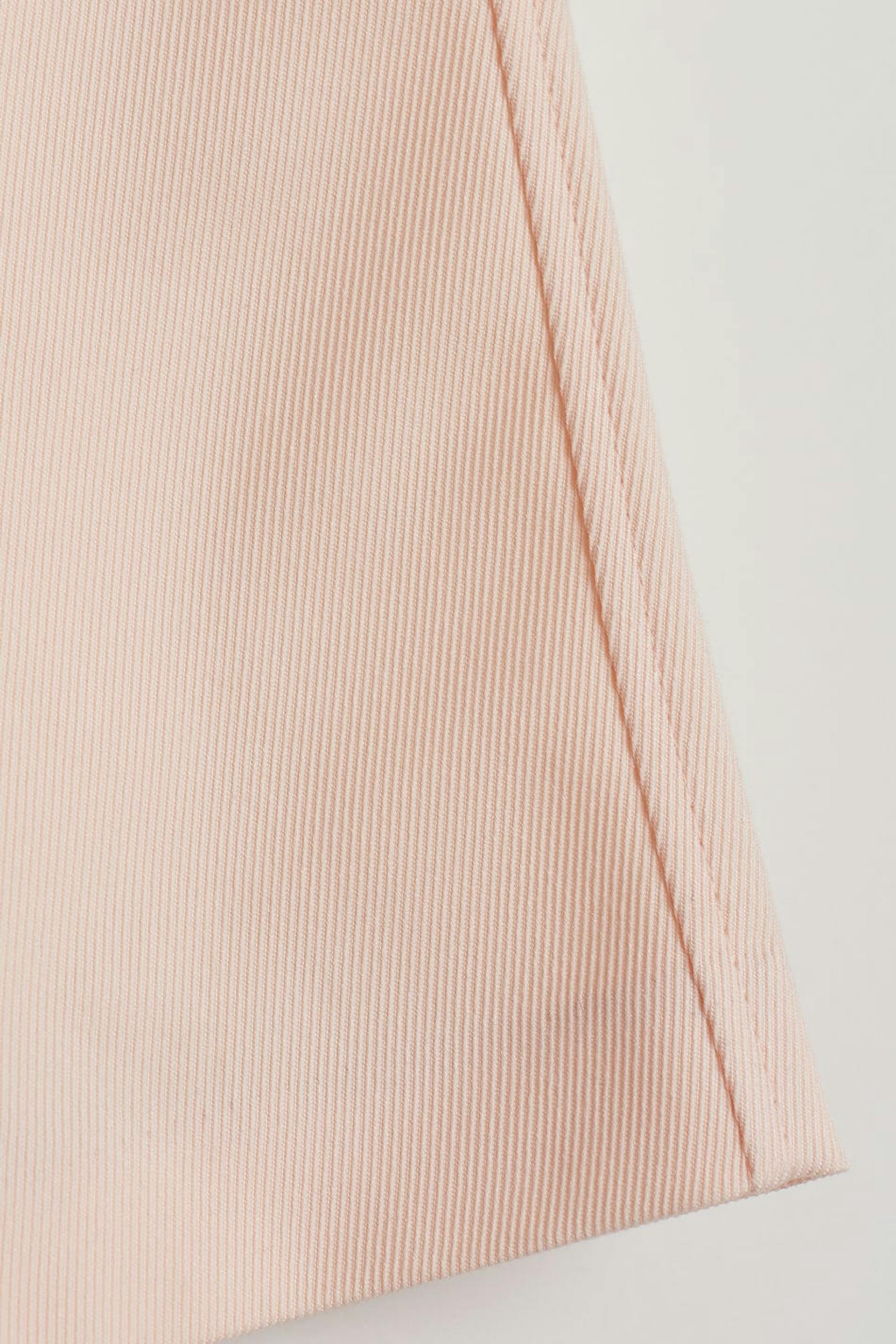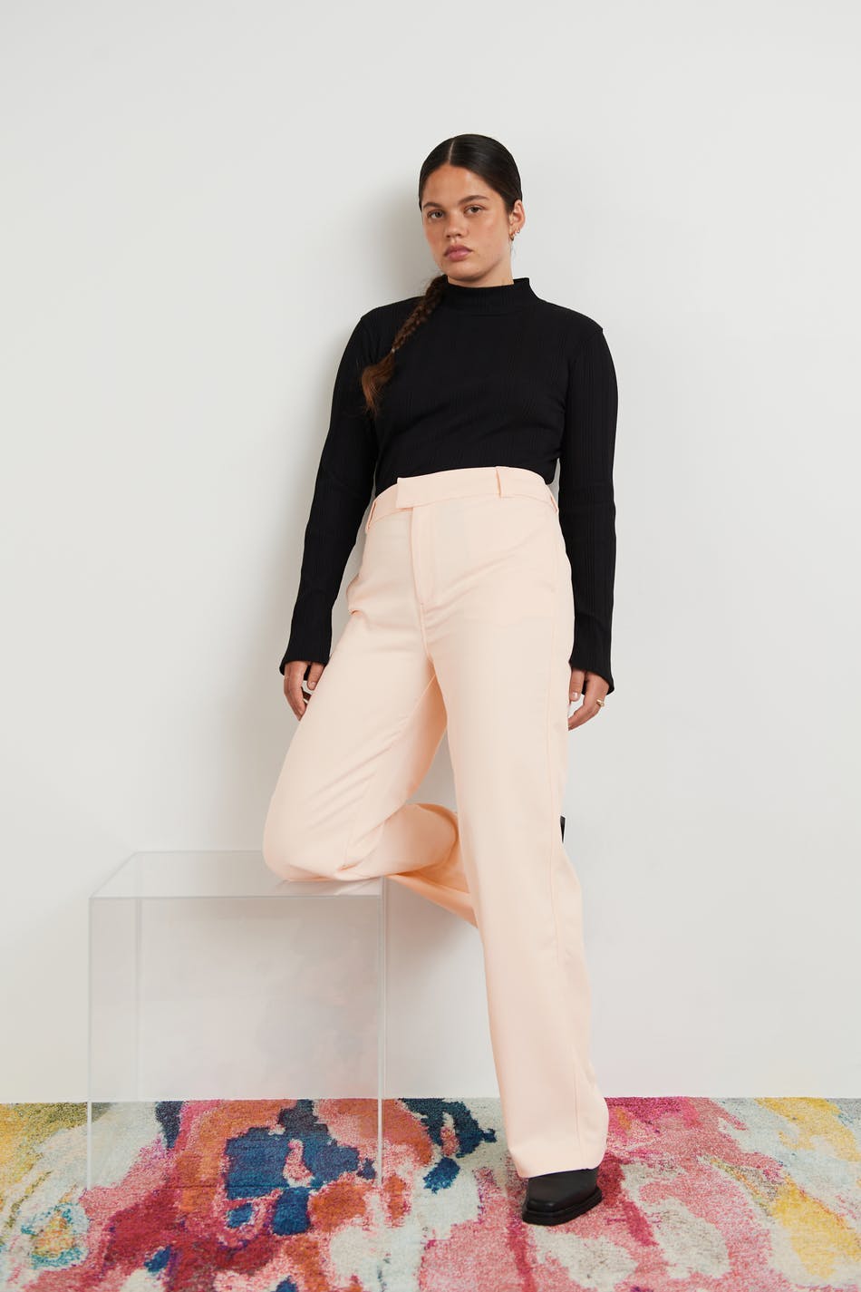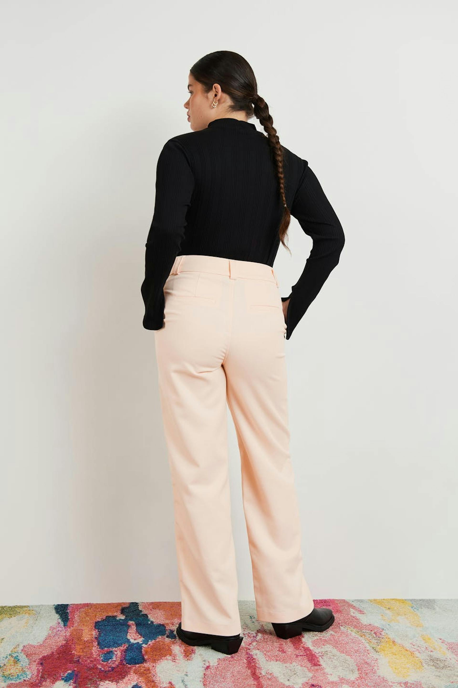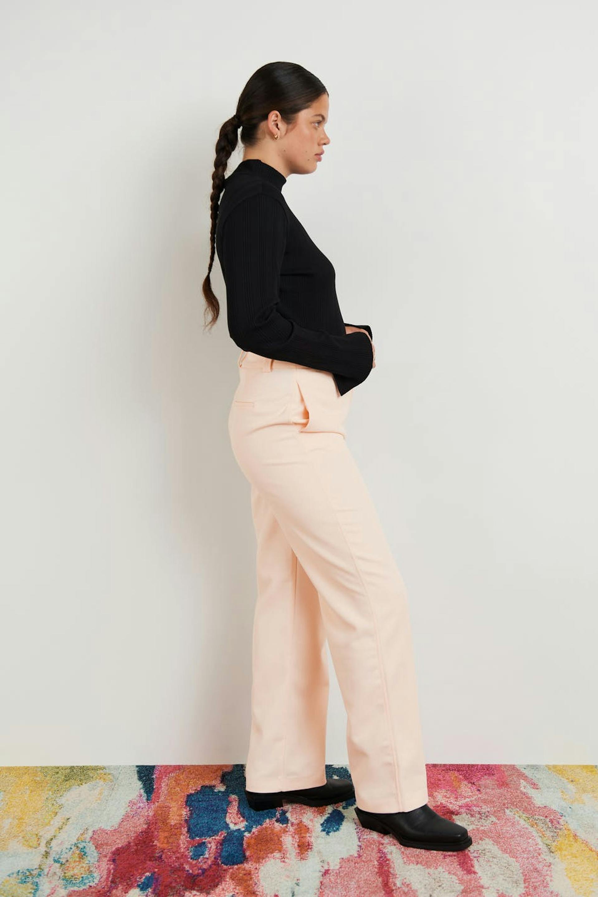 Pantalonnen met een rechte pasvorm. De broeken zijn roze en hebben een keperbinding. Het heeft een hoge taille, een rits met rits, zakken aan de zijkanten, paspelzakken achter en een ceintuur met brede riem lussen.