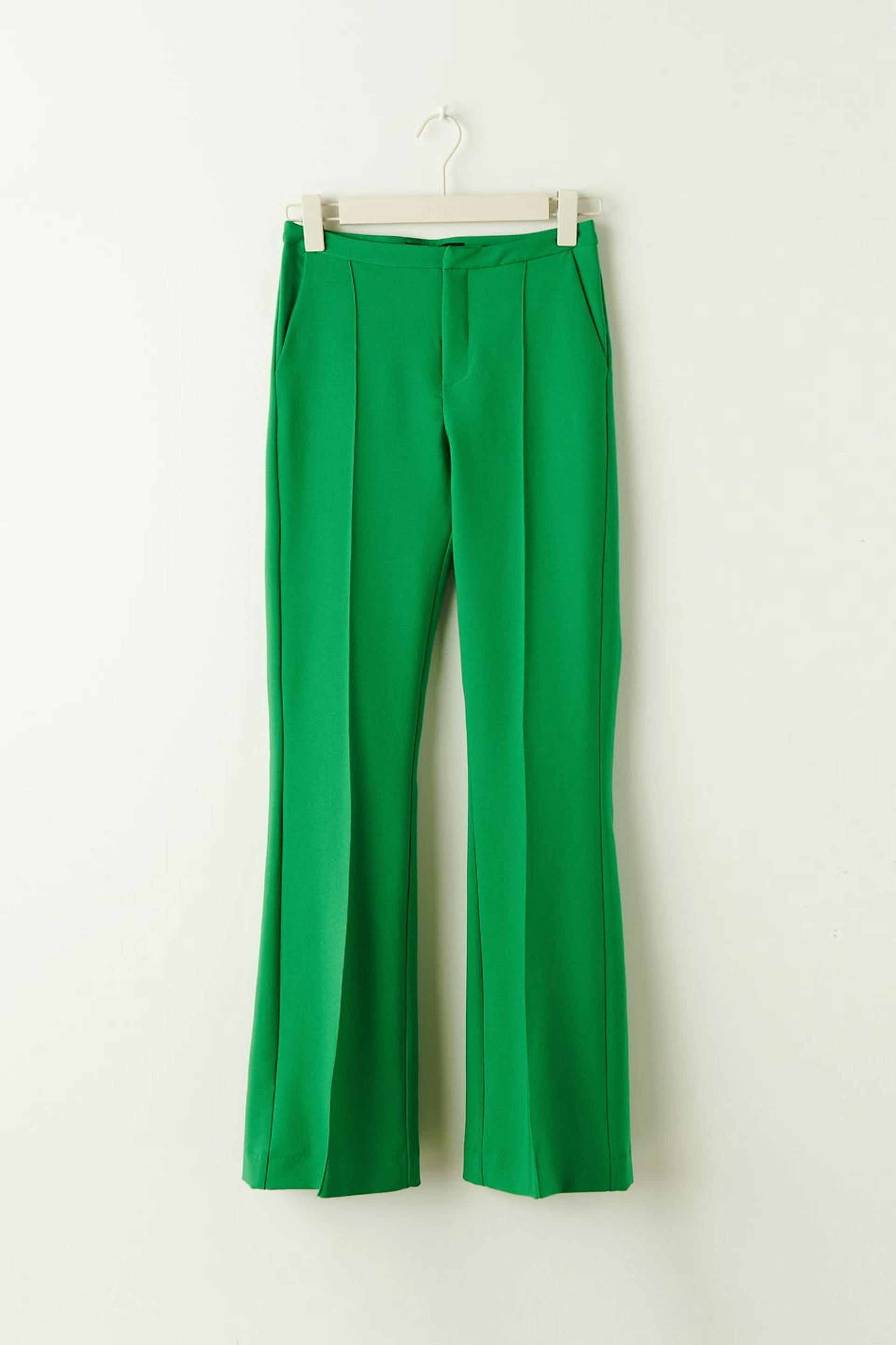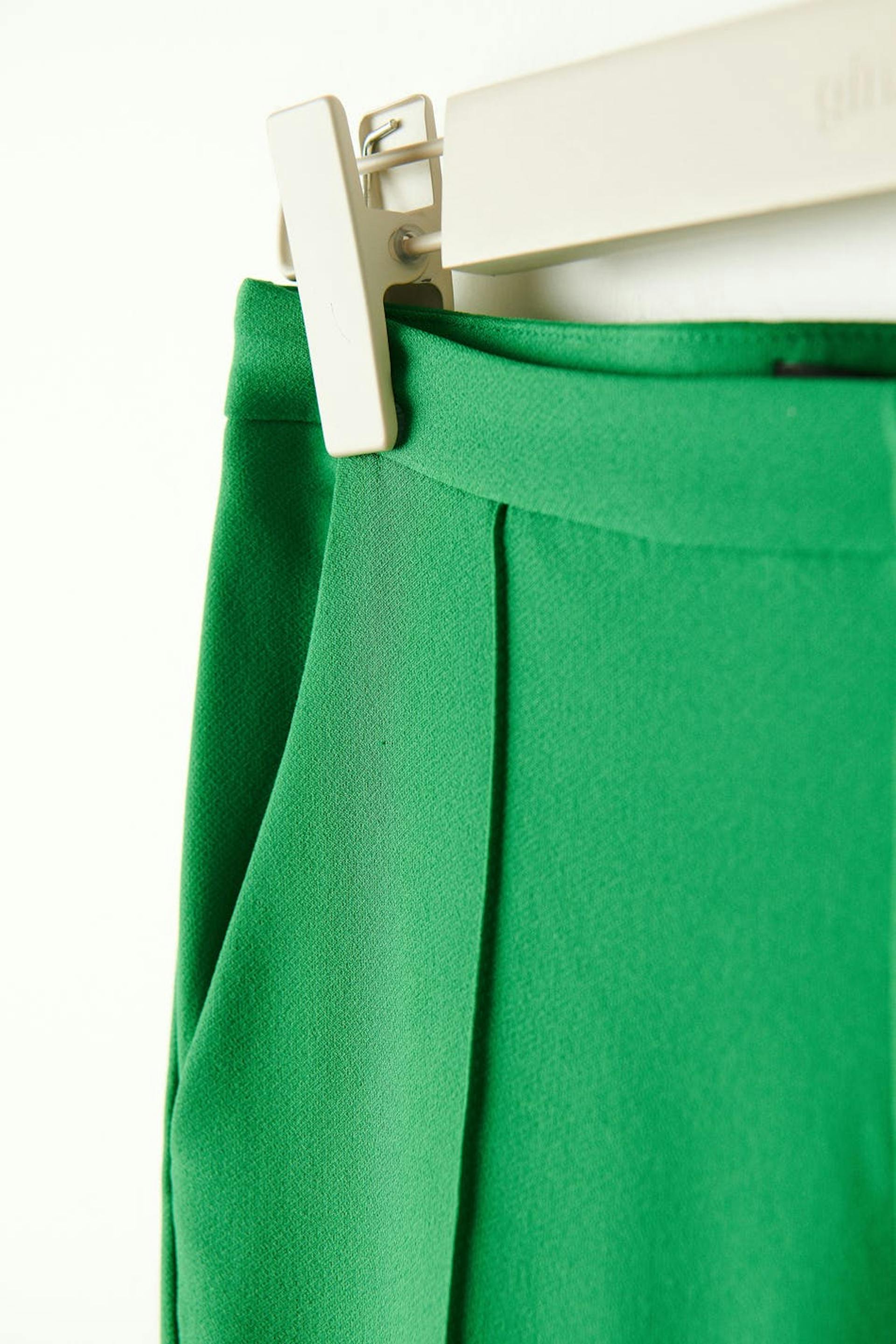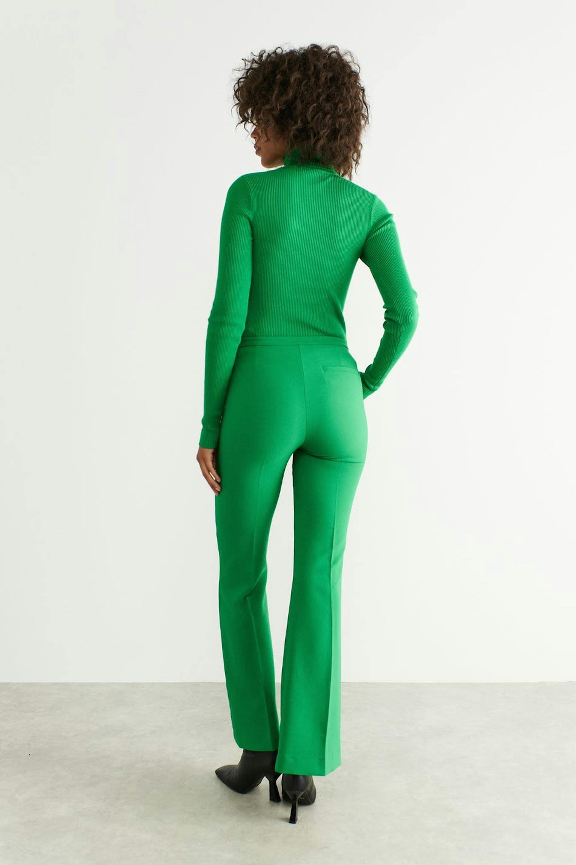 Elastische broeken met hoge taille. De broeken zijn groen en hebben een slanke pasvorm. Het heeft afgesneden benen, valse zakken op het achterpand, gulp en spleet aan de zoom.
