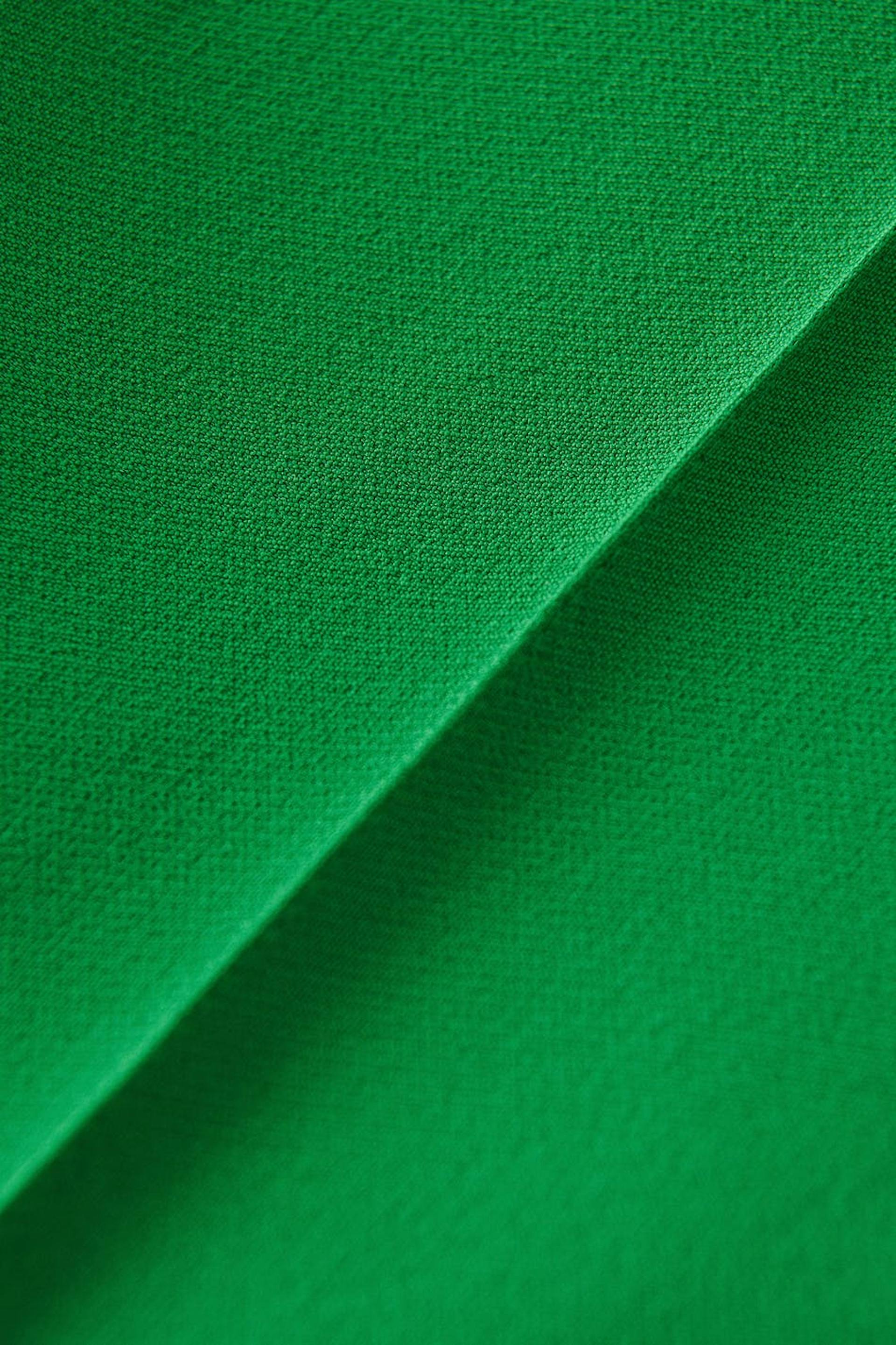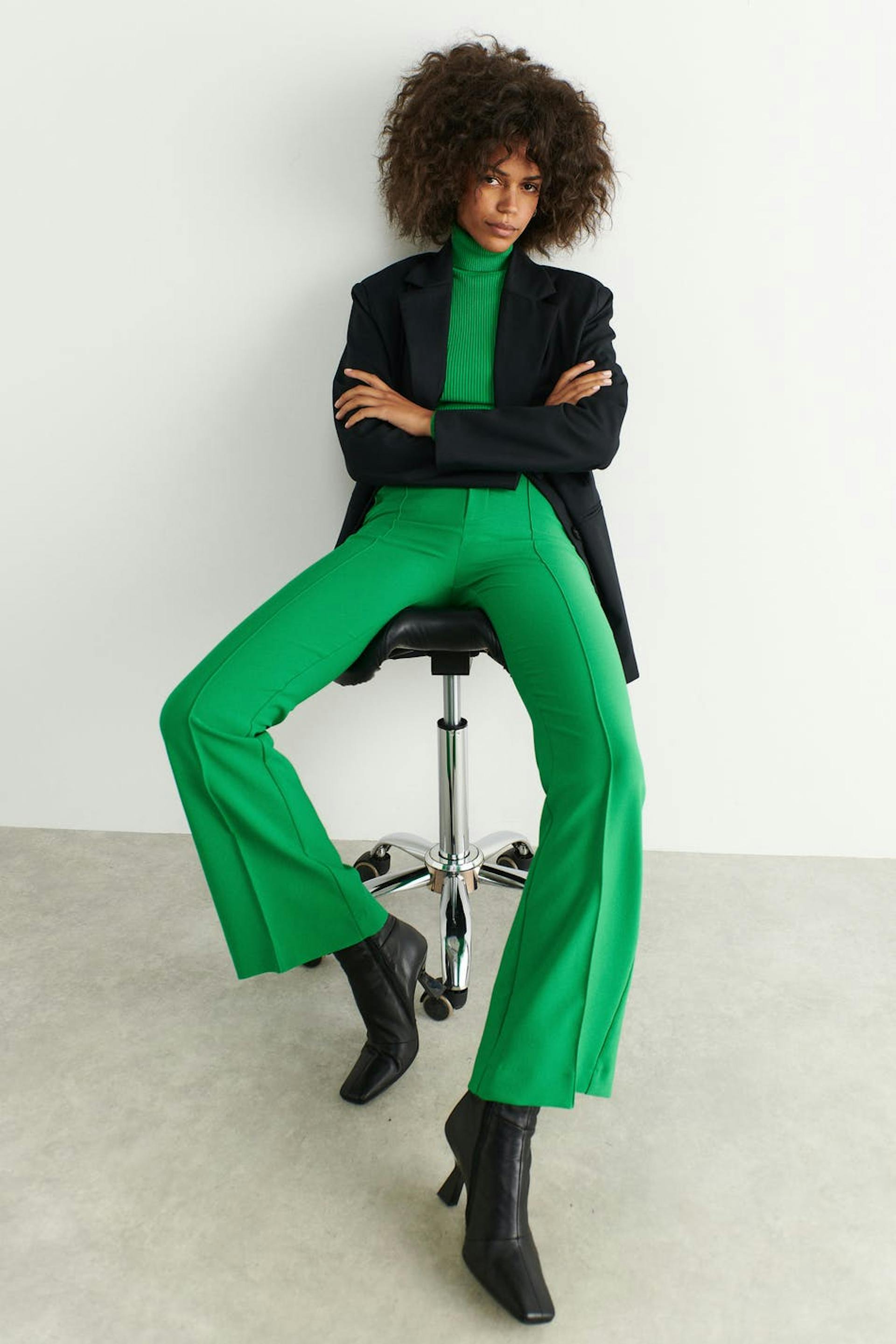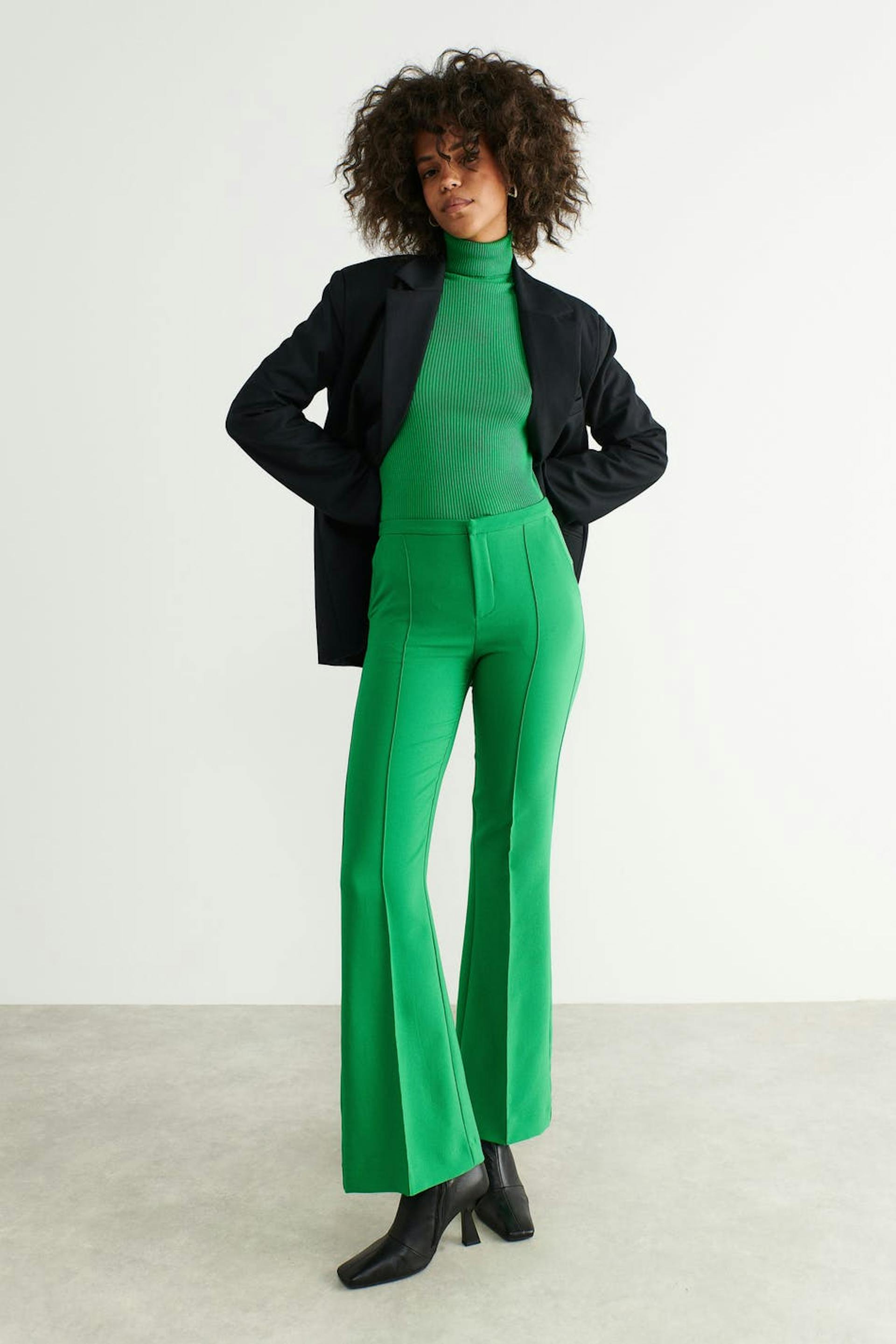 Elastische broeken met hoge taille. De broeken zijn groen en hebben een slanke pasvorm. Het heeft afgesneden benen, valse zakken op het achterpand, gulp en spleet aan de zoom.