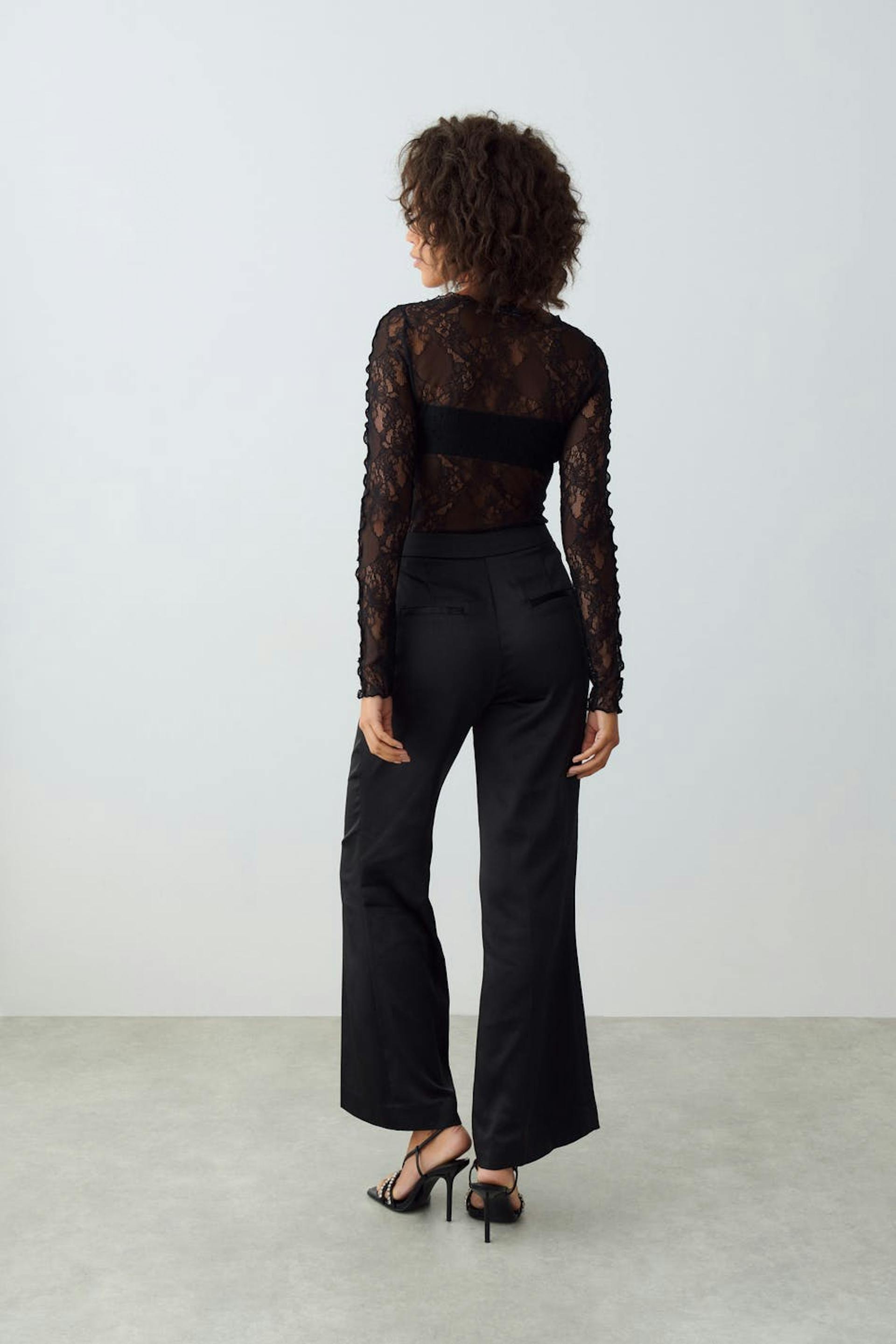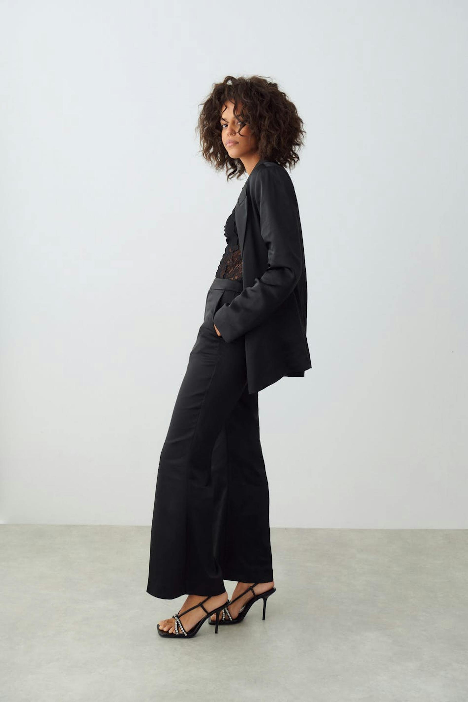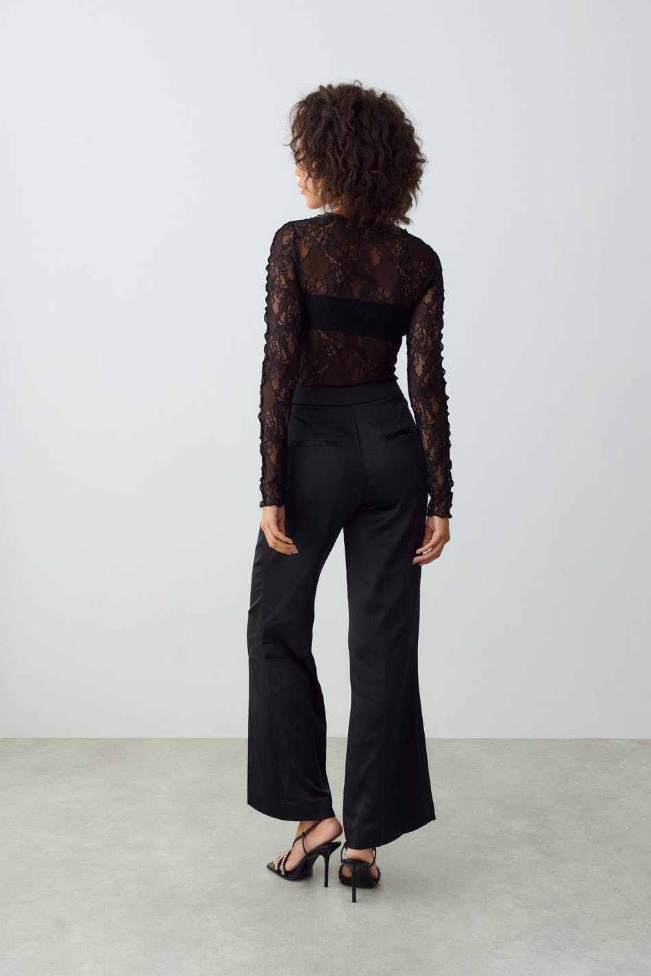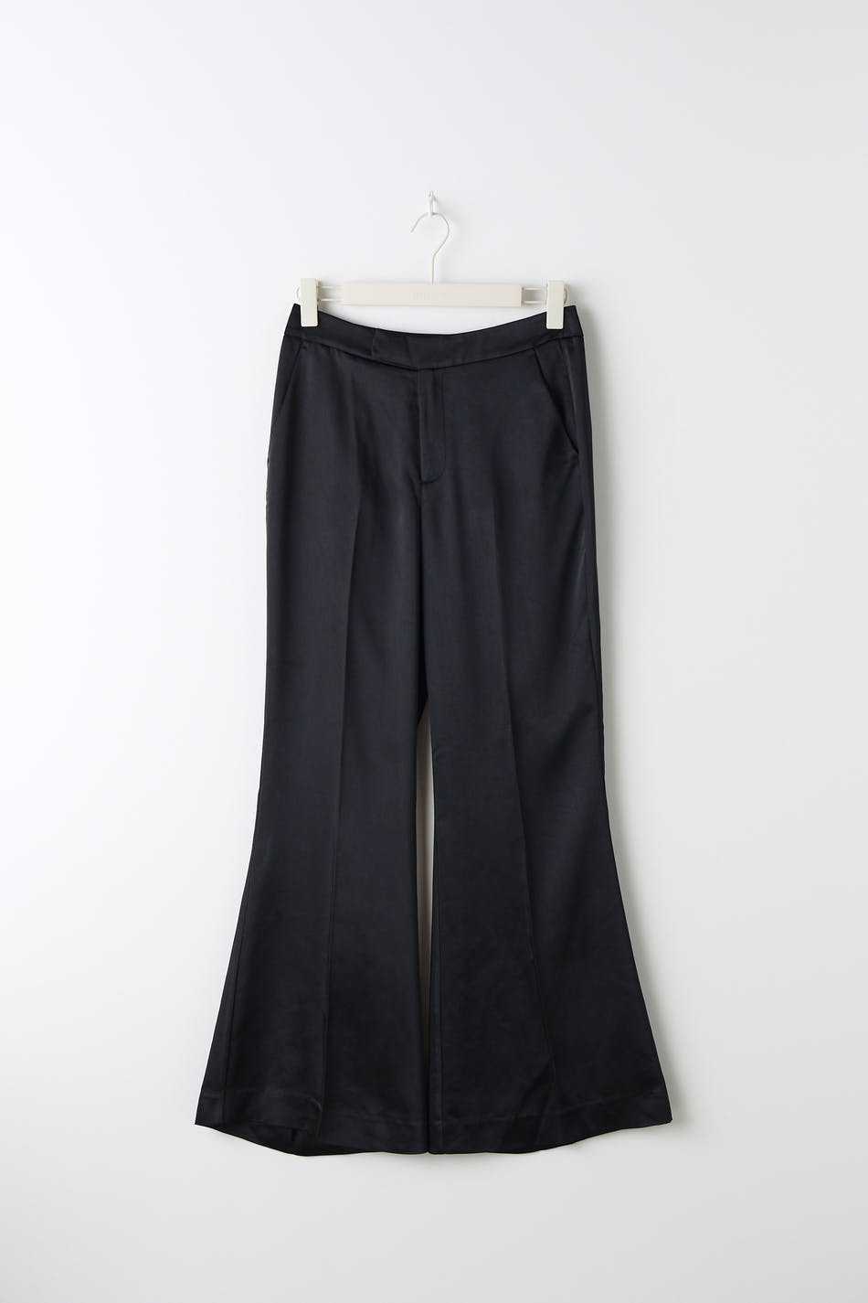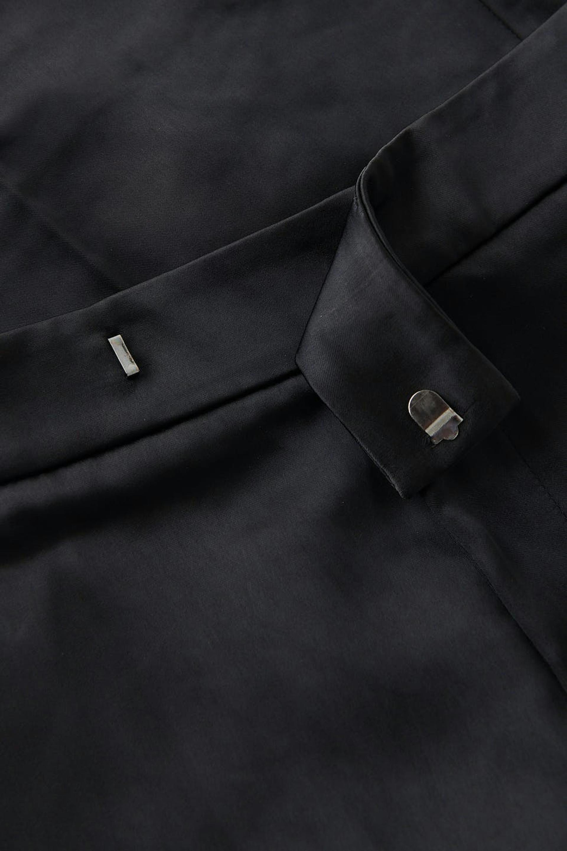 Kostuumbroeken van satijn met onafgewerkte randen. De broeken zijn zwart en hebben gulp met verborgen knoop. Het heeft zijzakken, paspelzakken op het achterpand, ceintuur met riemlussen en lange beenlengte.