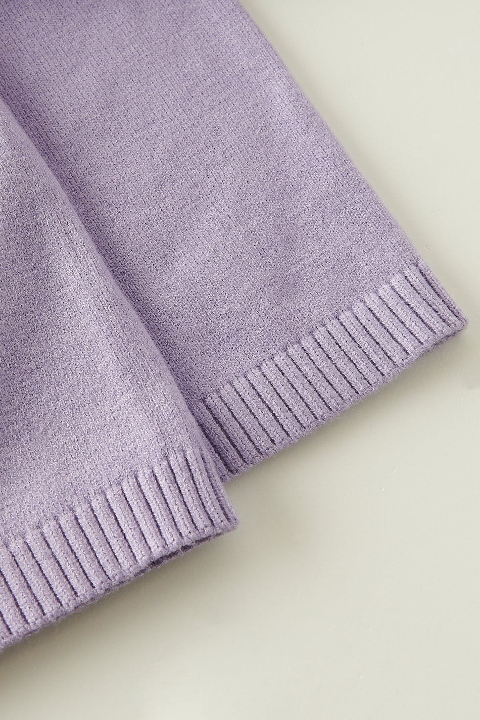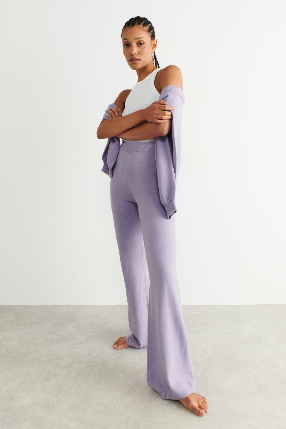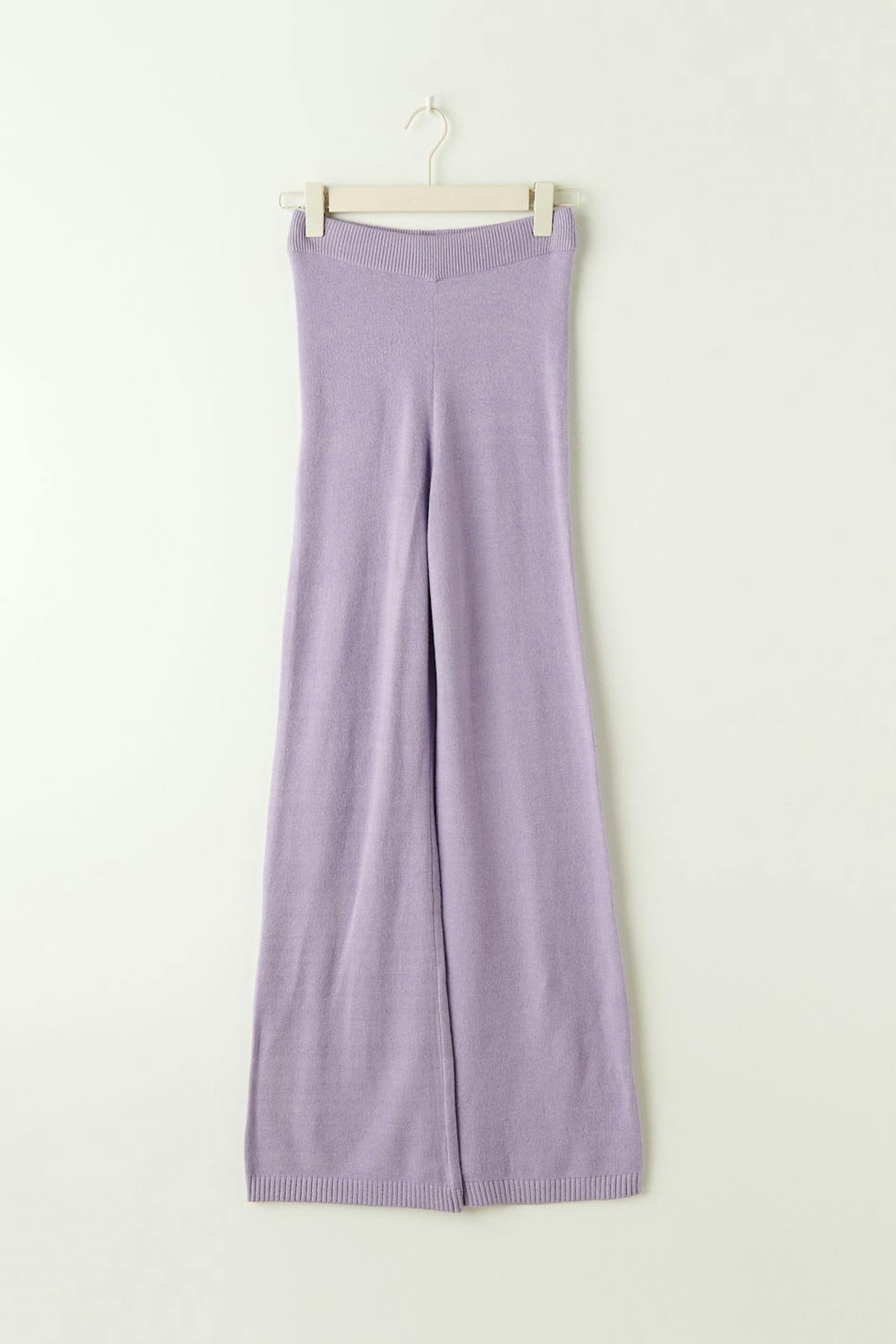 Zacht gebreide broeken met nauwsluitend taille. De broeken zijn paars en hebben onafgewerkte randen met ruimvallende stijl. Het heeft geribde zoom en elastiek aan de taille.