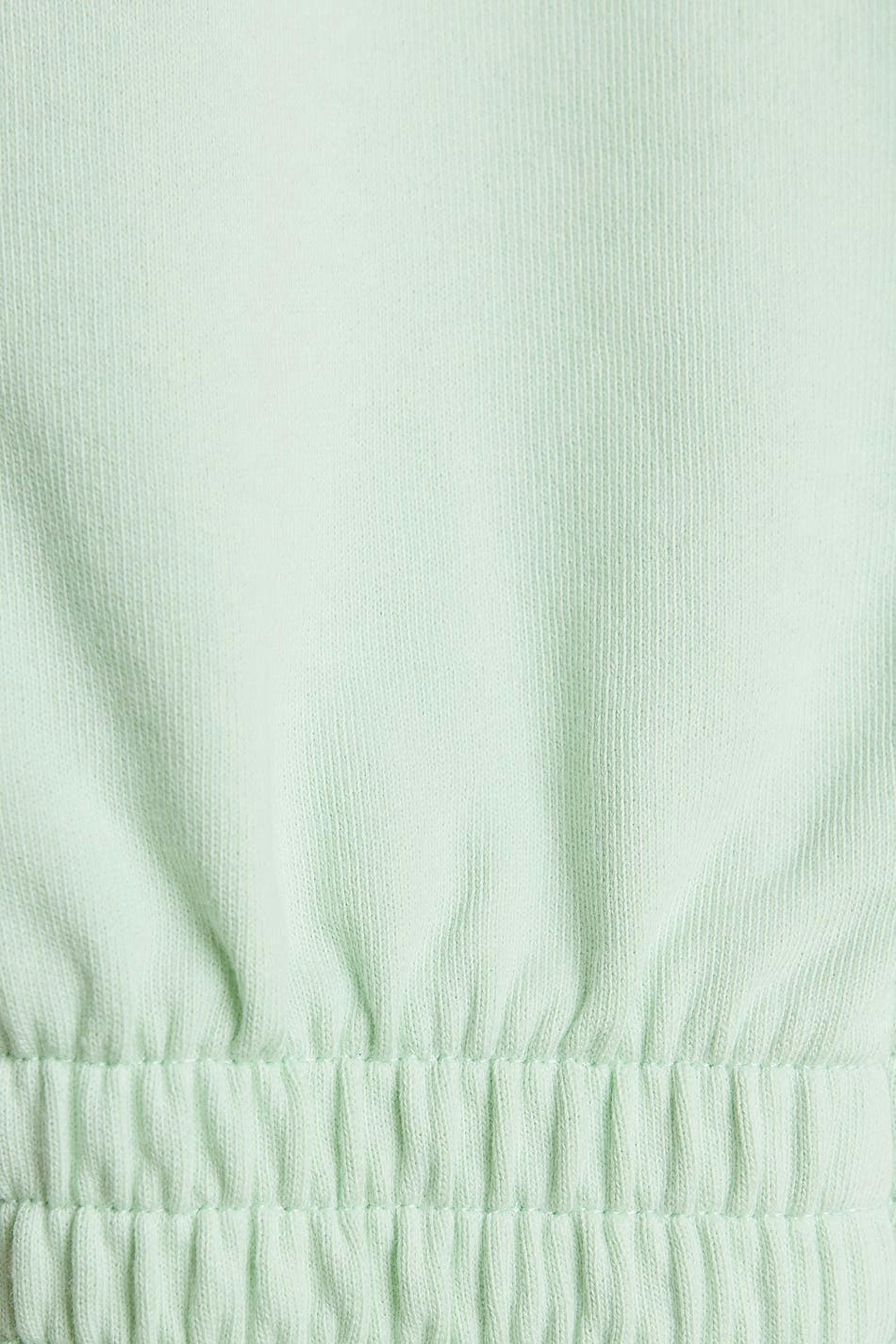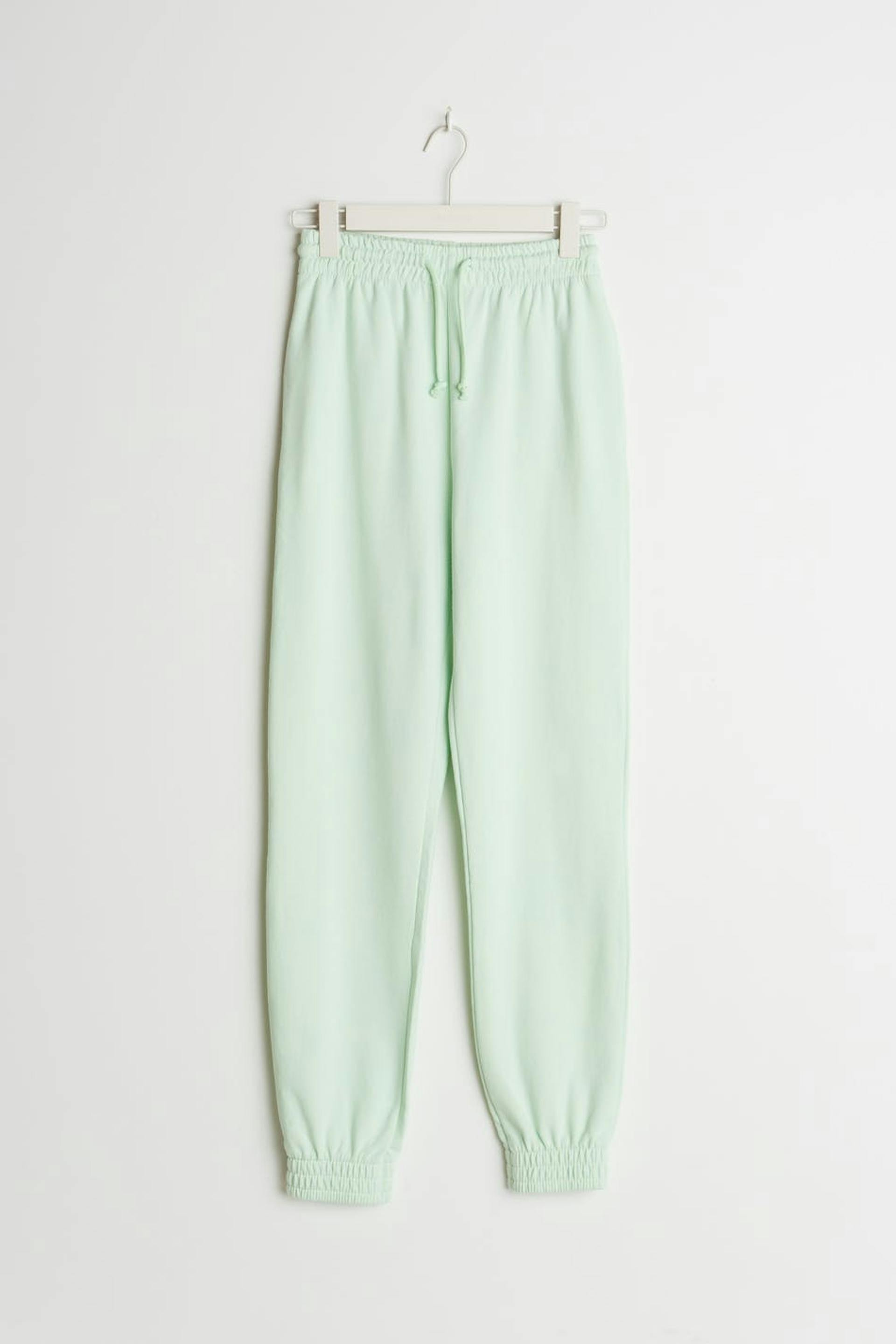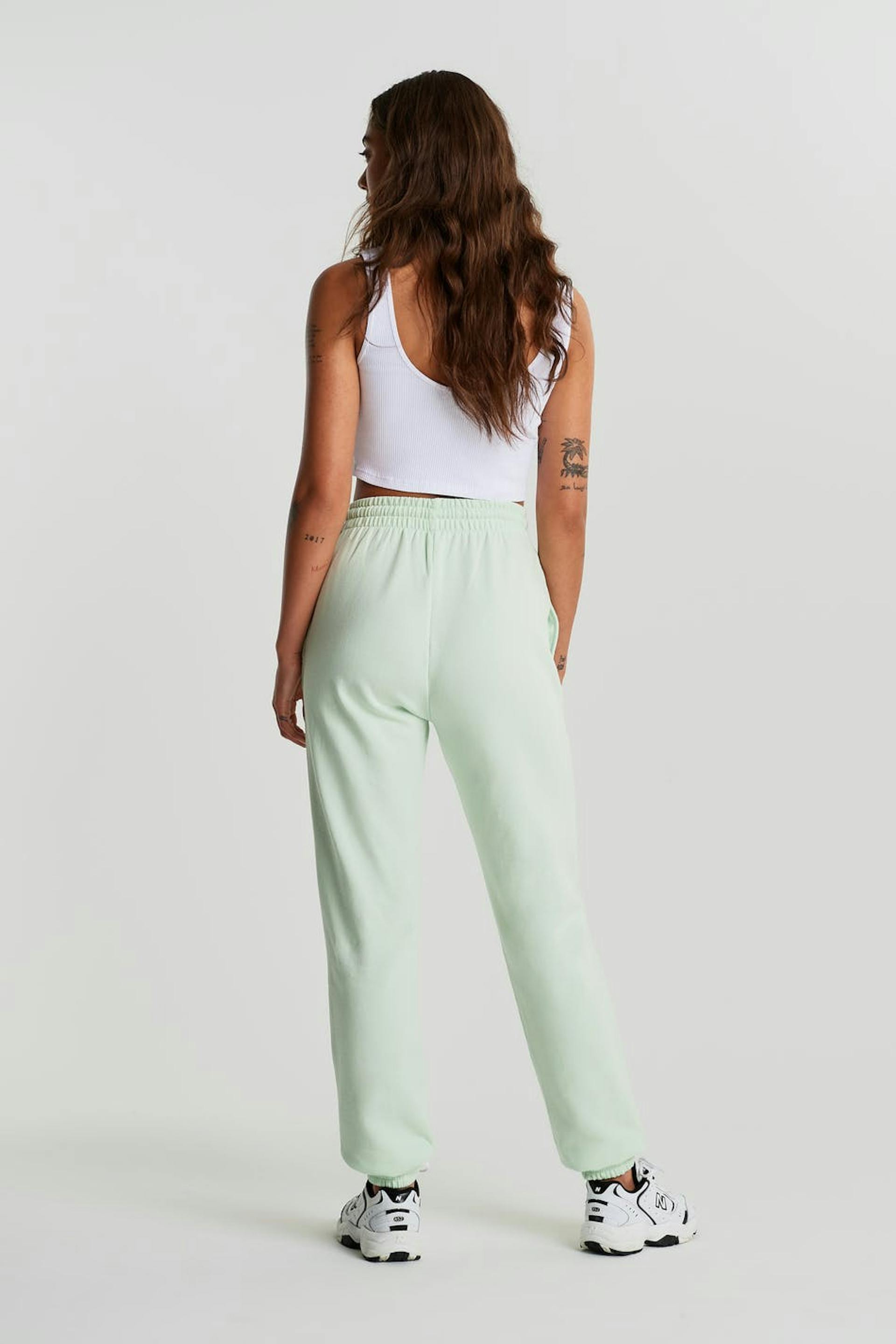 Joggingbroeken met een normale pasvorm. De broeken zijn muntgroen en hebben een elastiek aan de taille en aan het uiteinde van de benen. Het heeft zakken aan de zijkanten en een daskoord aan de taille.