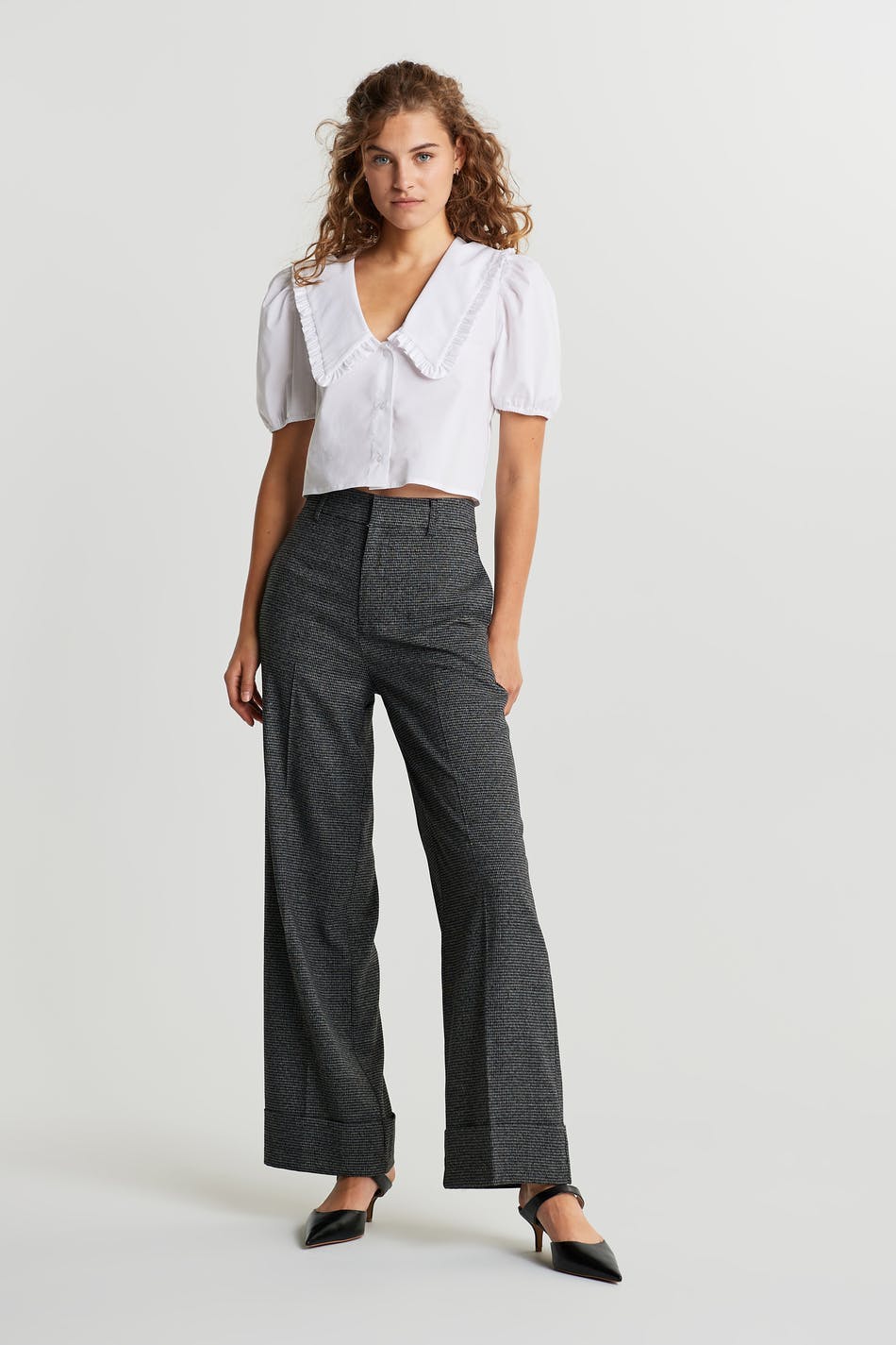 High waisted trousers with wide legs, fold and stitch at bottom edge. Crease front and back. Weltpocket back, pockets at sides Supplier: Nantong D&J Fashion Co, Limited Production Unit: Yanzhou D&J Fashion Co Ltd