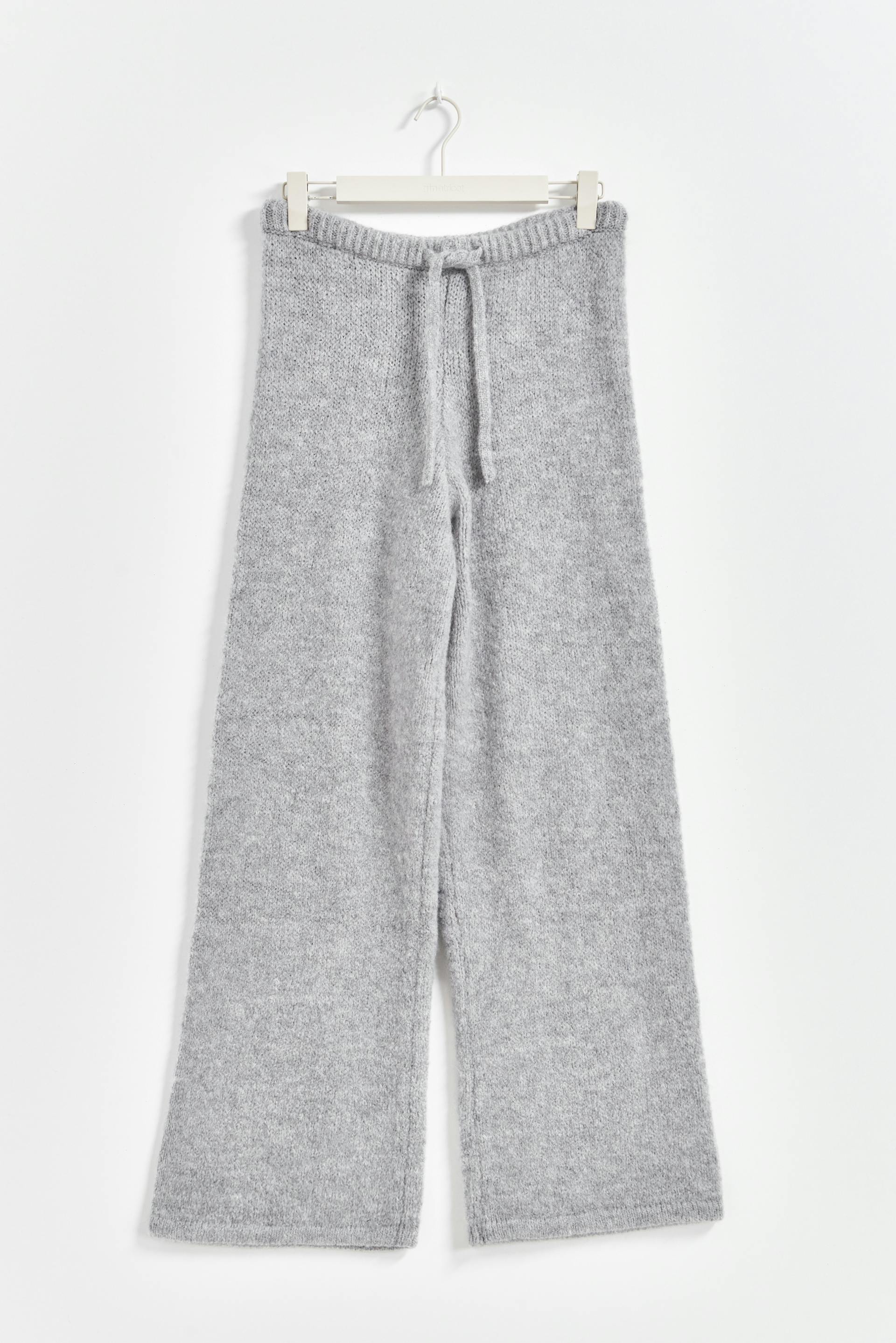Gebreide broeken met hoge taille. De broeken zijn grijs en hebben zelfbinder aan de taille. Het heeft rechte pijpen en normale pasvorm.