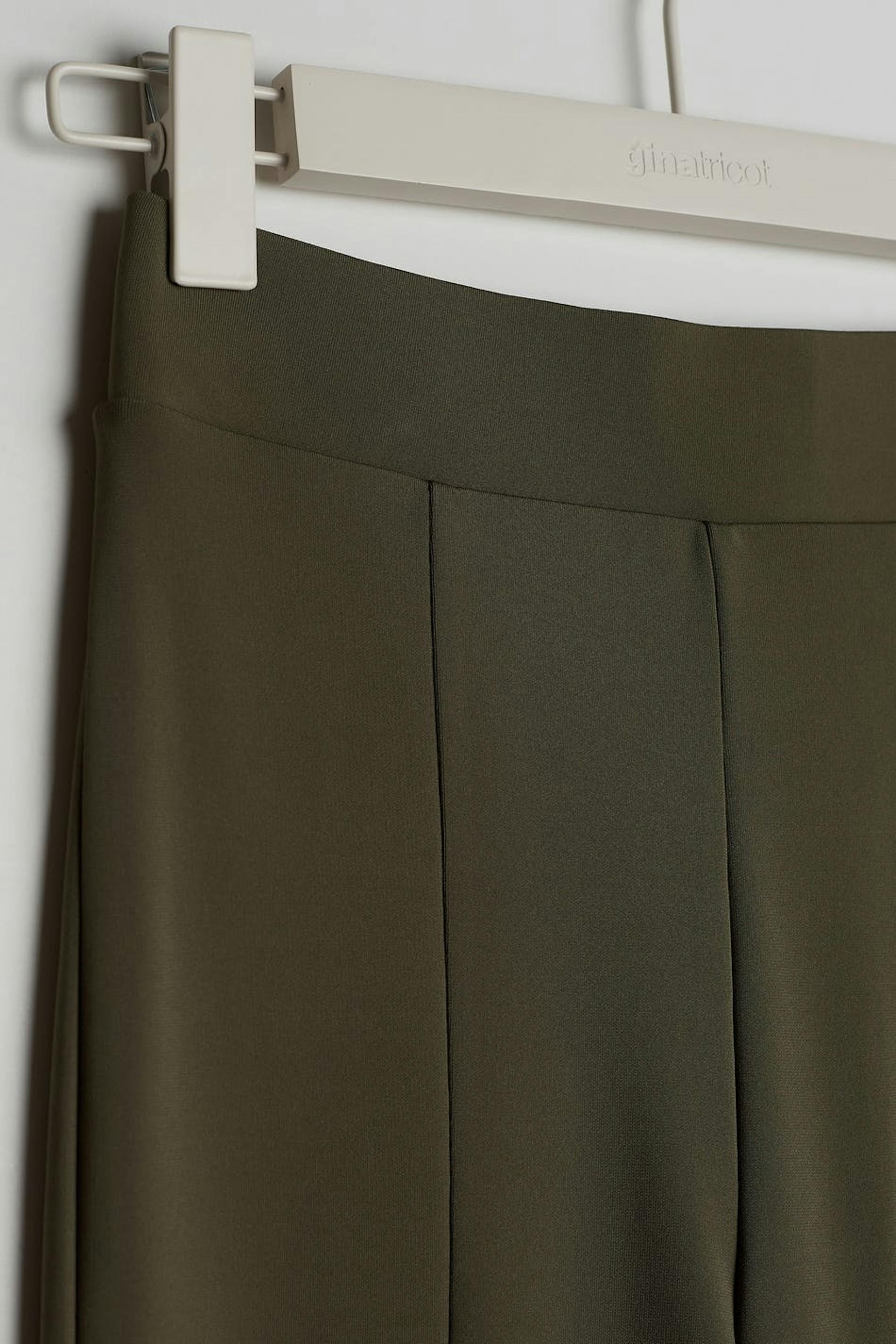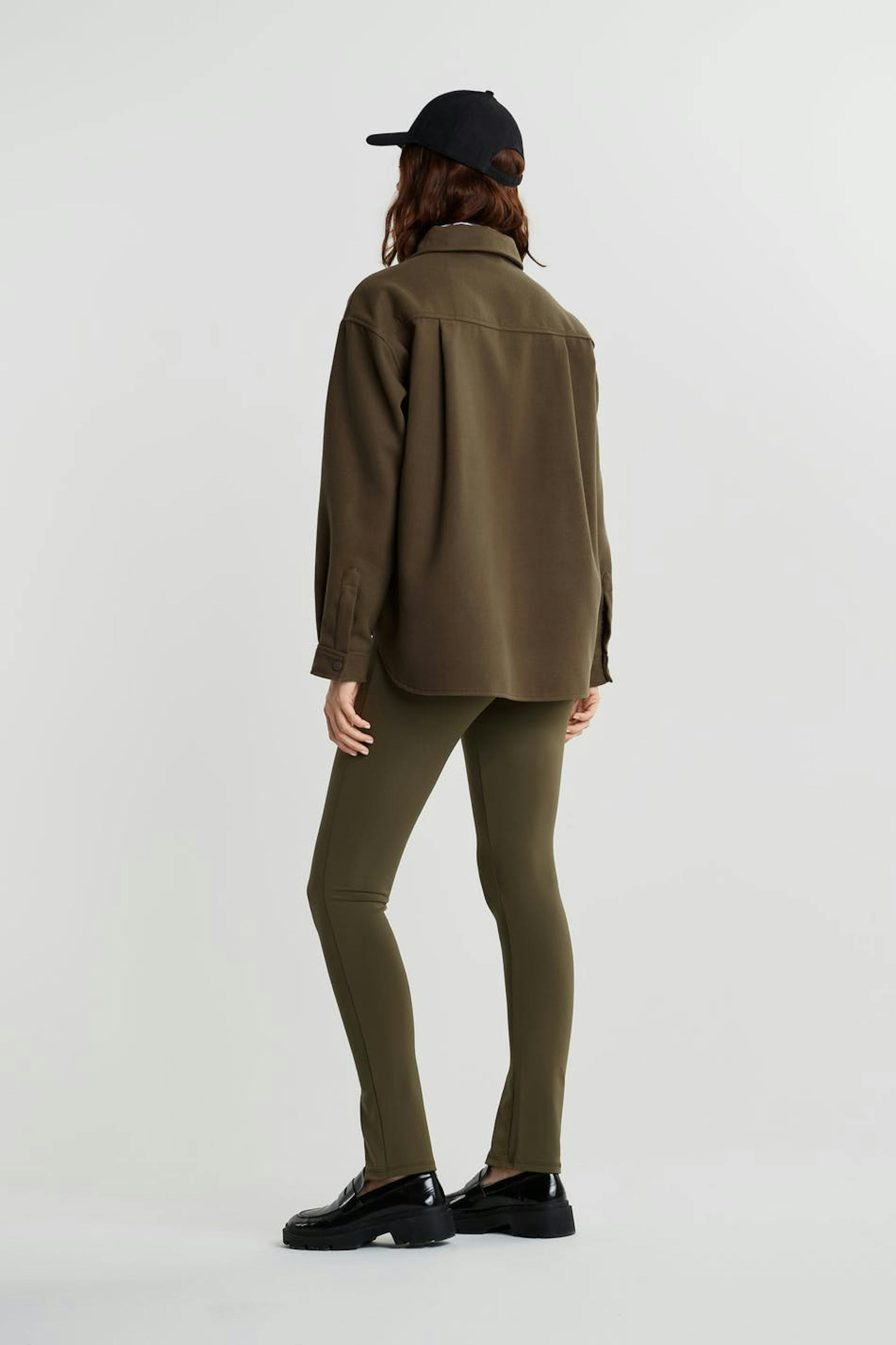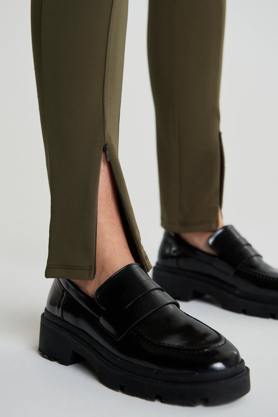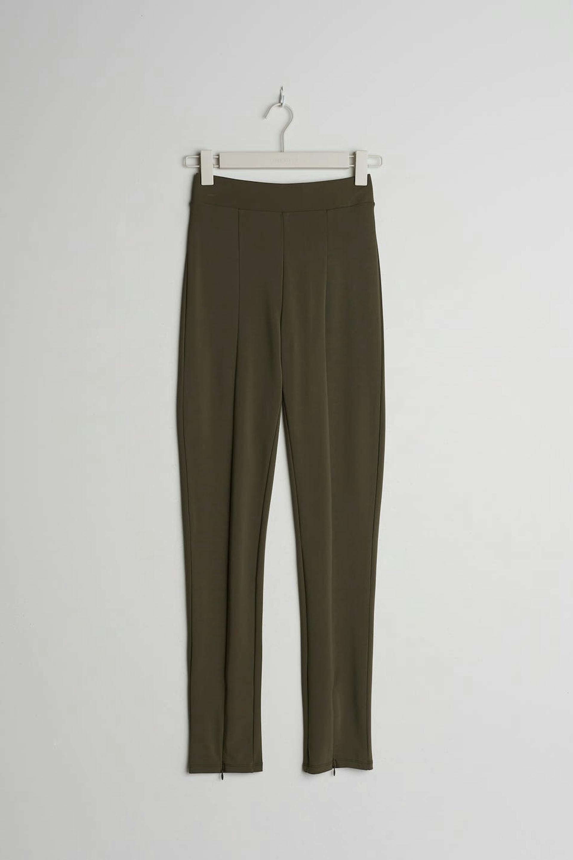 Legging met een nauwsluitende pasvorm. De legging is bruin en heeft een sluitbare spleet met een verborgen rits aan de voorkant. Het heeft een zoom detail langs elk been.
