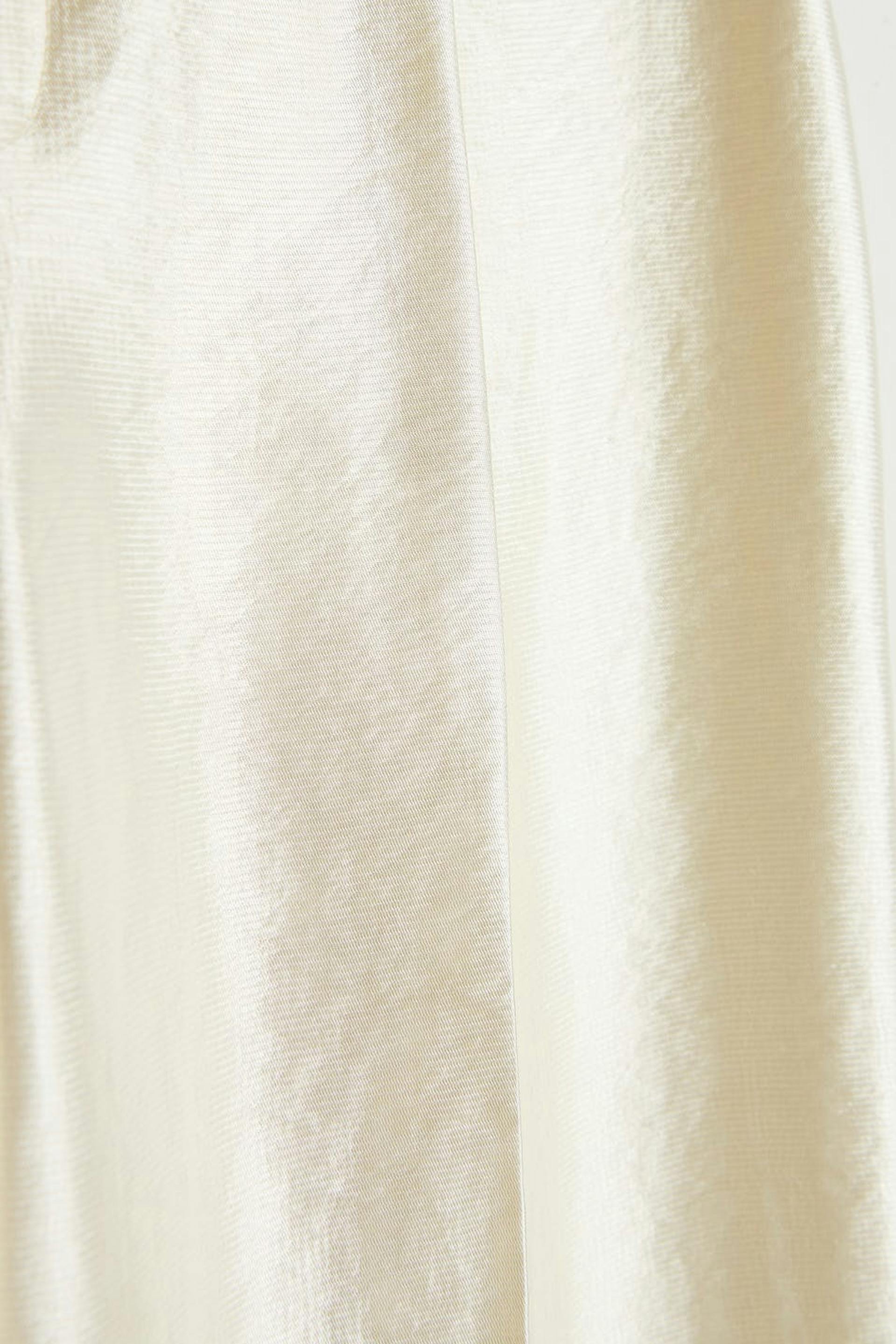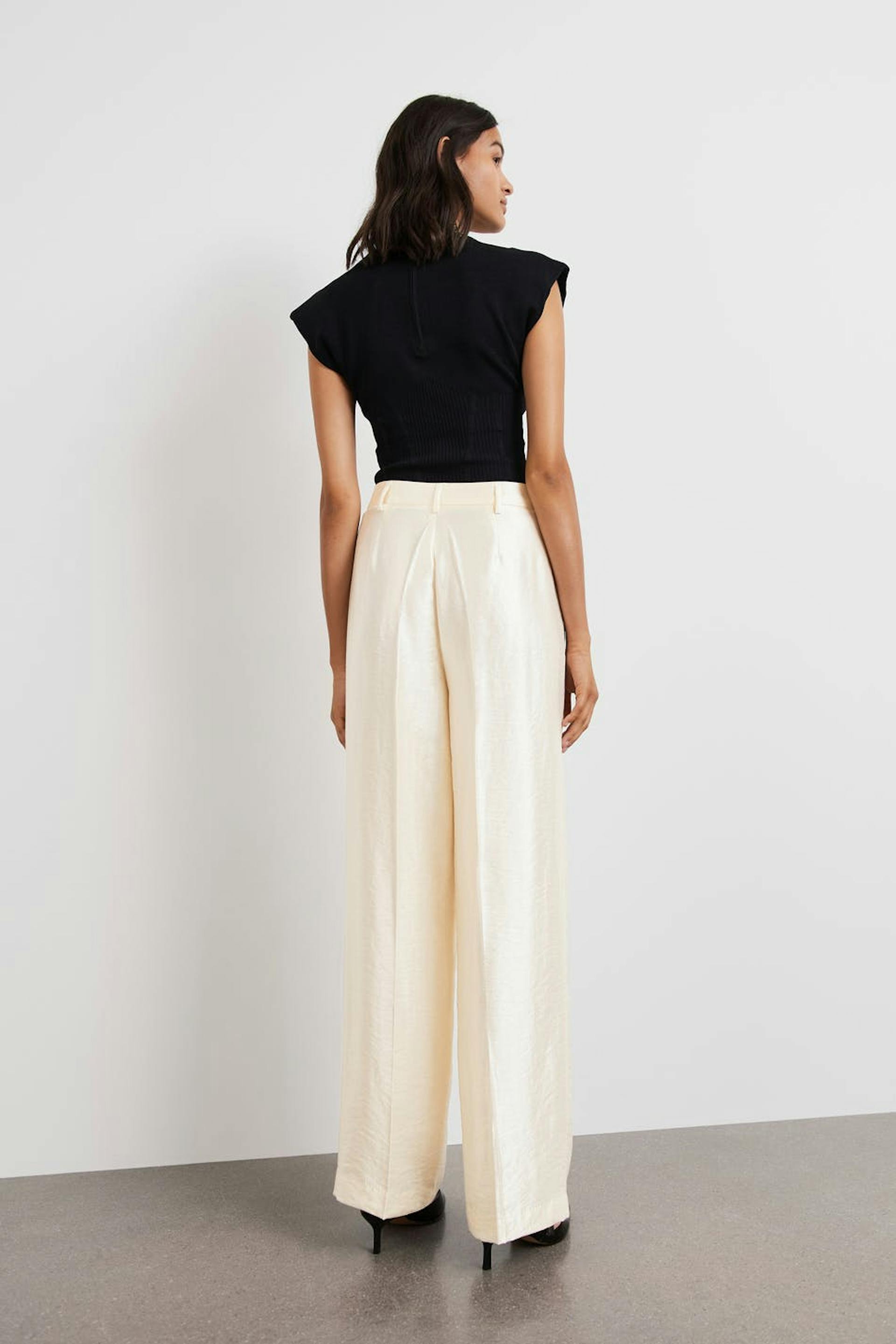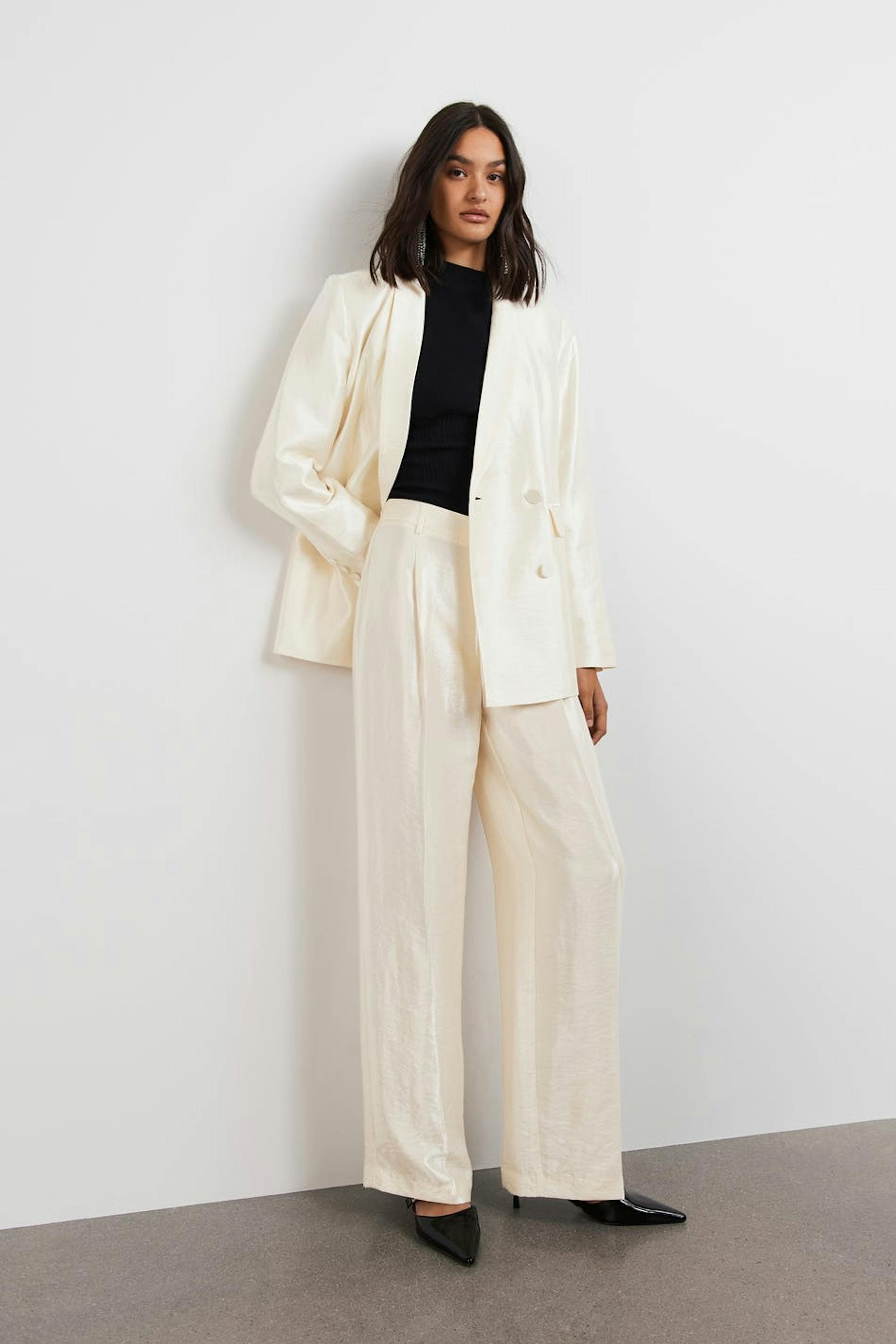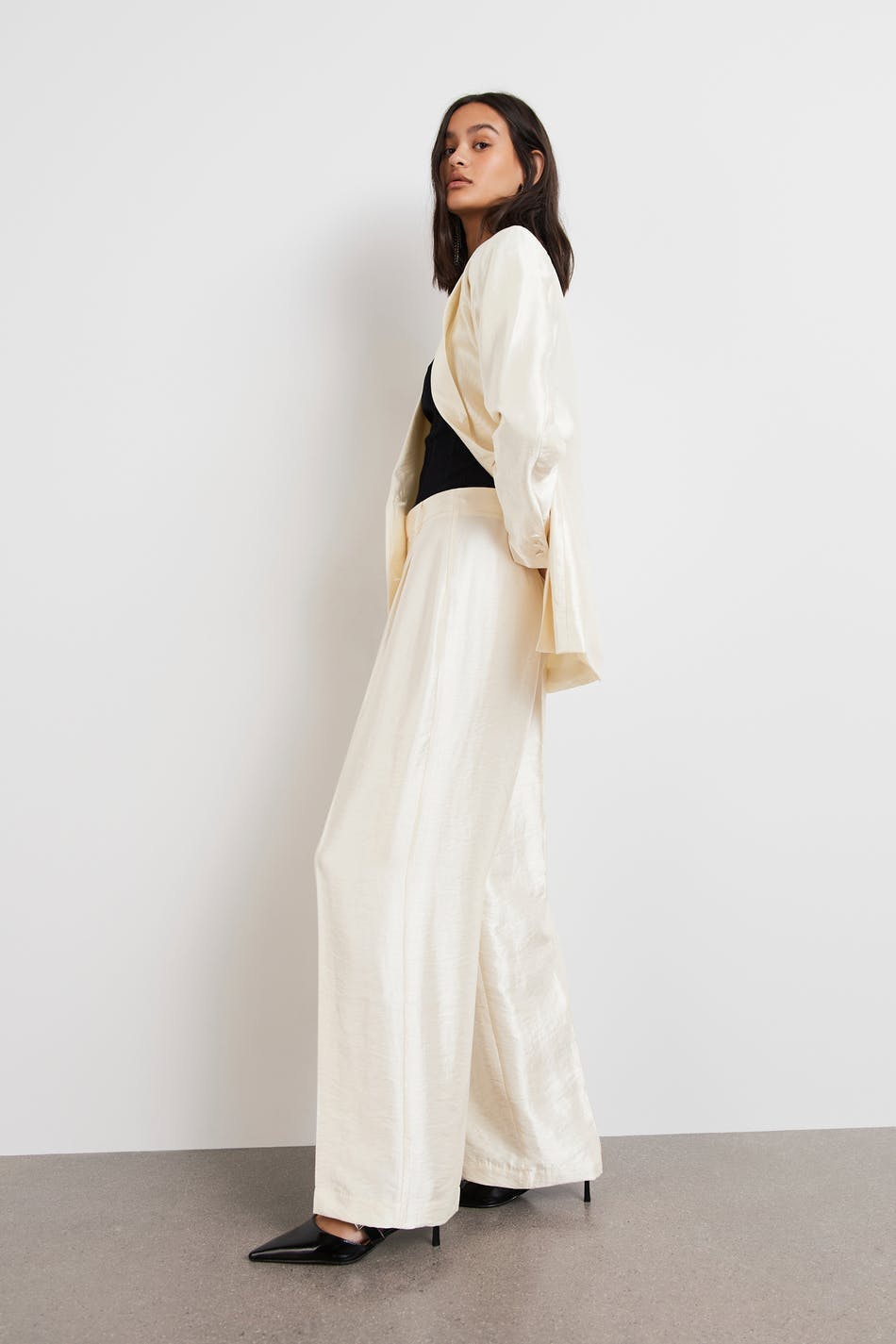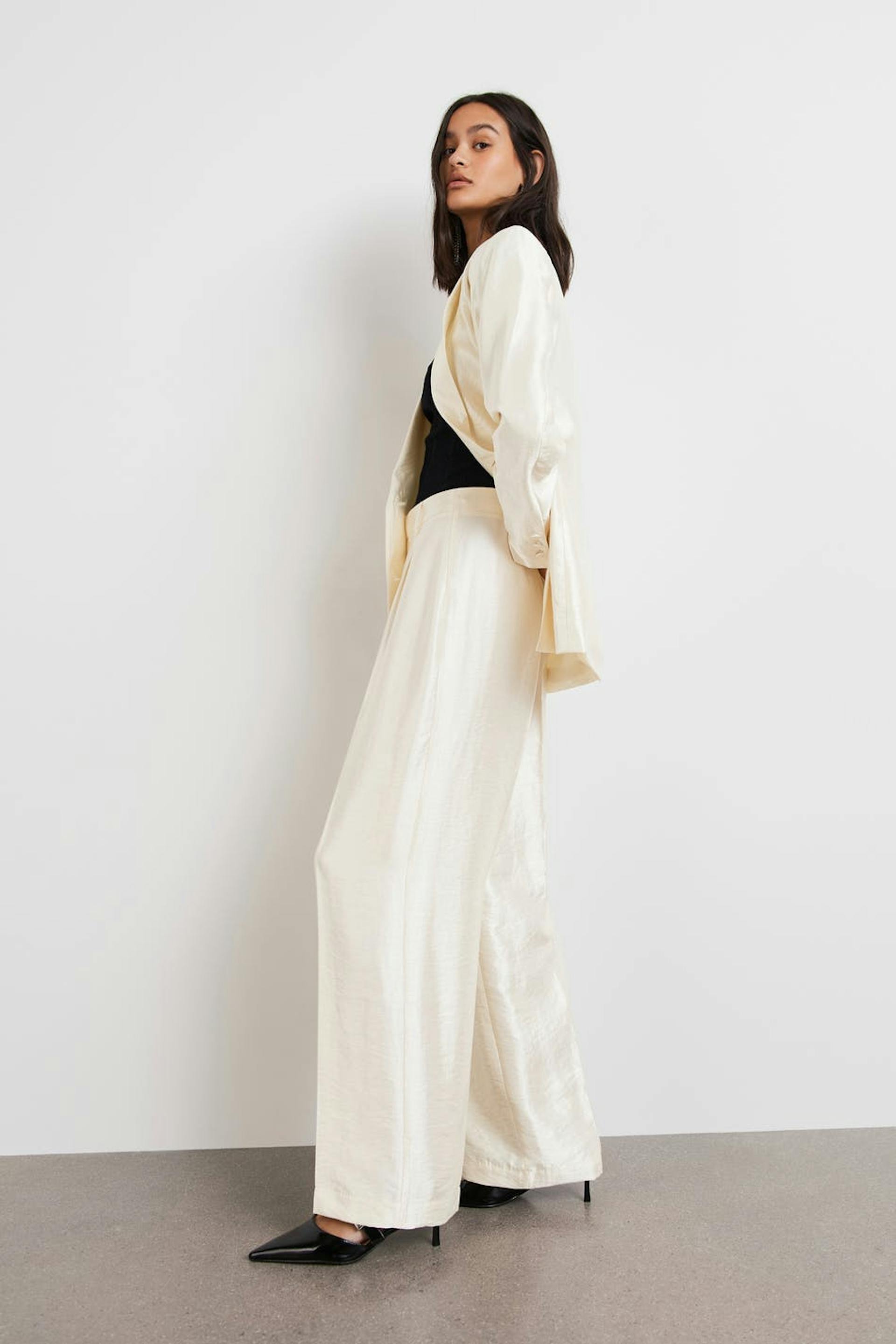 Brede pantalonnen met vouw. De broeken zijn perfect voor het feest, wit en gevlochten. Het heeft een hoge taille en een rits met rits.