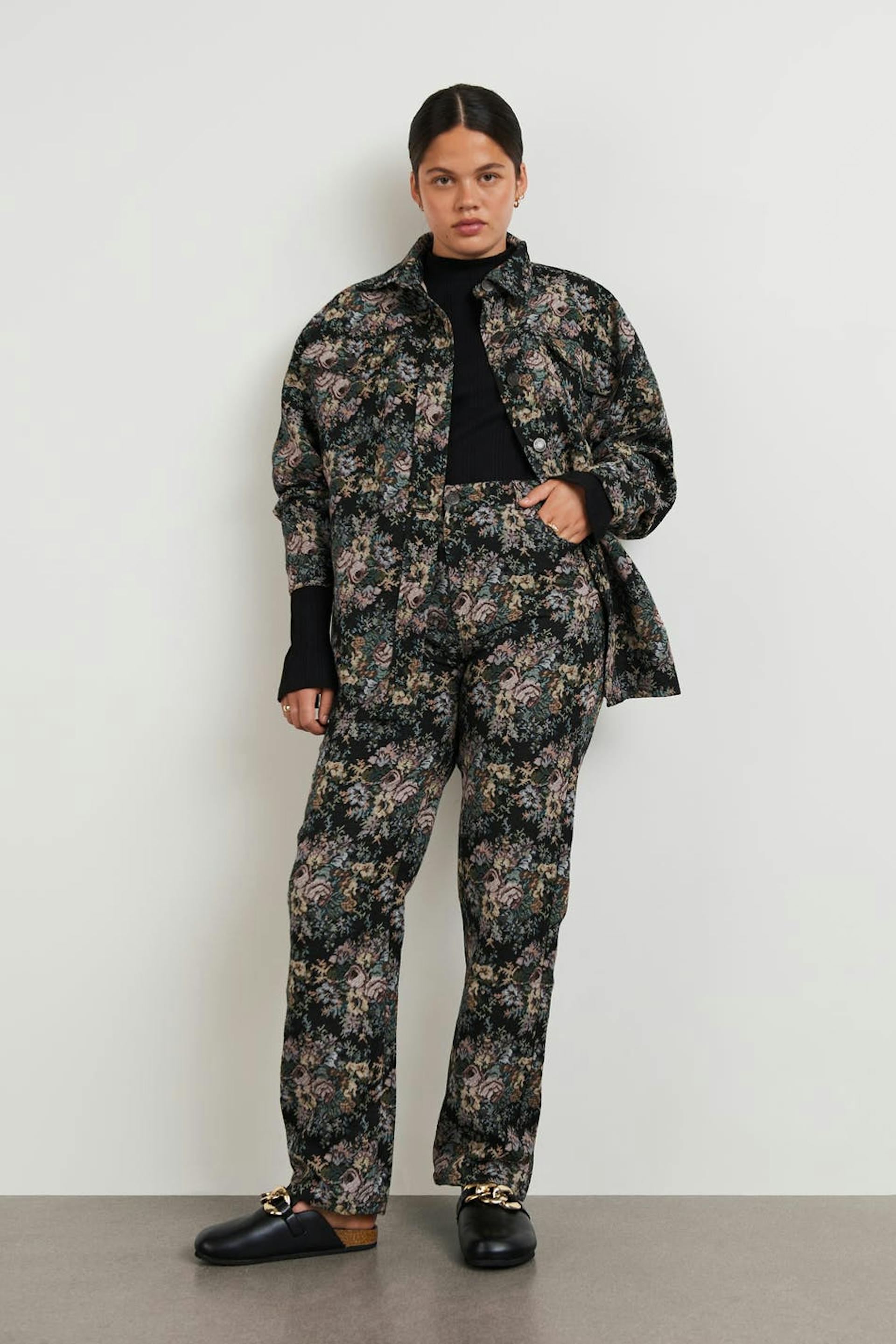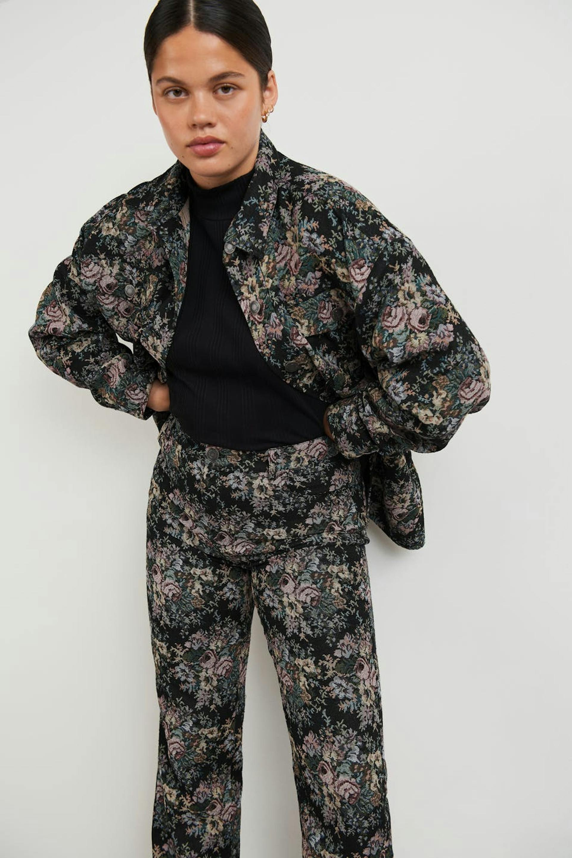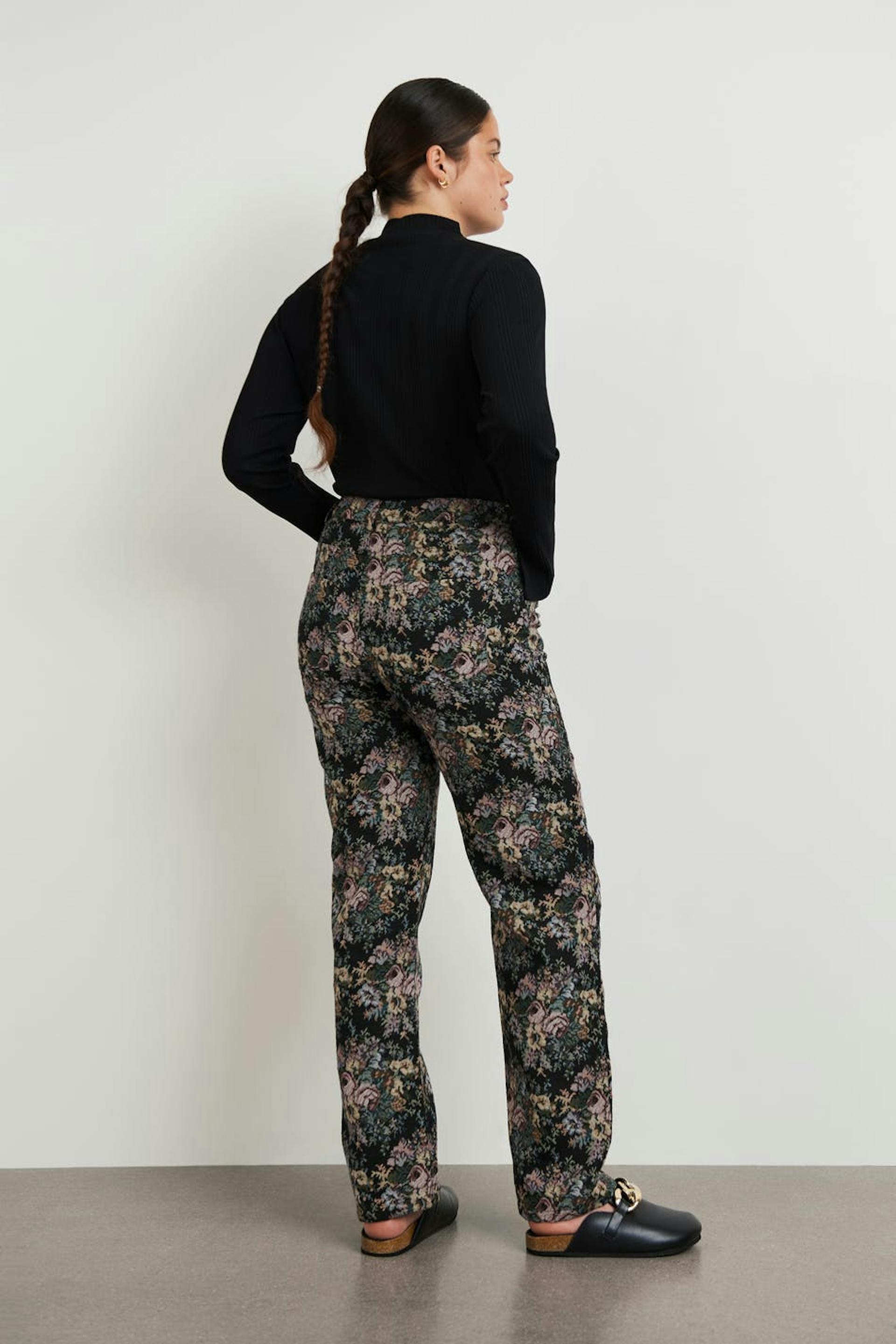 Jacquardgewevene broeken met een normale pasvorm. De broeken zijn zwart en hebben een bloemig patroon. Het heeft zakken aan de voor- en achterzijde, rechte broekspijpen met een volledige lengte en een ceintuur met riem lussen.