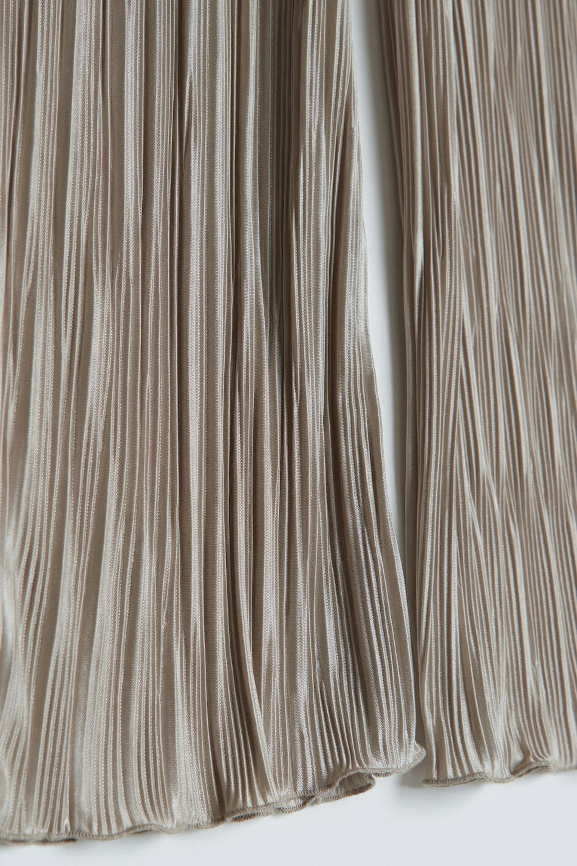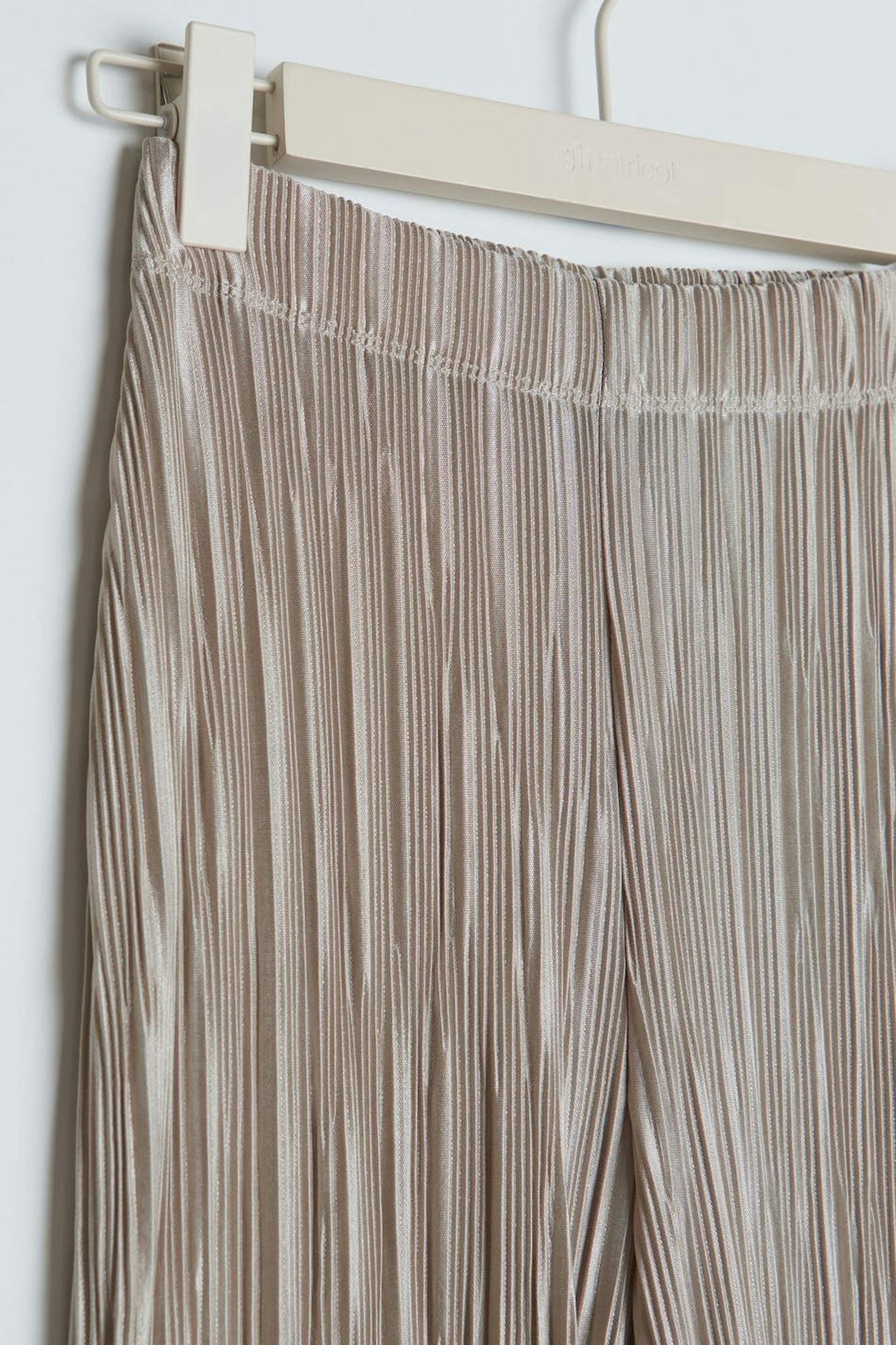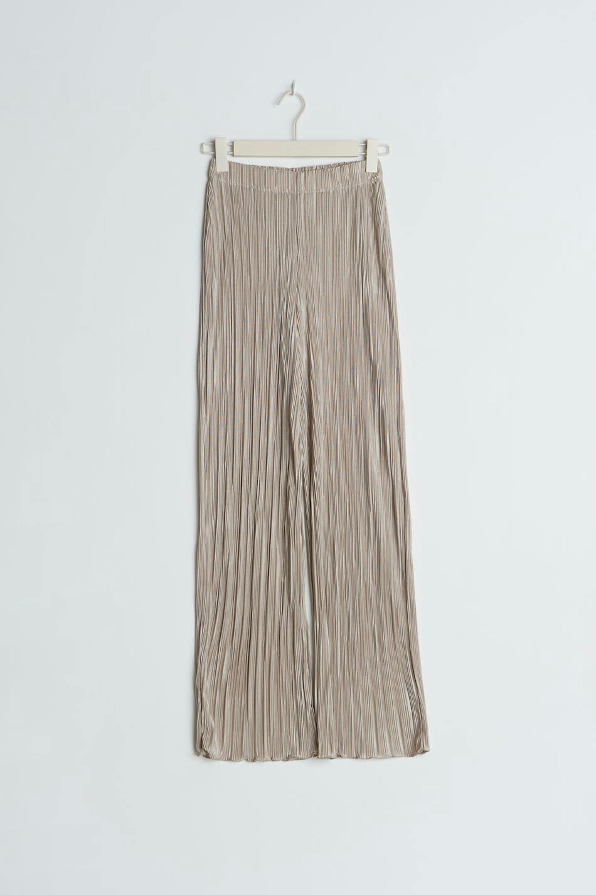 Geplisseerde broeken met flared broekspijpen. De broeken zijn perfect voor het feest en beige en hebben een zachte elastiek aan de taille. Het heeft ruches aan het uiteinde van de benen.