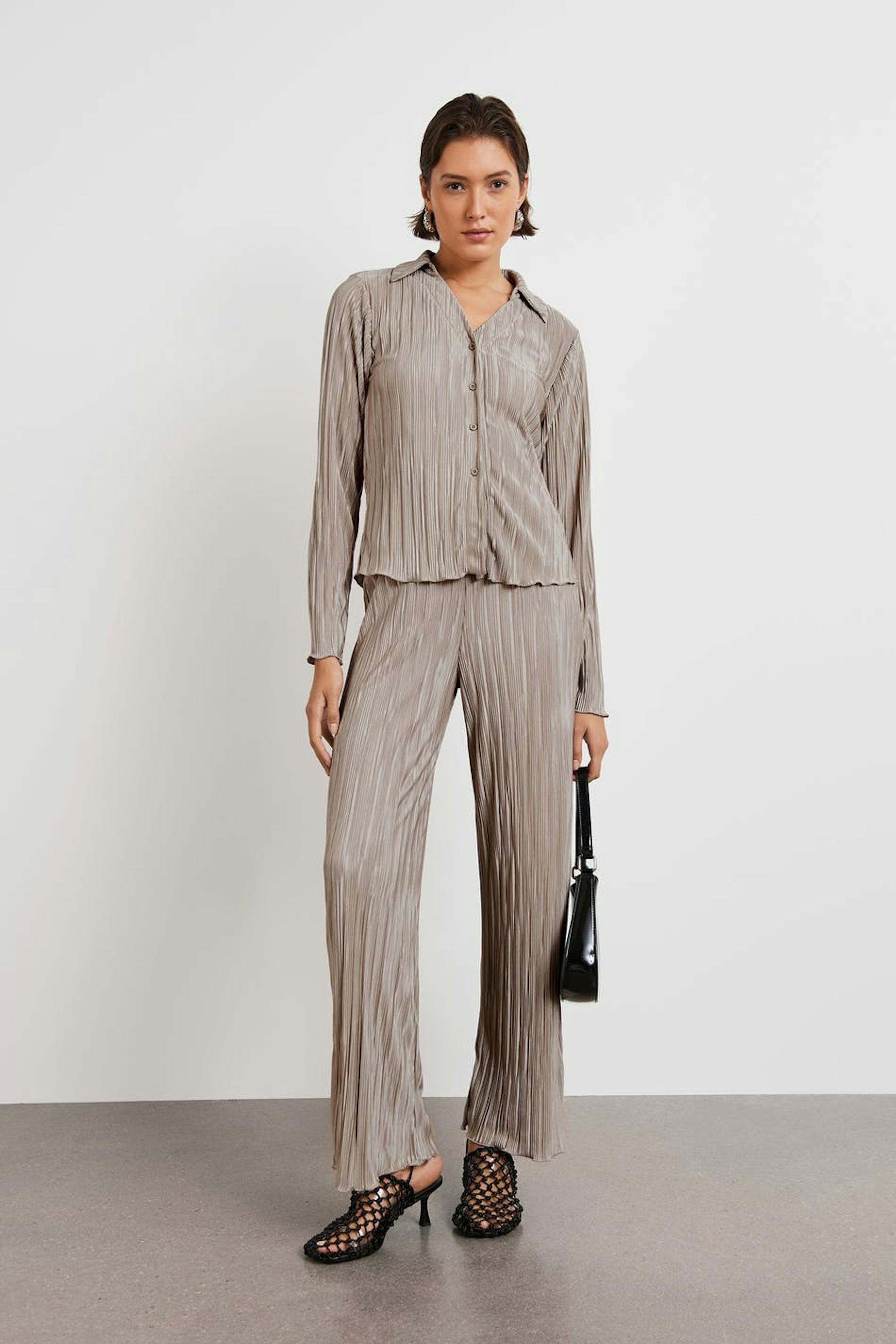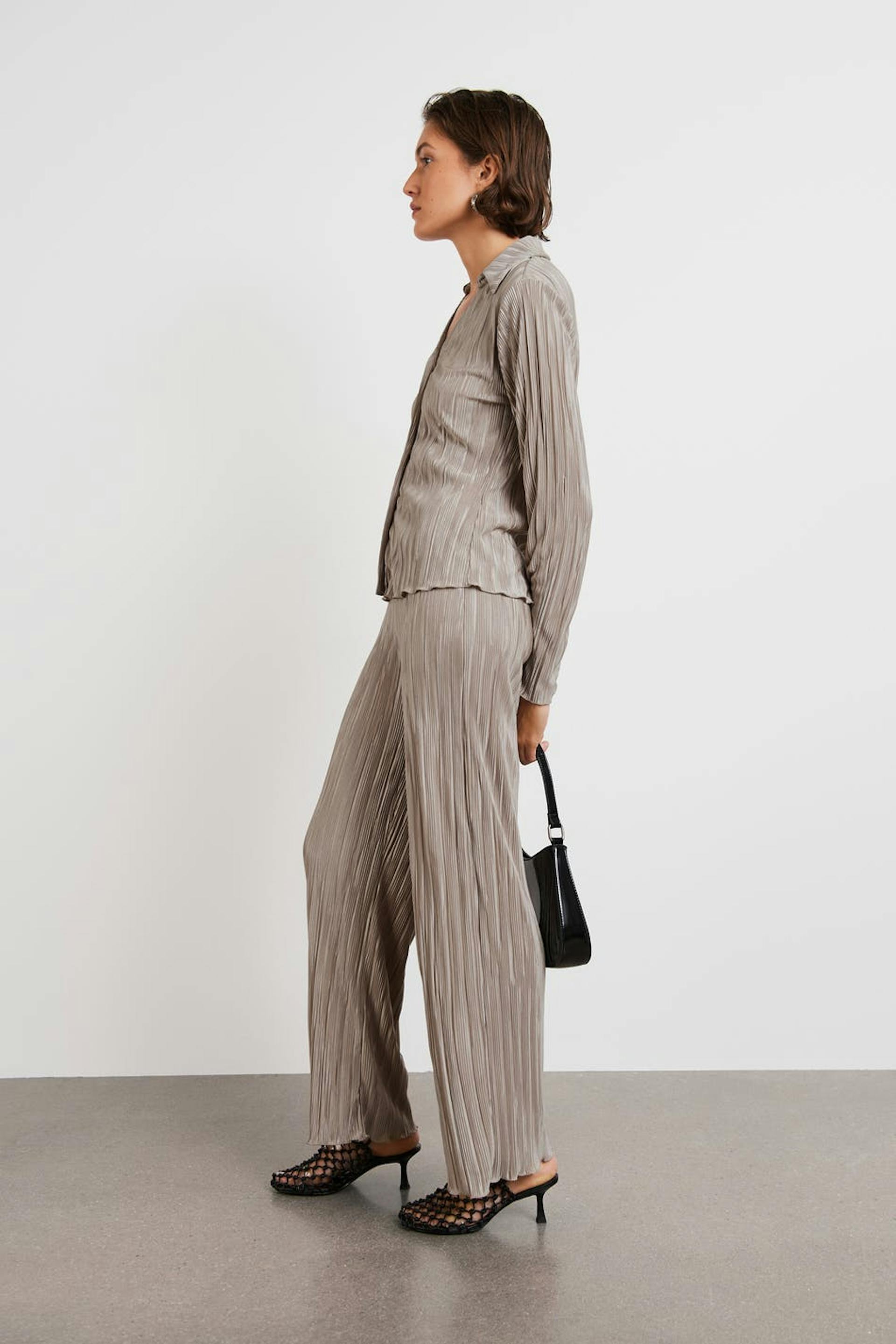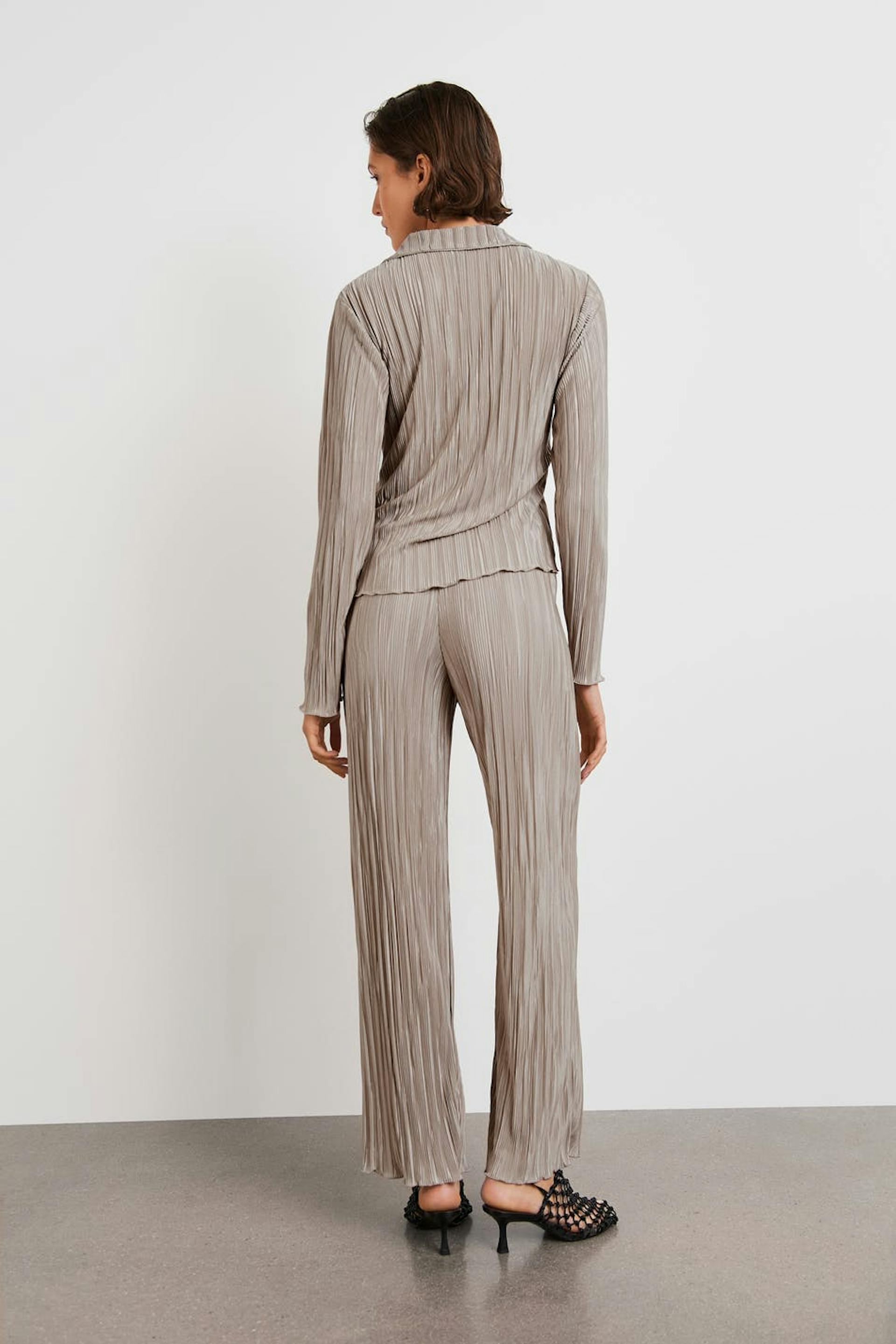 Geplisseerde broeken met flared broekspijpen. De broeken zijn perfect voor het feest en beige en hebben een zachte elastiek aan de taille. Het heeft ruches aan het uiteinde van de benen.