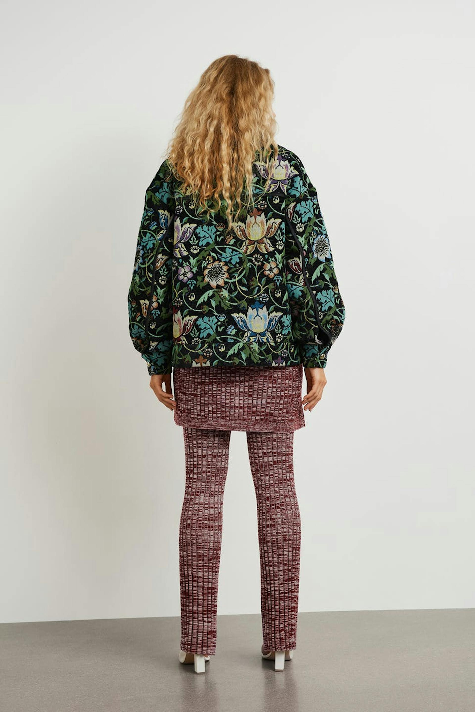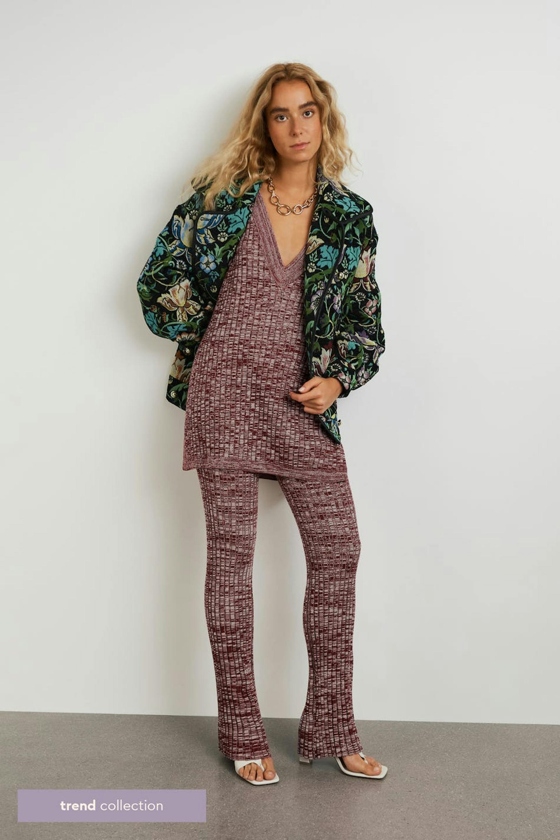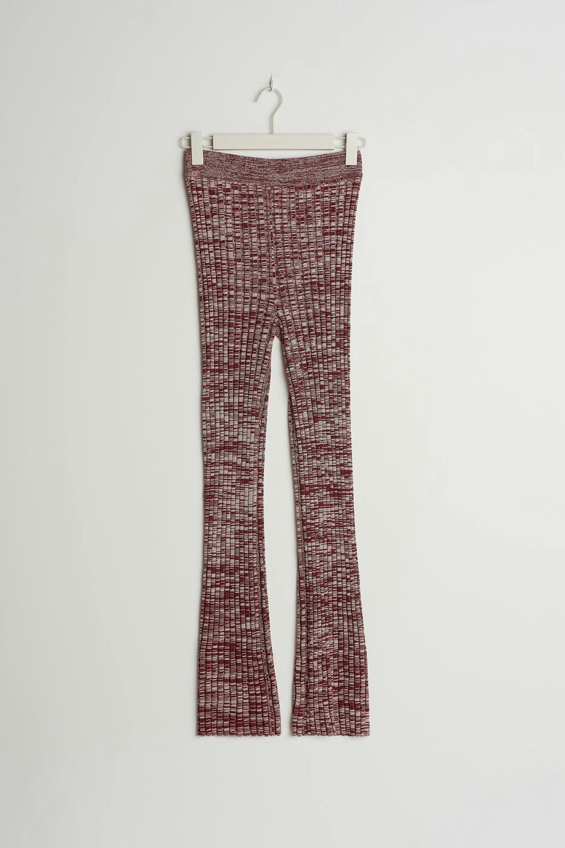 Geribbelde broeken met een hoge taille. De broeken zijn rood en hebben flared broekspijpen met een volledige lengte. Het heeft een elastiek aan de taille.