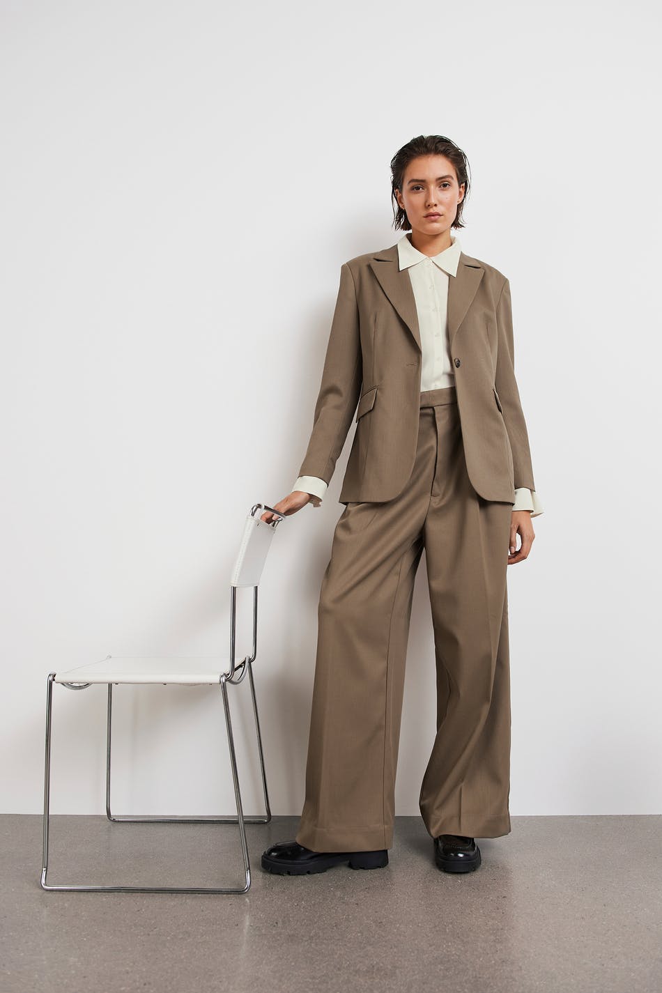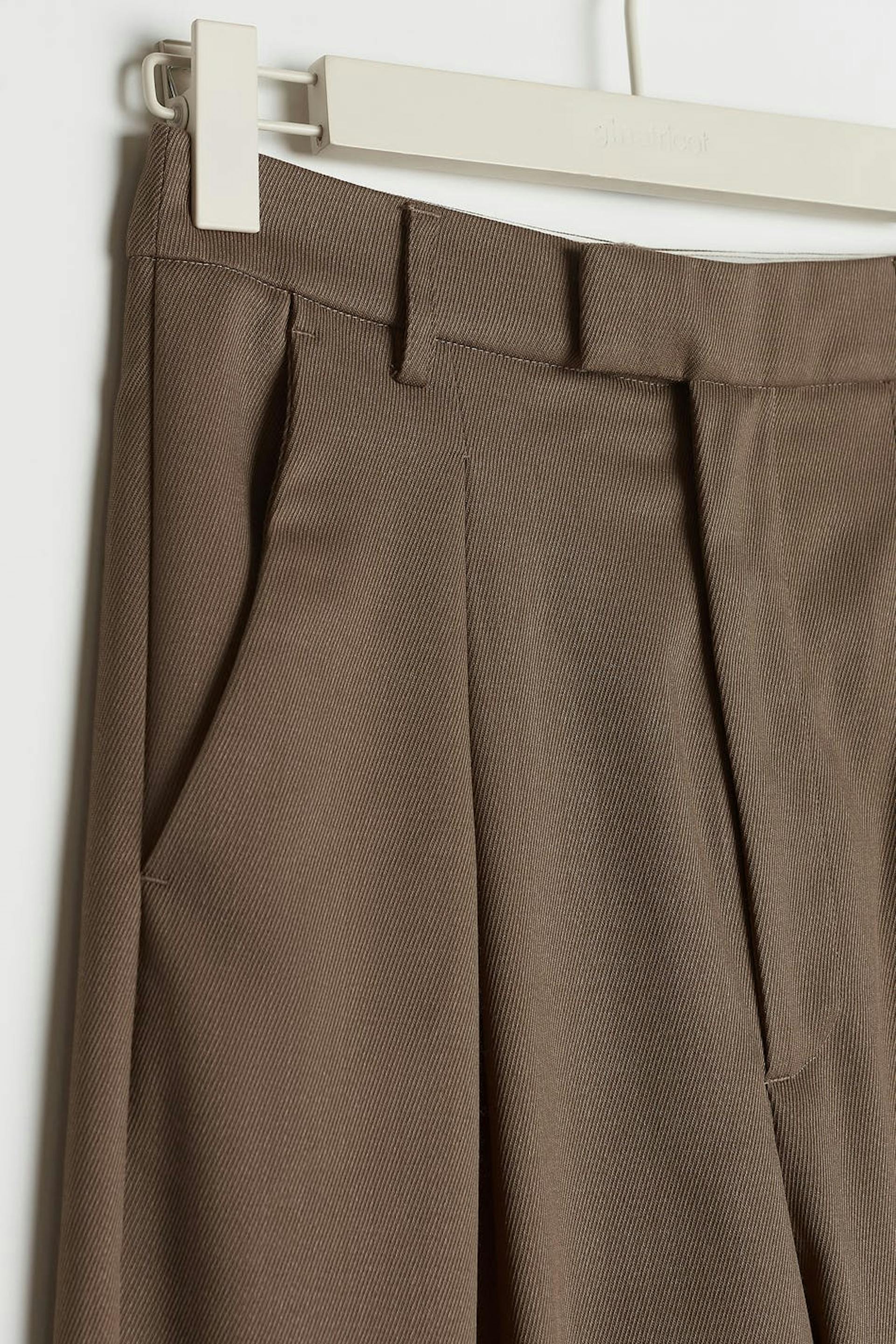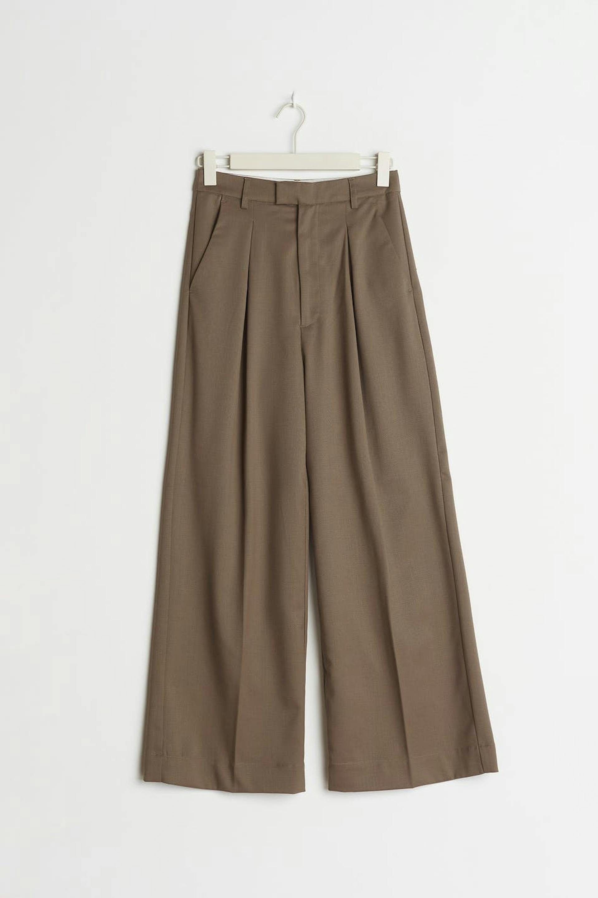 Pantalonnen met hoge taille. De broeken zijn bruin en hebben een premium kwaliteit. Het is gemaakt van wolmix en heeft brede broekspijpen, vouw aan de voorkant, schuine broekzakken aan de zijkanten en paspelzakken achter.