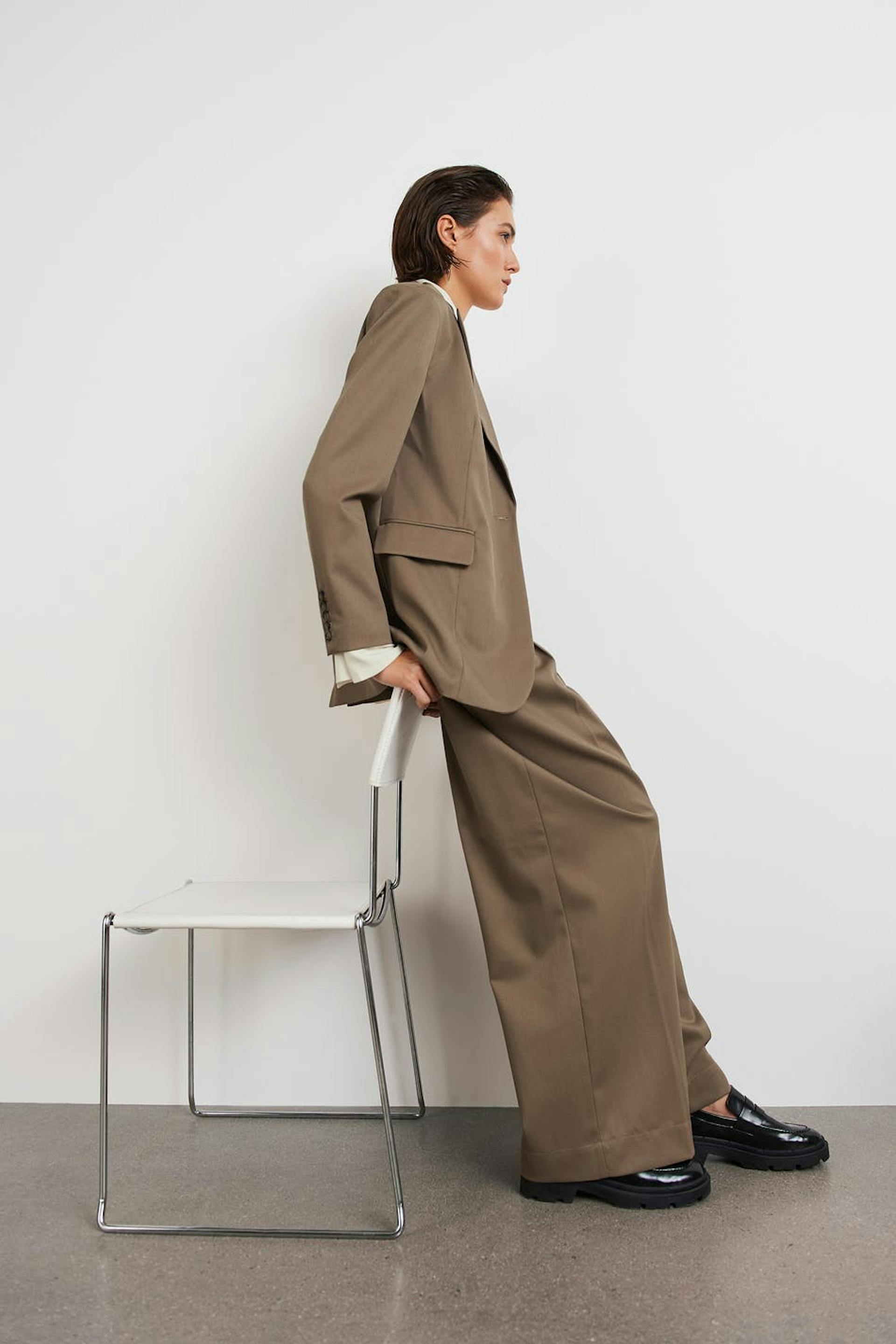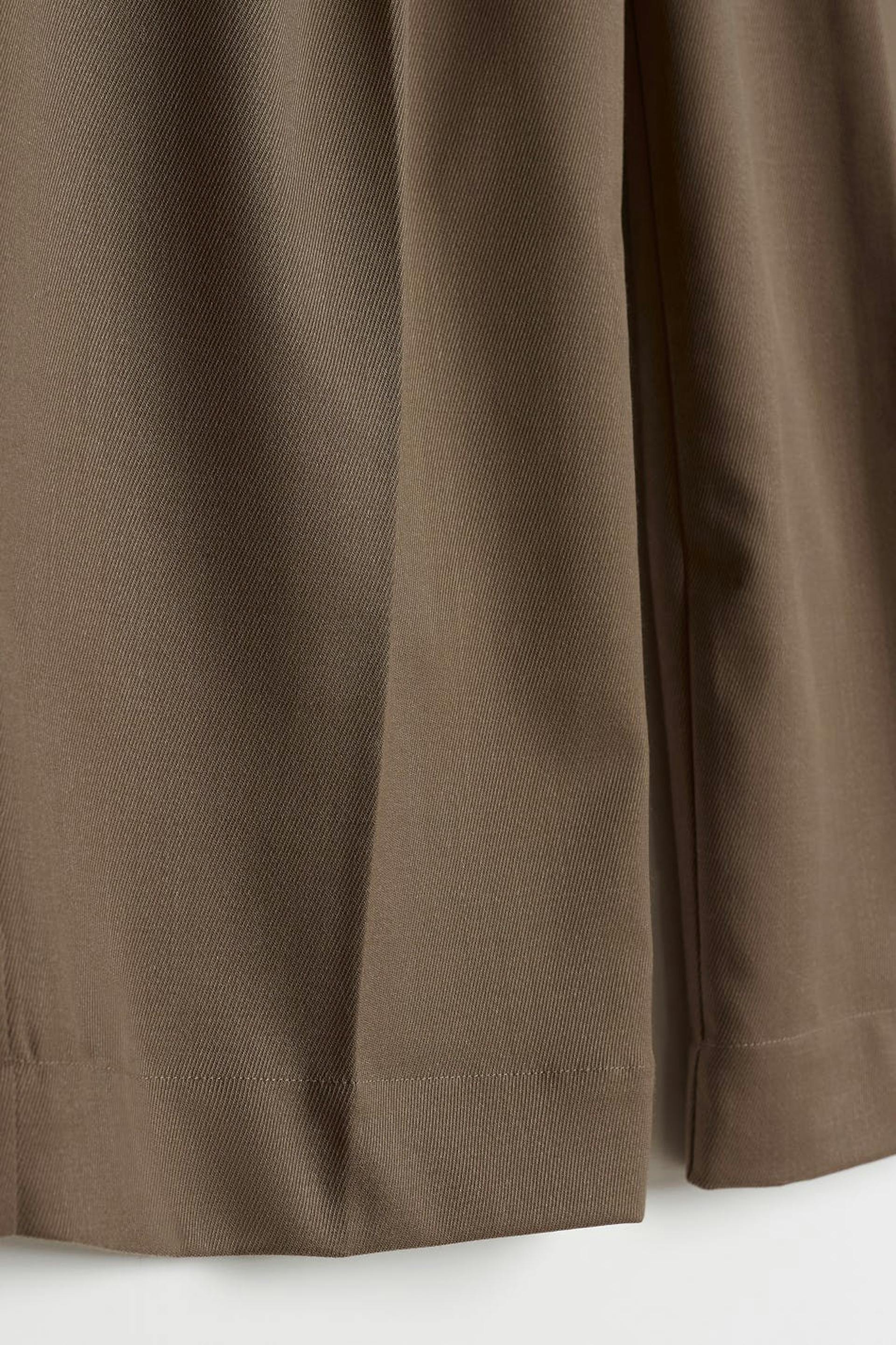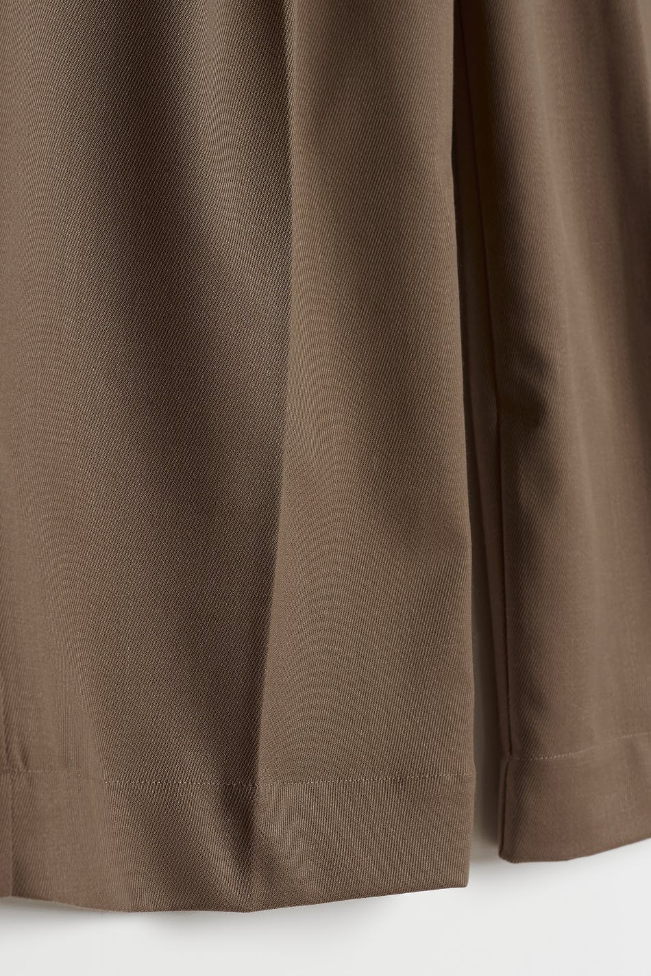 Pantalonnen met hoge taille. De broeken zijn bruin en hebben een premium kwaliteit. Het is gemaakt van wolmix en heeft brede broekspijpen, vouw aan de voorkant, schuine broekzakken aan de zijkanten en paspelzakken achter.