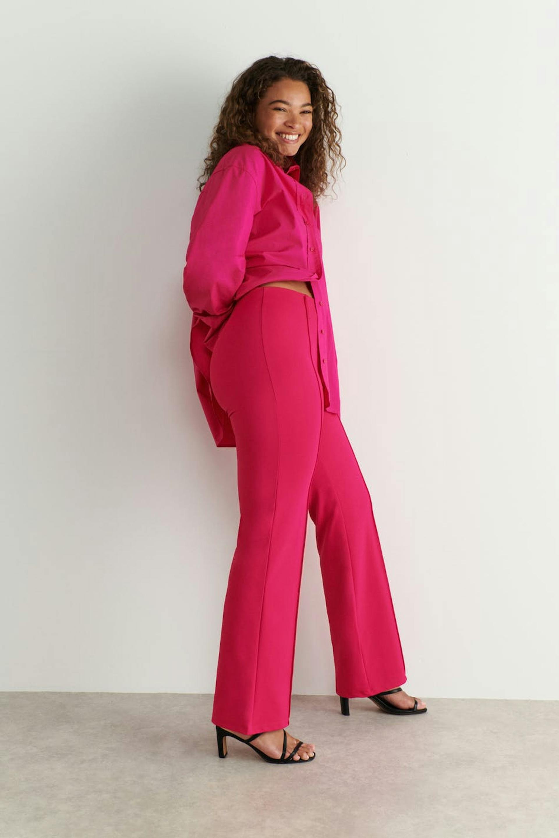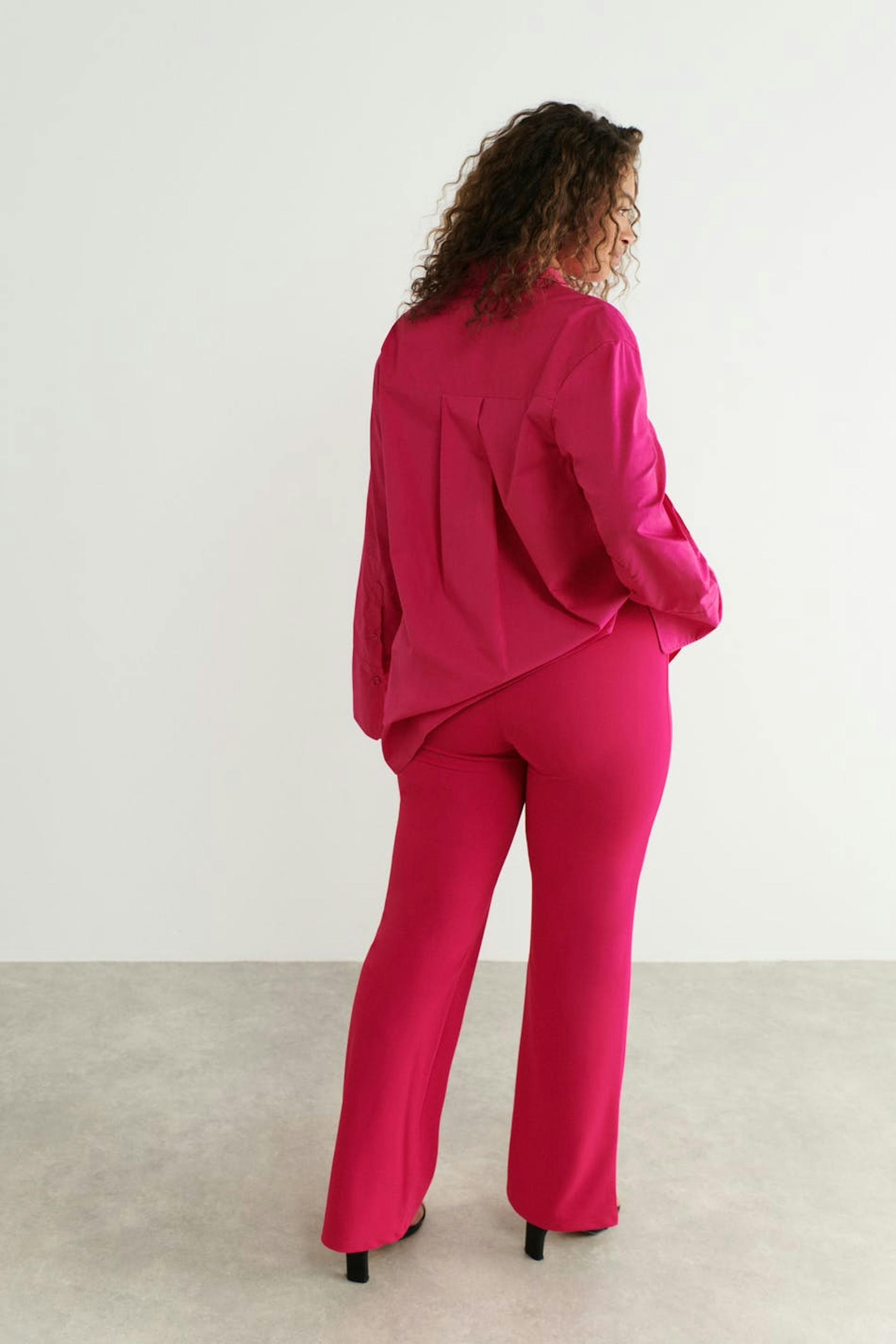 Flared broeken van tricot met elastiek aan de taille. De broeken zijn roze en hebben paspelzakken achter.