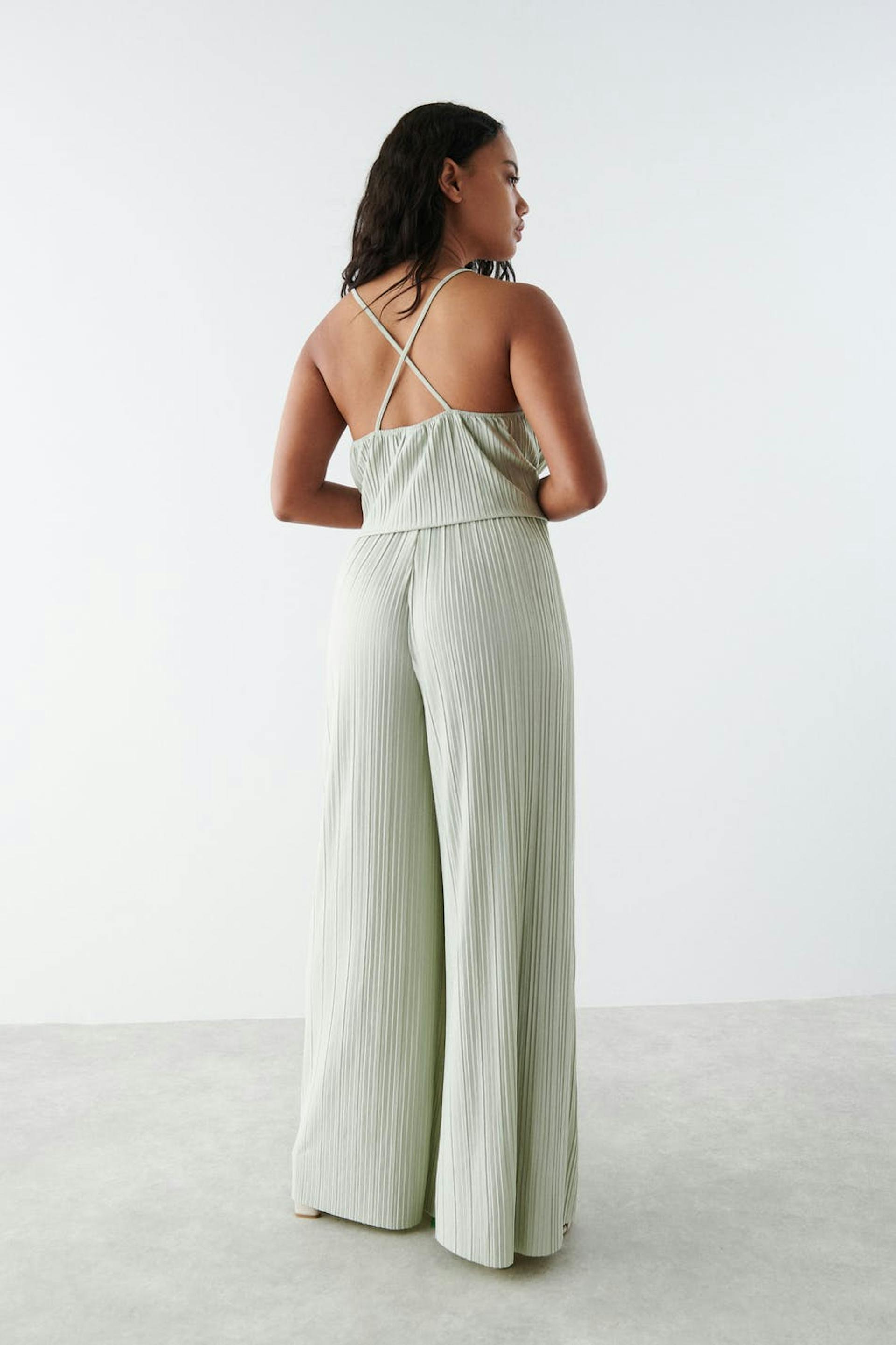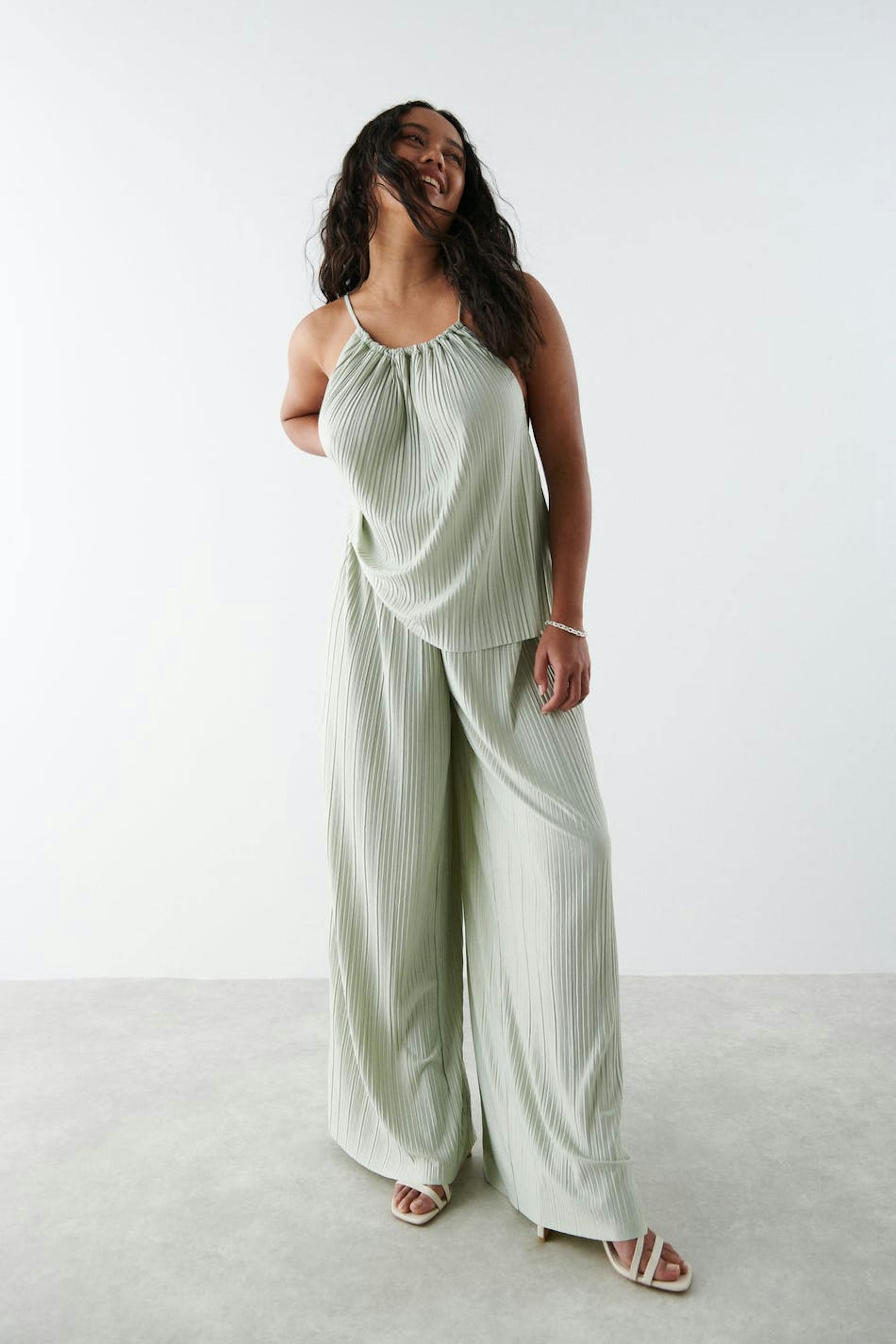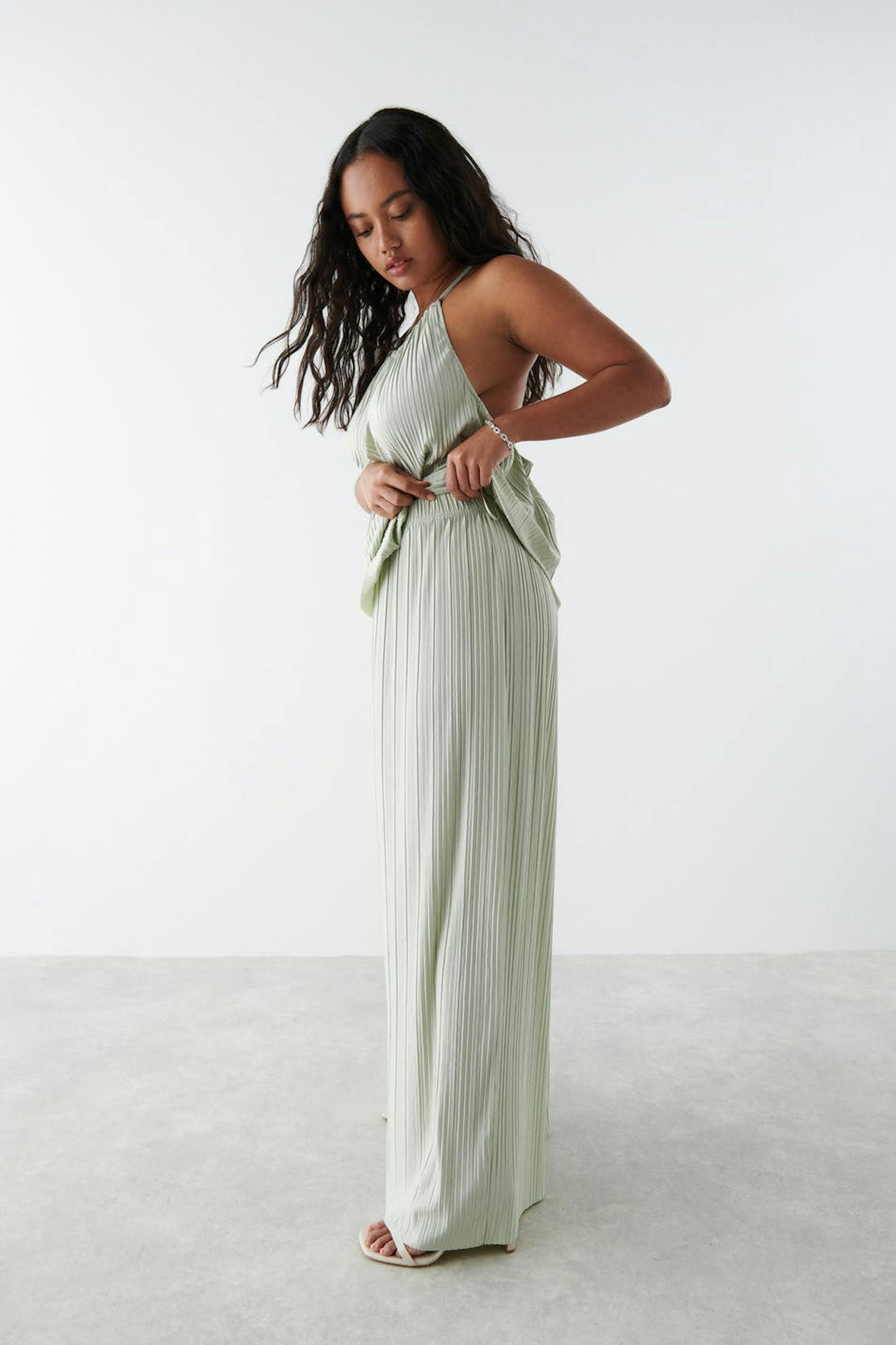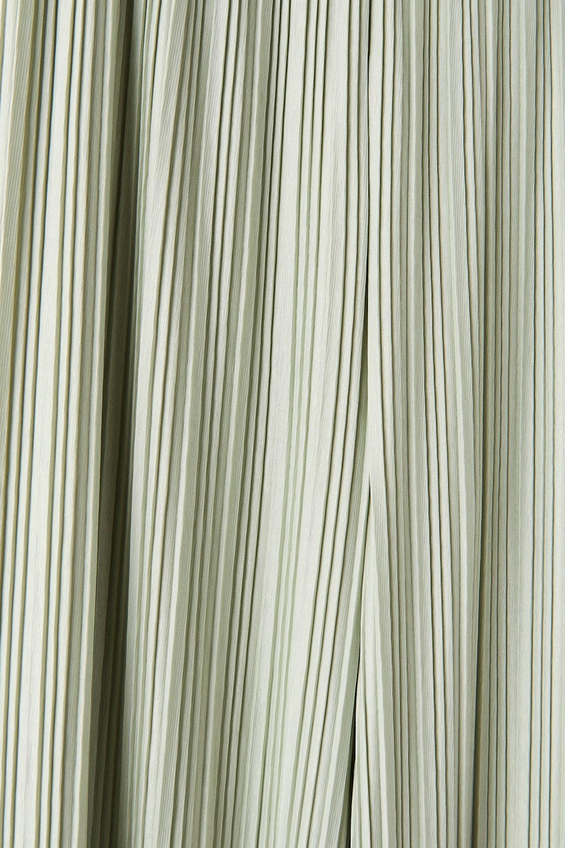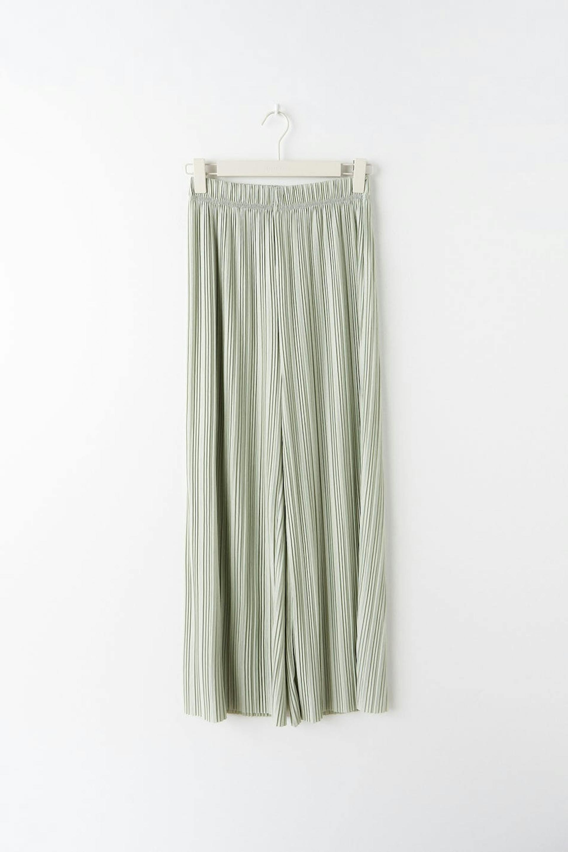 Geplisseerde broeken van tricot met brede broekspijpen. De broeken zijn groen en hebben een elastiek aan de taille.