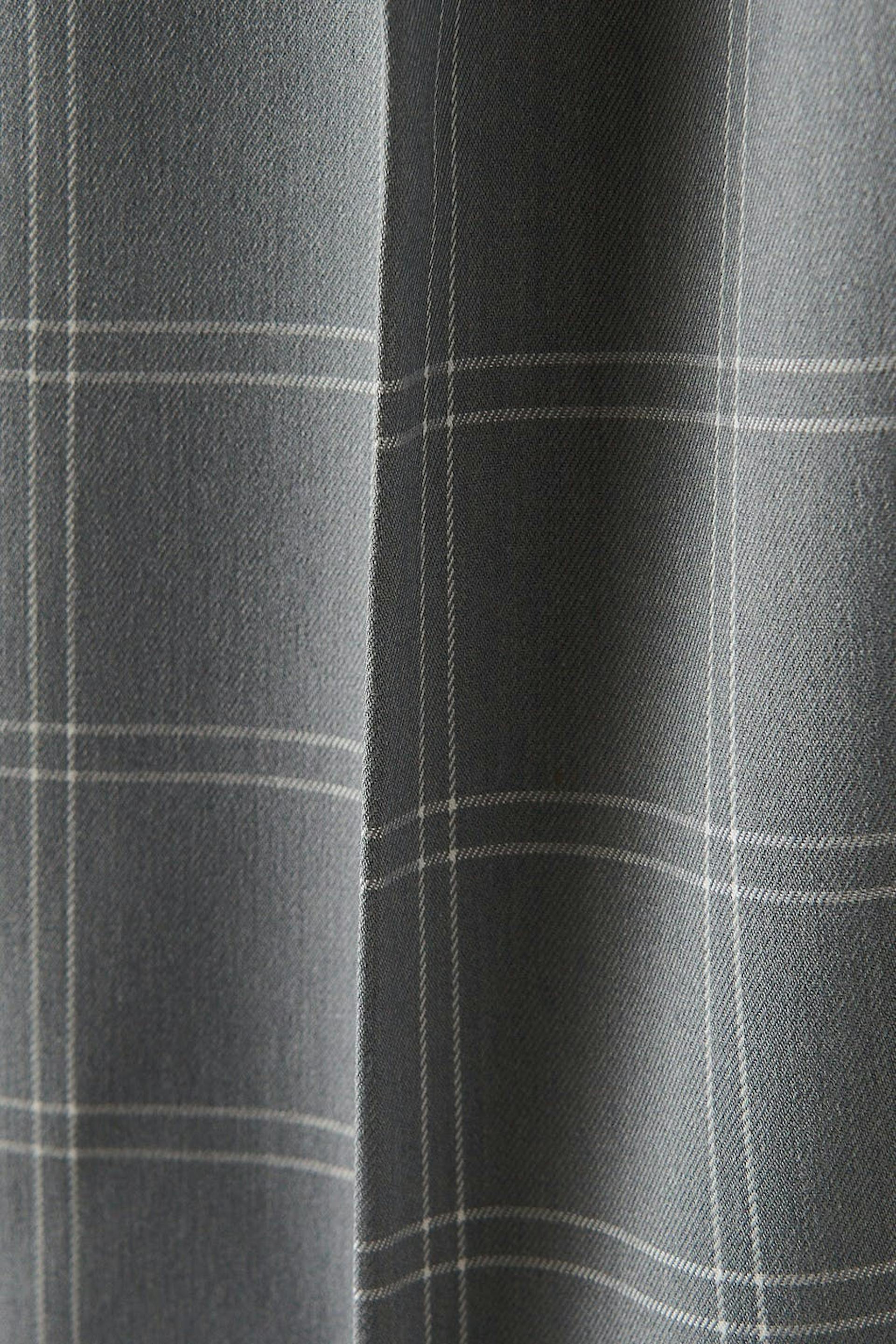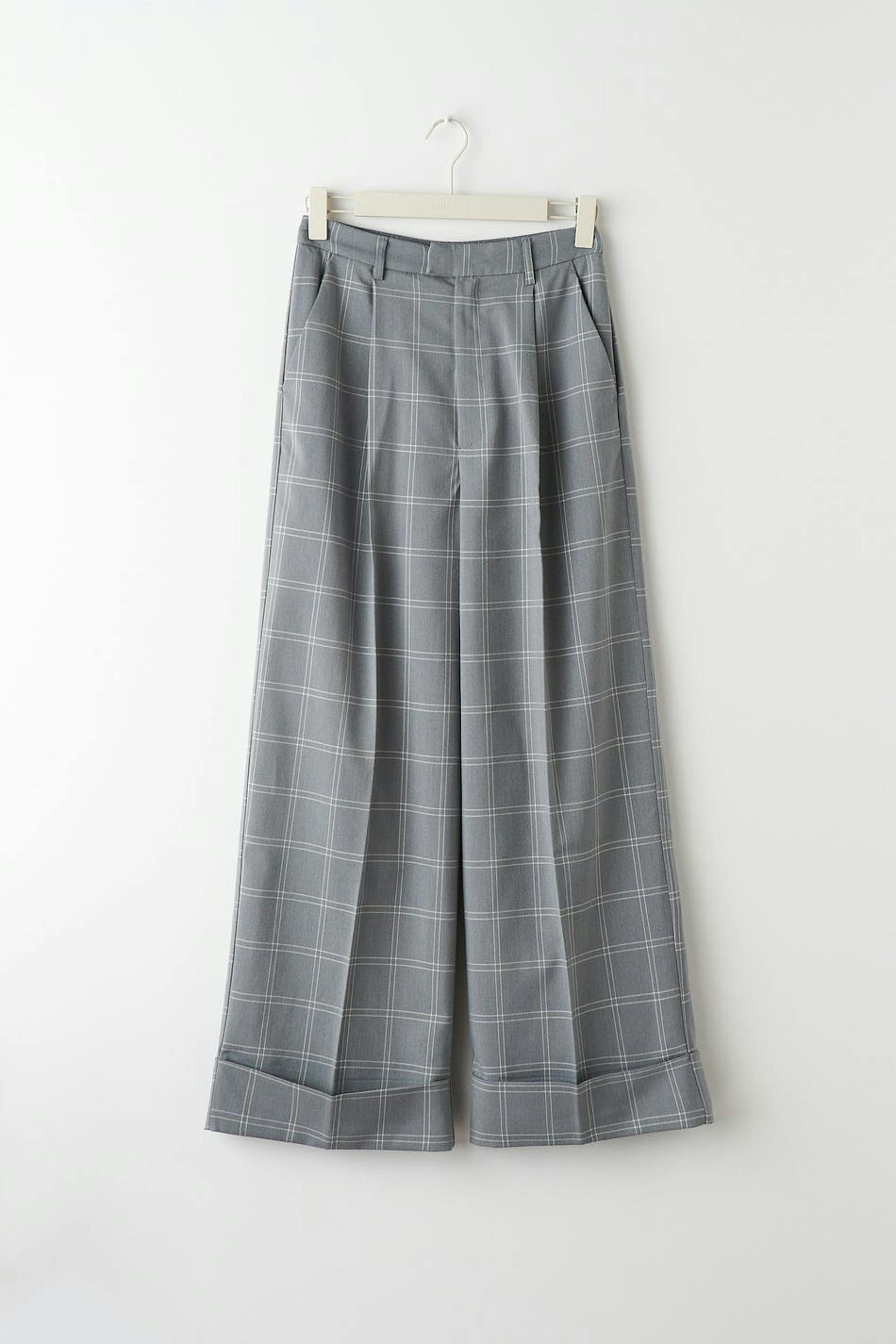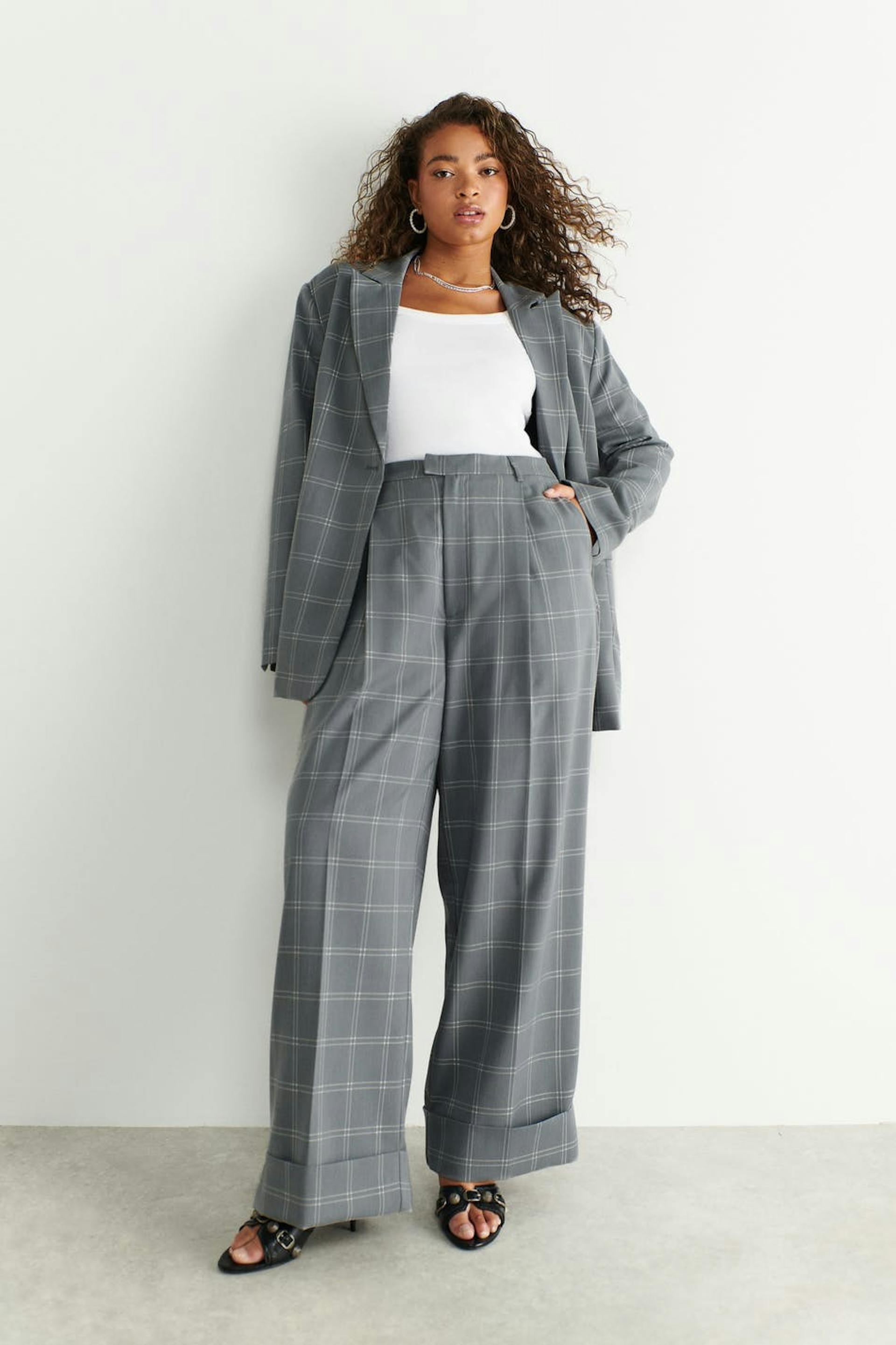 Geruite pantalonnen van wolmix met vouwen aan de voorkant. De broeken zijn grijs en hebben brede broekspijpen met volledige lengte. Het heeft gulp, schuine zijzakken, paspelzakken op het achterpand en ceintuur met riem lussen.
