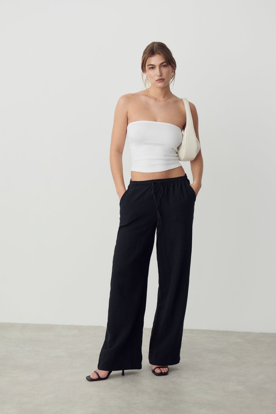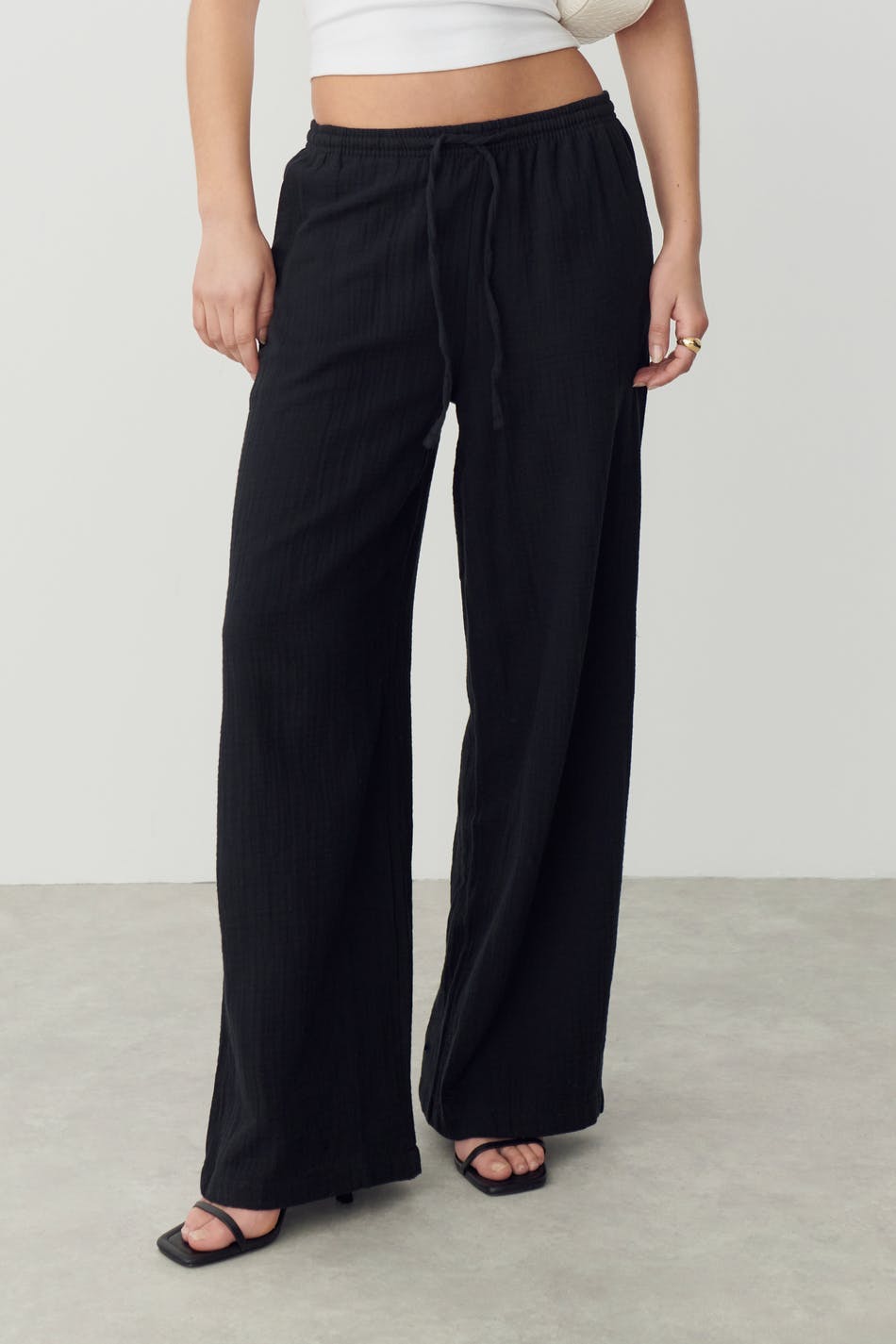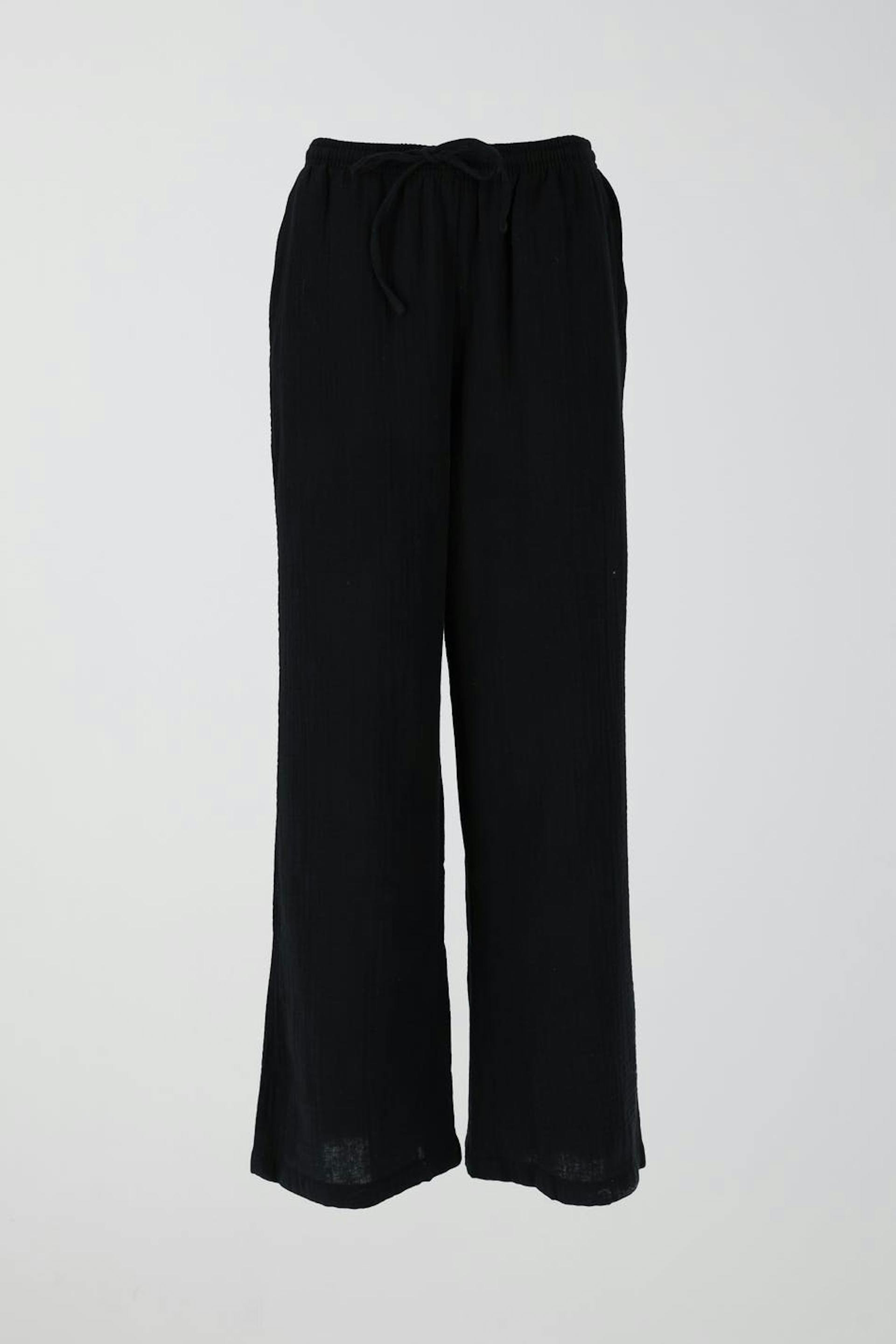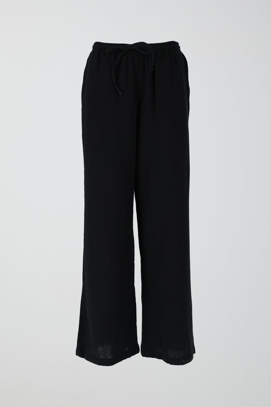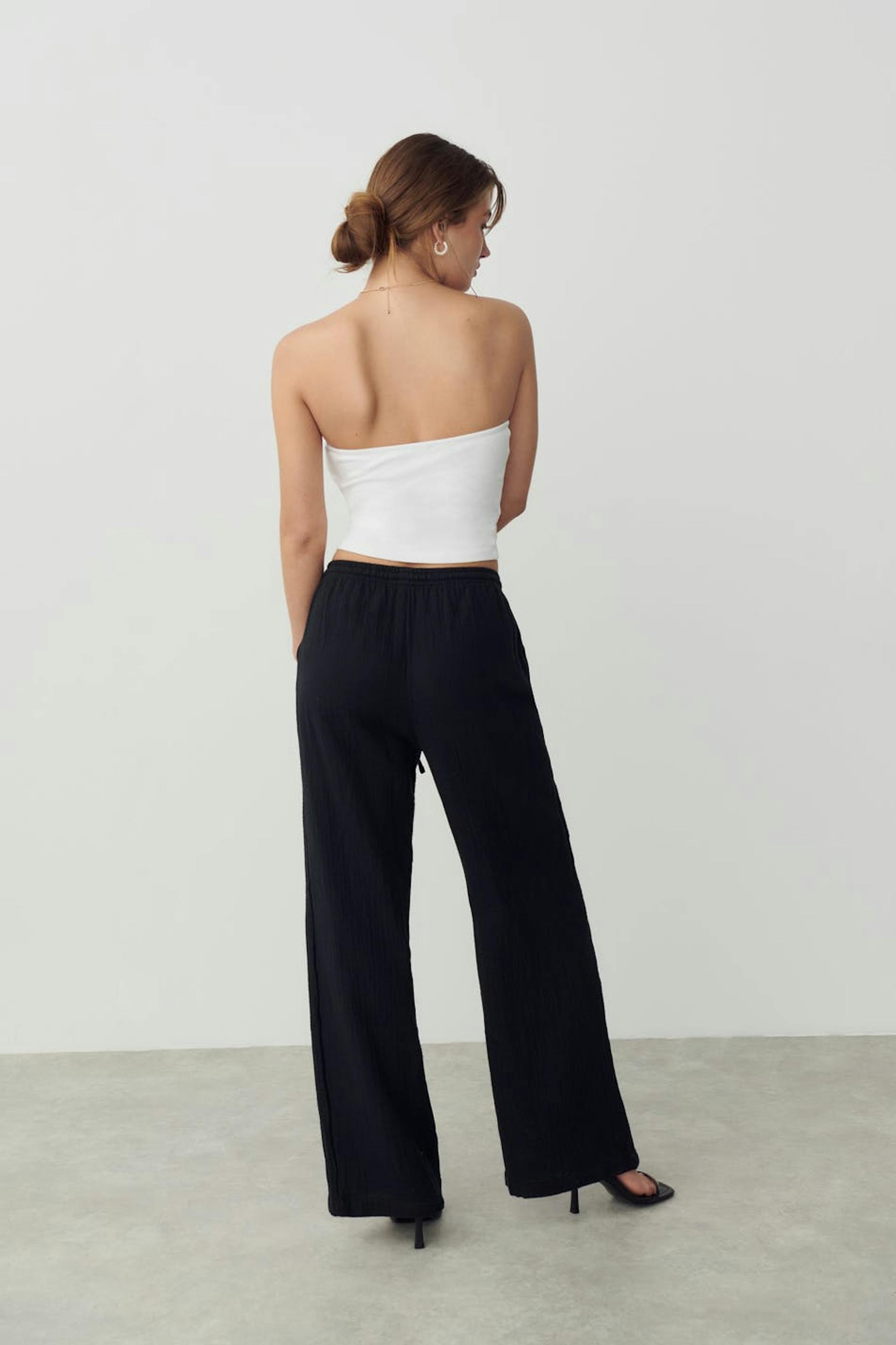 Gevlochten broeken van zacht katoen met hoge taille. De broeken zijn zwart en hebben brede broekspijpen. Het heeft zijzakken en elastiek aan de taille met zelfbinder aan de voorkant.