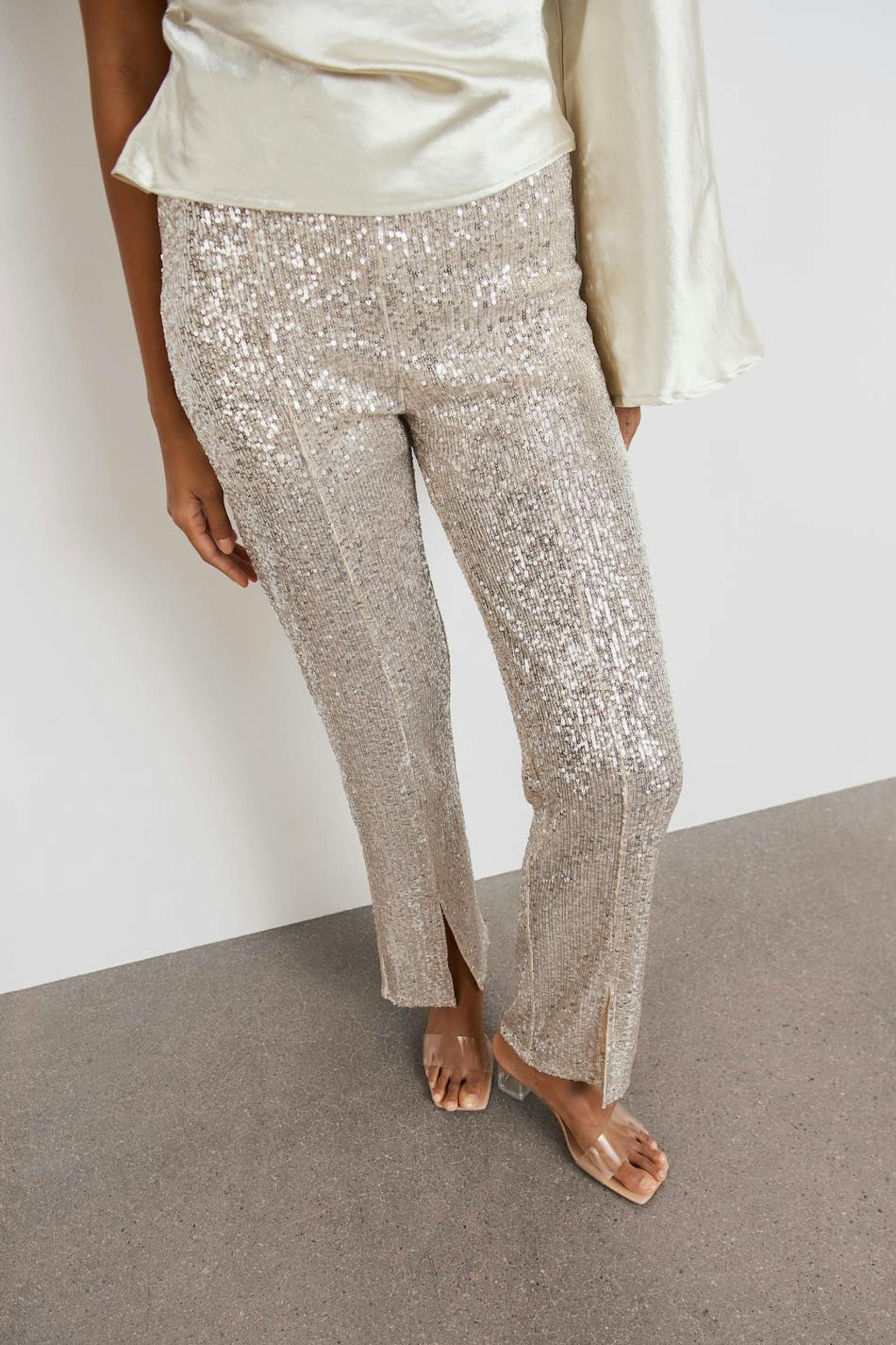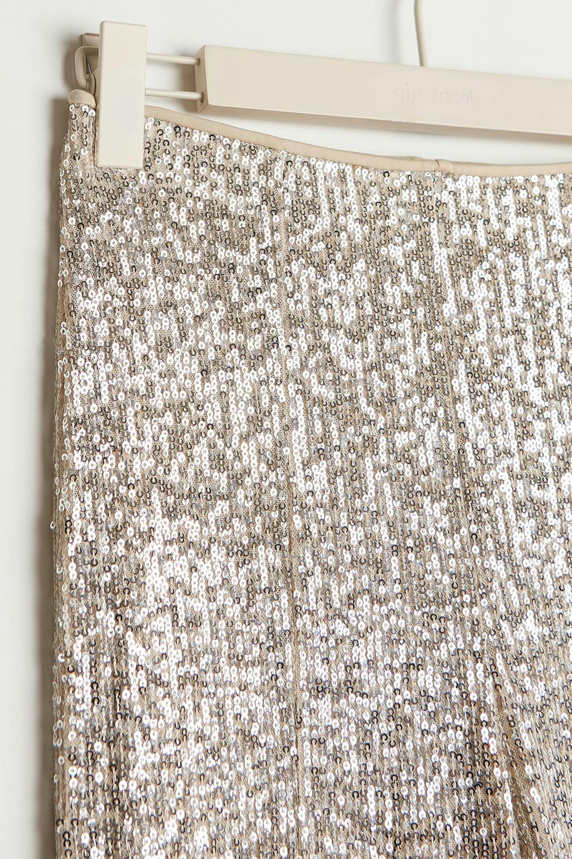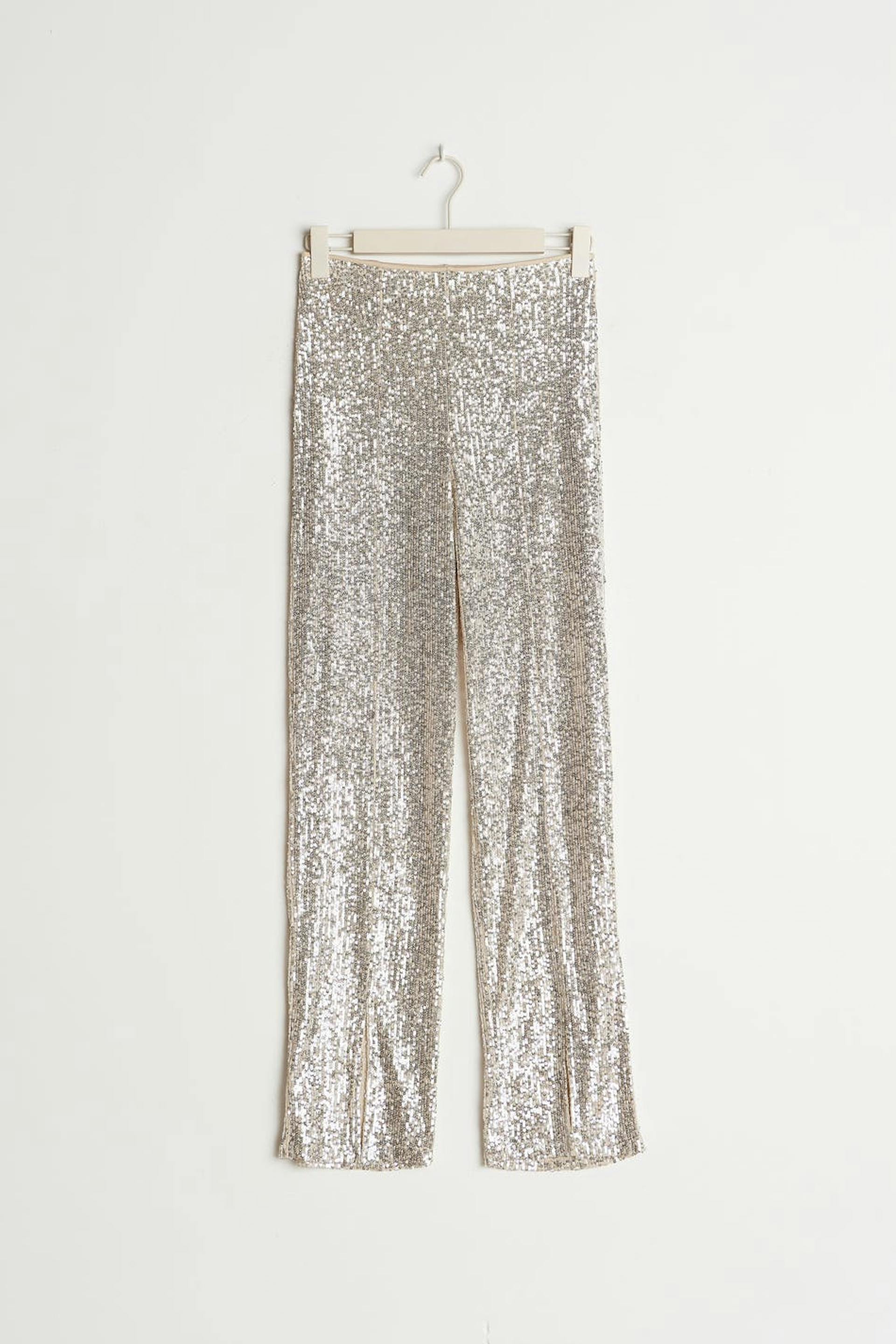 Pailletten broeken met spleet aan de onderkant. De broeken zijn perfect voor het feest en beige en hebben een nauwsluitende pasvorm. Het heeft een elastiek aan de taille en rechte broekspijpen met een volledige lengte.