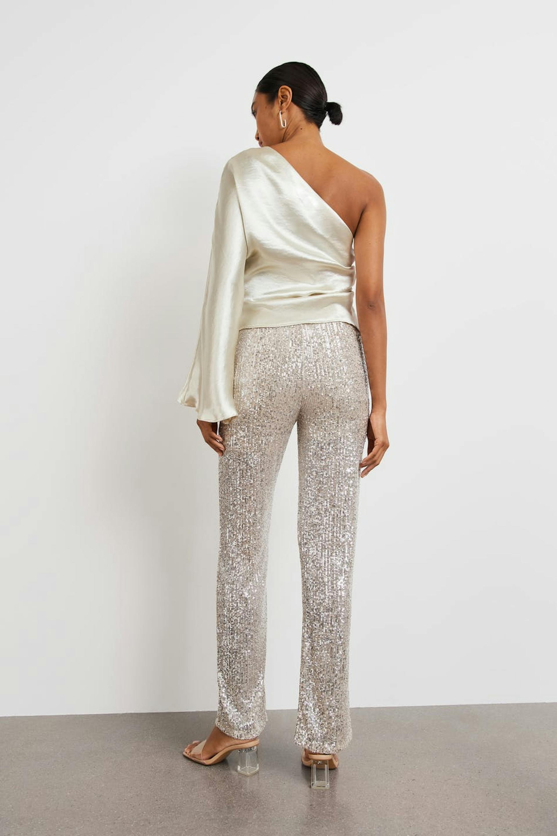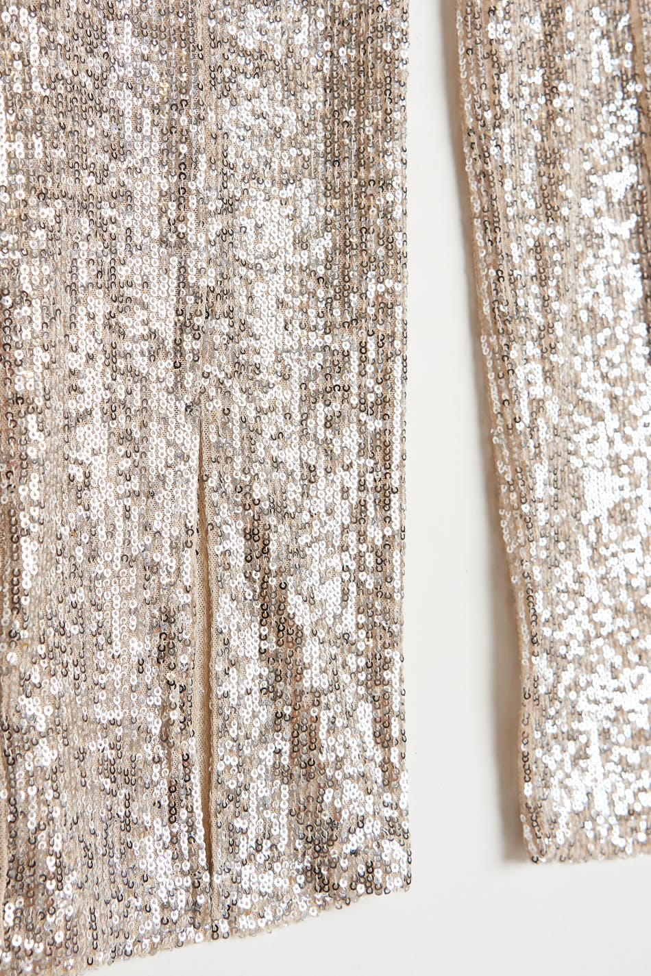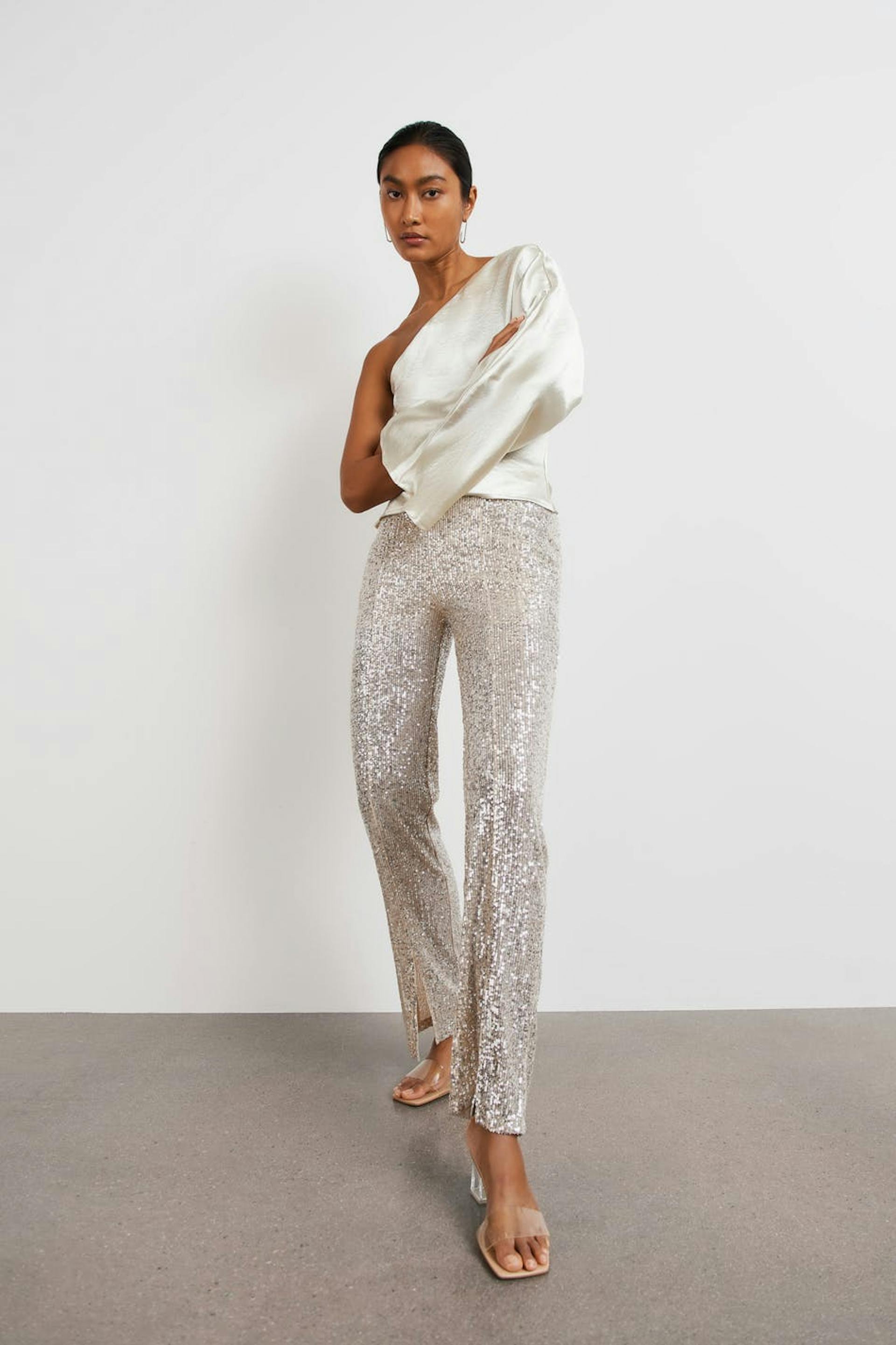 Pailletten broeken met spleet aan de onderkant. De broeken zijn perfect voor het feest en beige en hebben een nauwsluitende pasvorm. Het heeft een elastiek aan de taille en rechte broekspijpen met een volledige lengte.