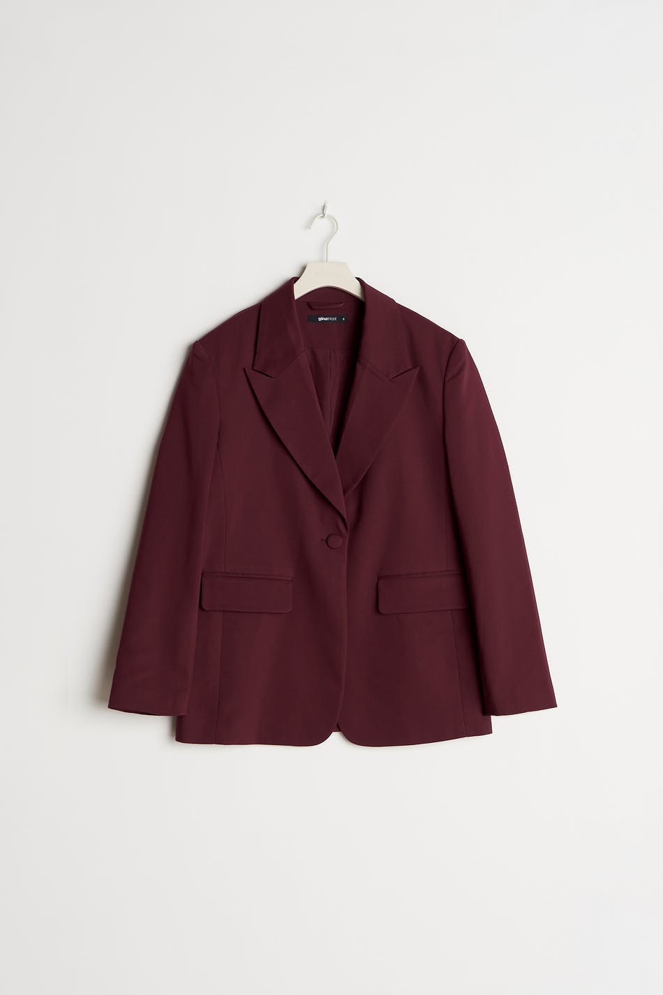 Single-breasted colbert met een ontspannen pasvorm. De colbert is wijnrood en heeft voorste klepzakken. Het heeft schoudervullingen en een omvouwbare kraag.