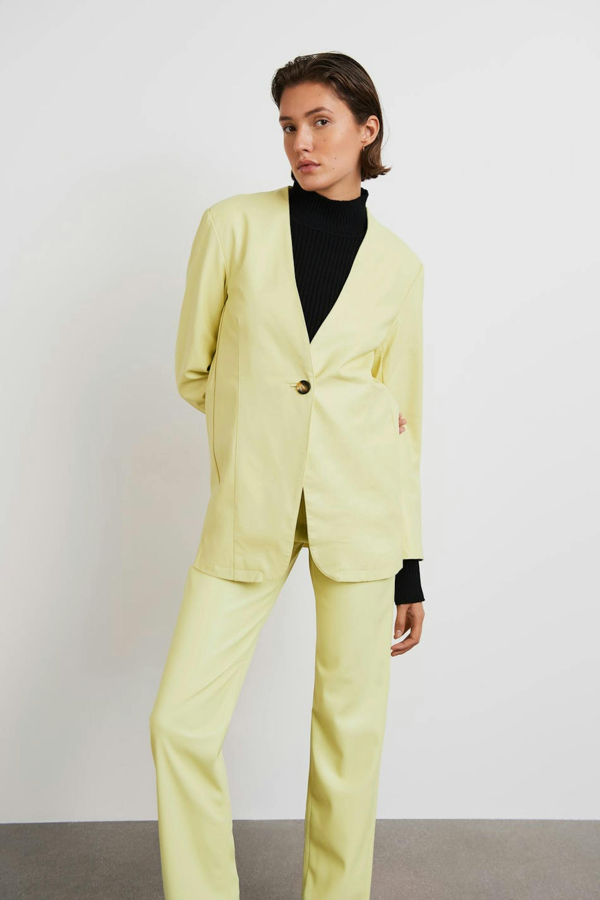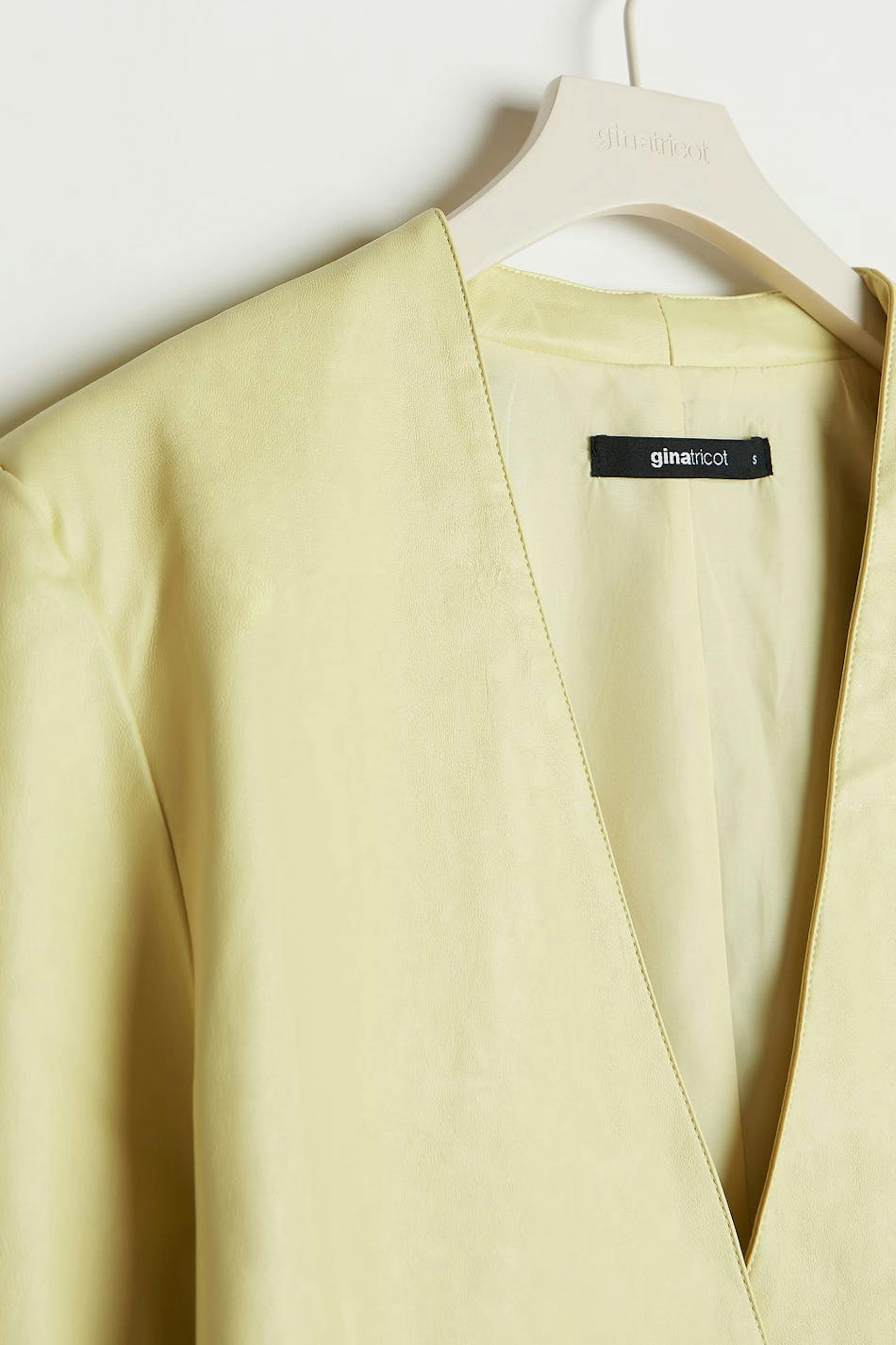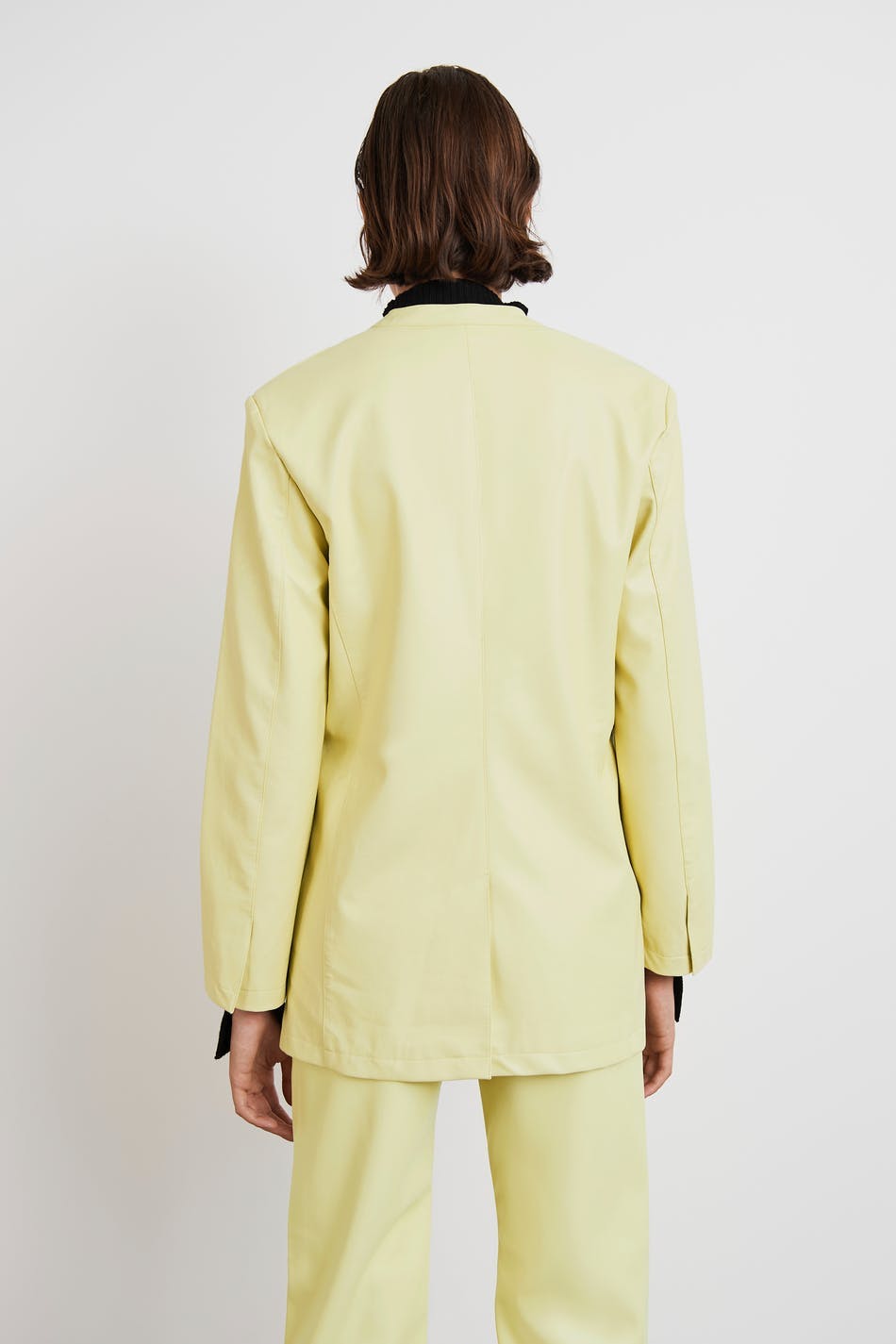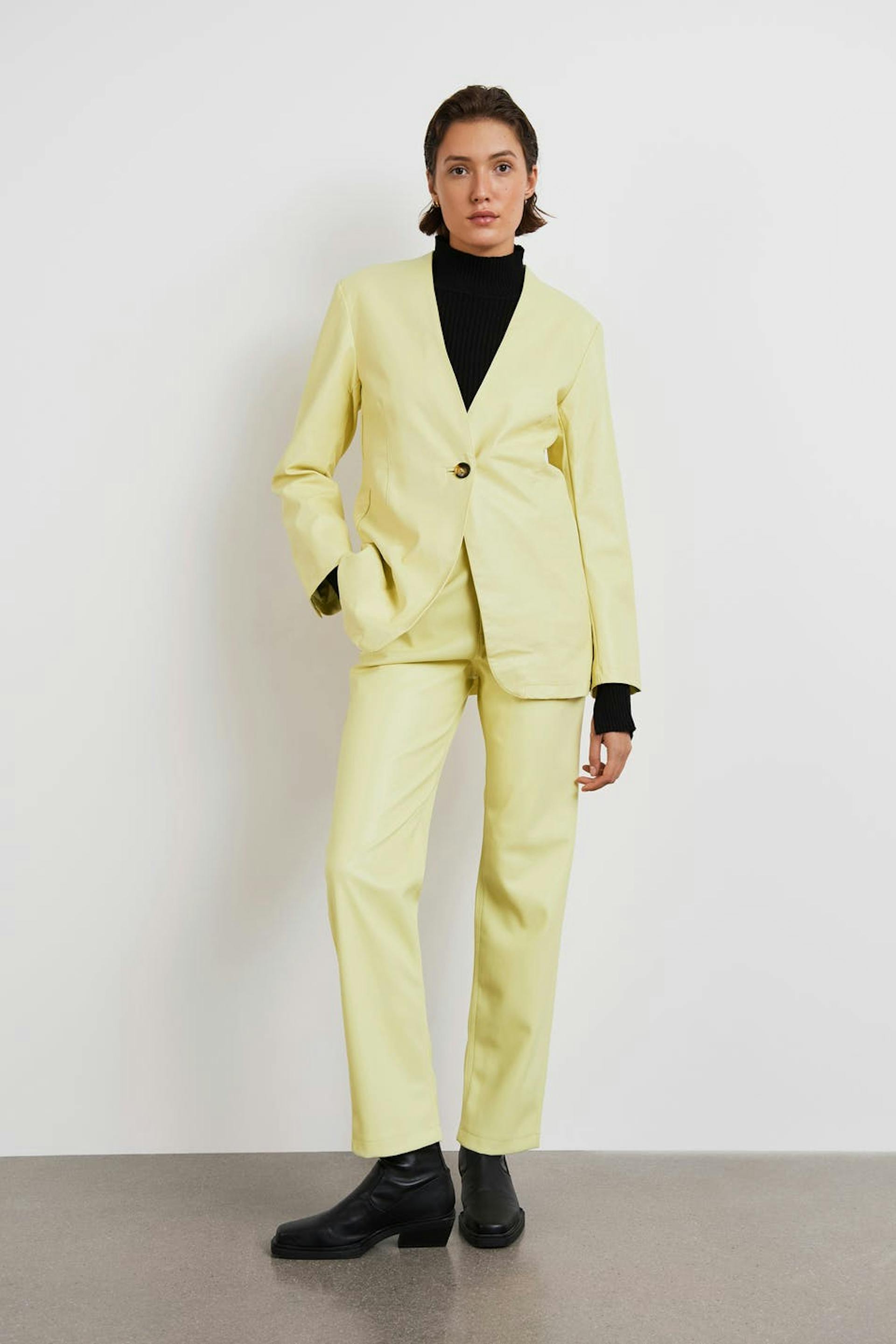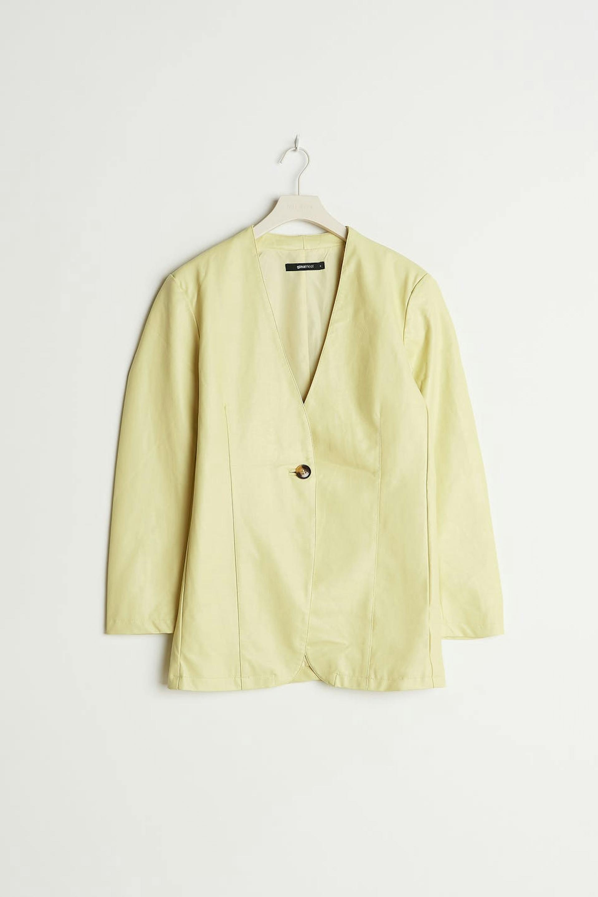 Single-breasted colbert met een ontspannen pasvorm. De colbert is geel en heeft een materiaal uit namaakleer. Het heeft een v-hals, een borstzak aan de binnenkant en een spleet achter.