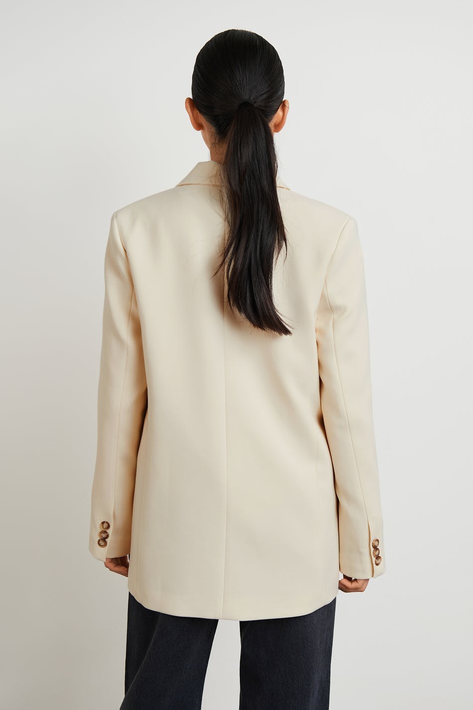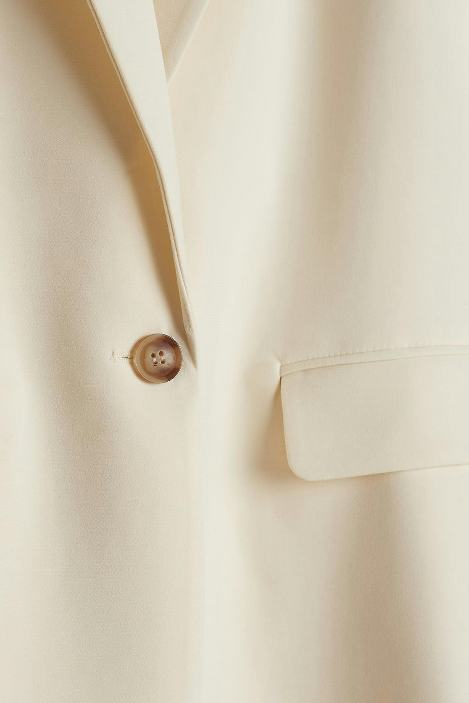 Colbert met een ontspannen pasvorm. De colbert is beige en heeft een grote knop aan de voorkant. Het heeft decoratieve knoppen aan de uiteinden van de mouwen.