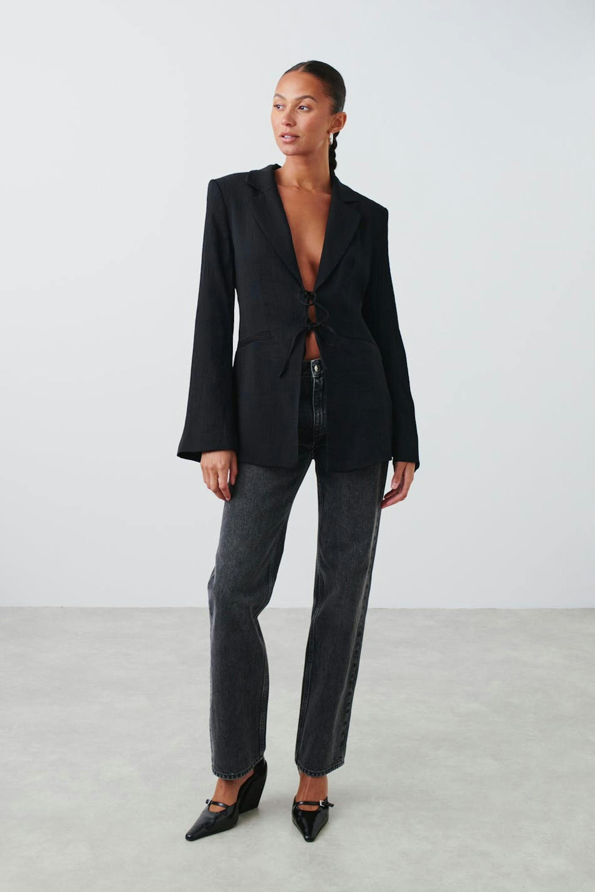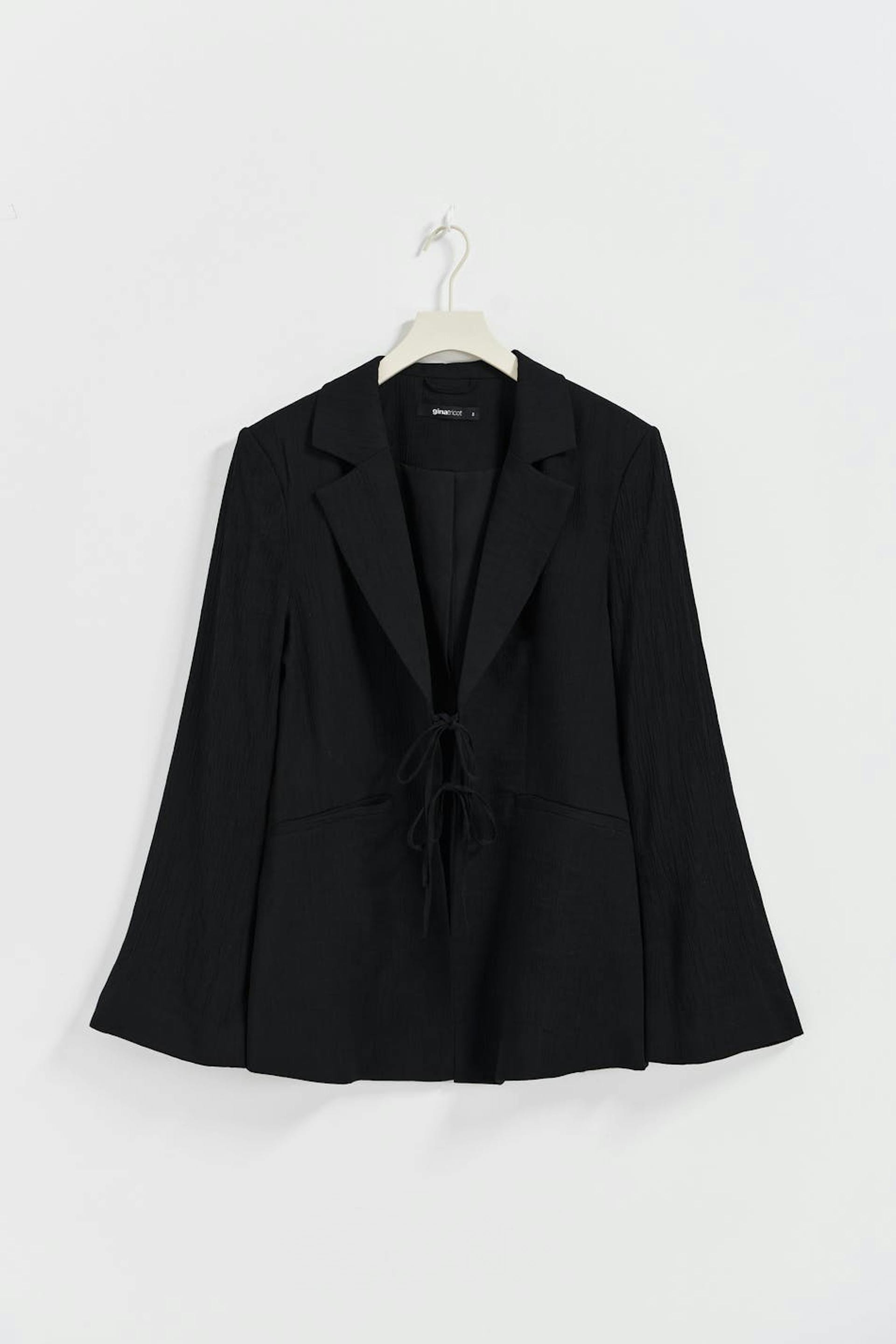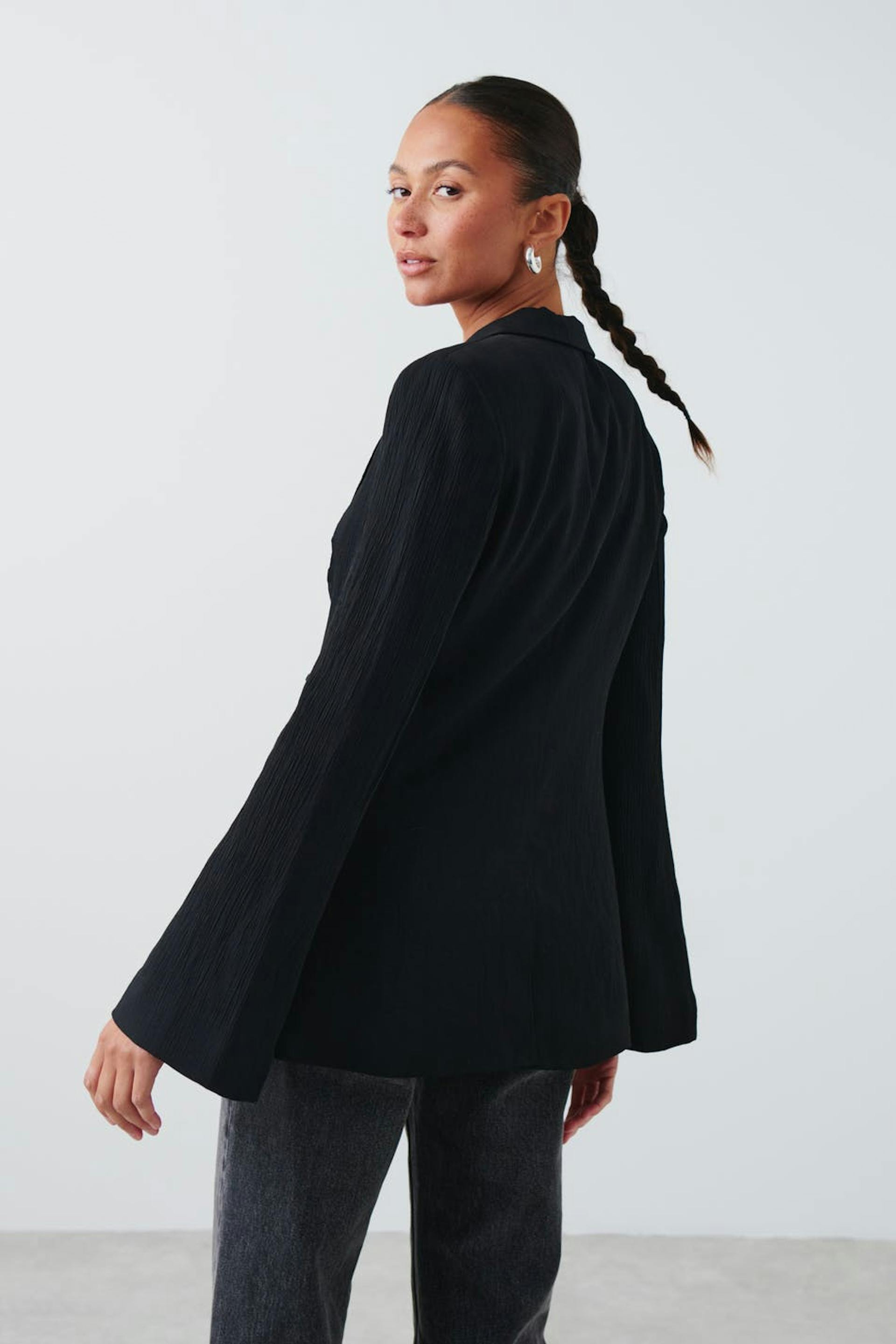 Gekreukte colbert met knoop sluiting aan de voorkant. De colbert is zwart en heeft lantaarnmouw. Het heeft nauwsluitende pasvorm en kraag met driehoekige haak revers.