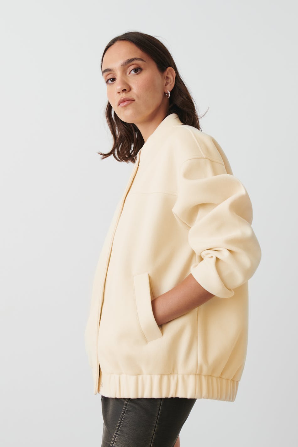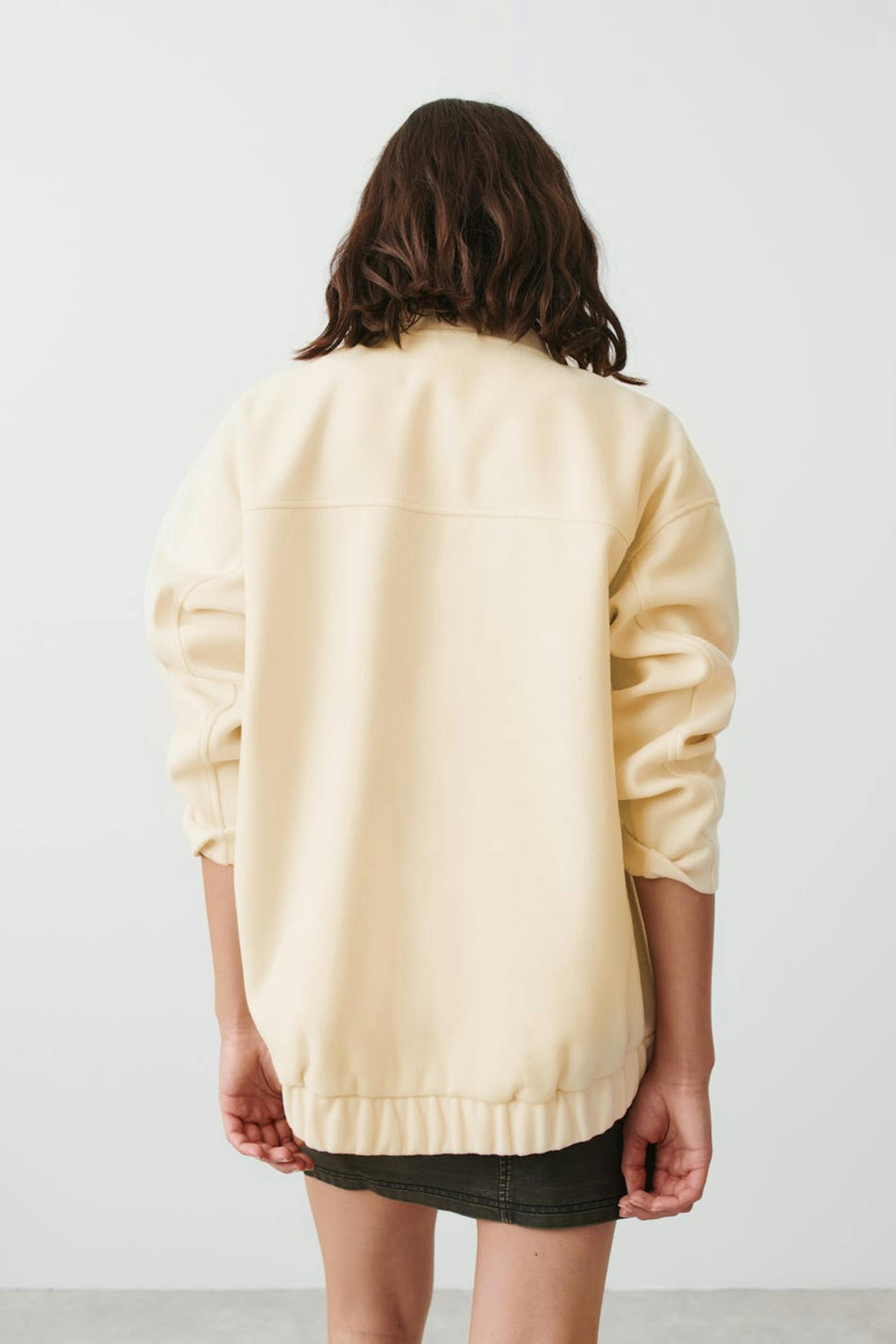 Lange bomberjas met overmaatse pasvorm. De jas is wit en heeft hangende schouder. Het heeft zakken in de zijden en elastiek aan de onderkant.