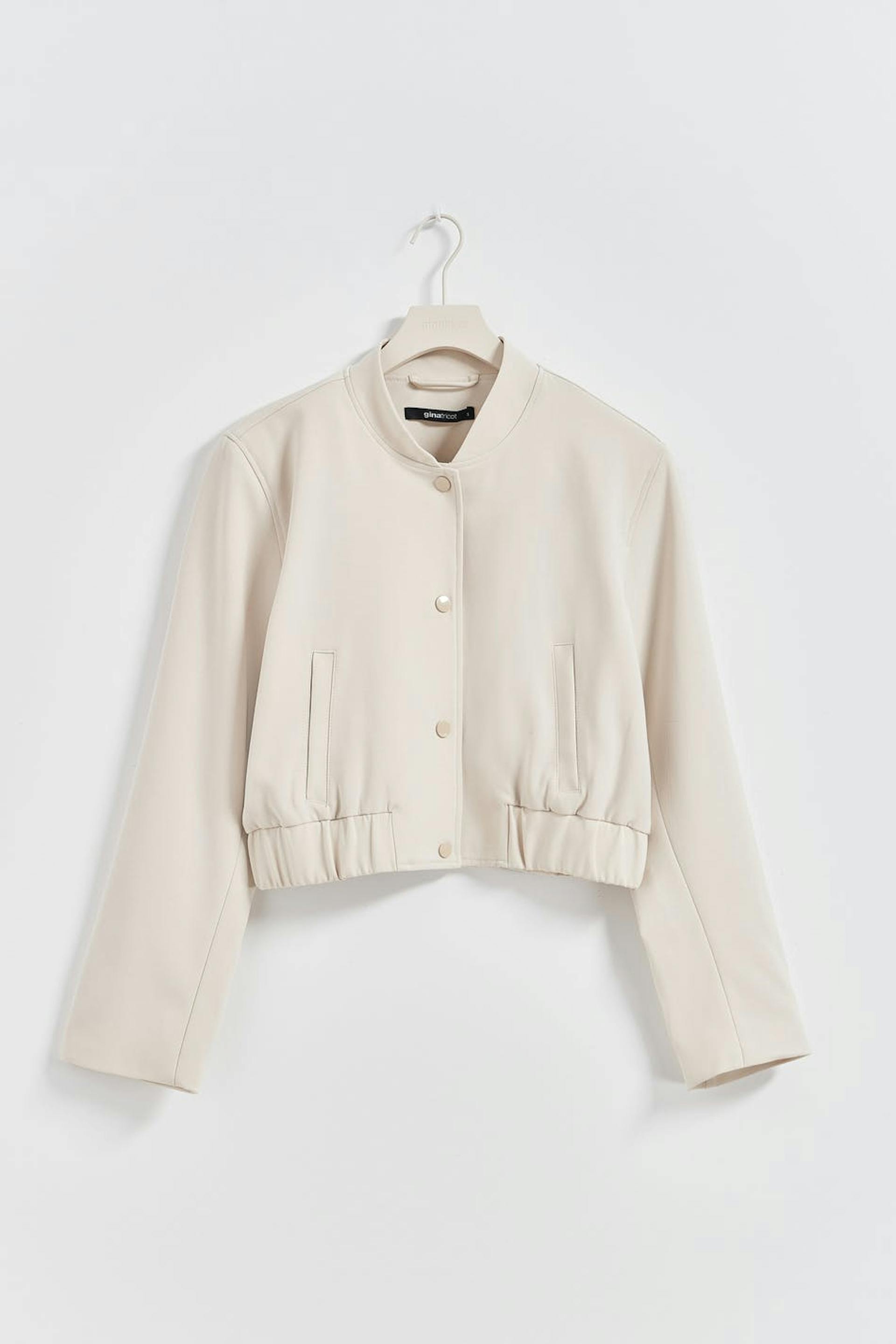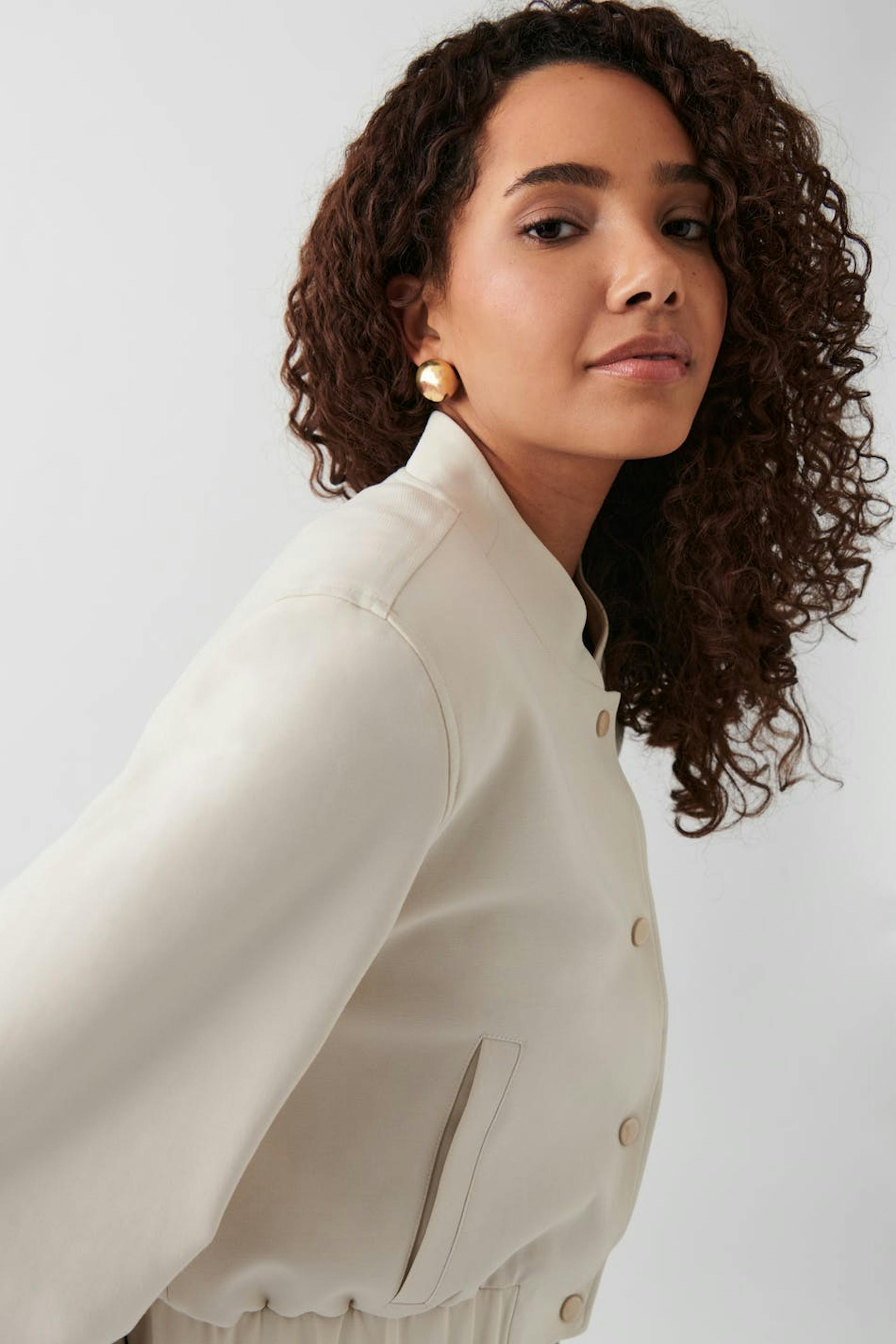 Korte bomberjas met drukknopen aan de voorkant. De jas is beige, gevoerd en met lange mouwen. Het heeft kraag en zakken in de zijden.