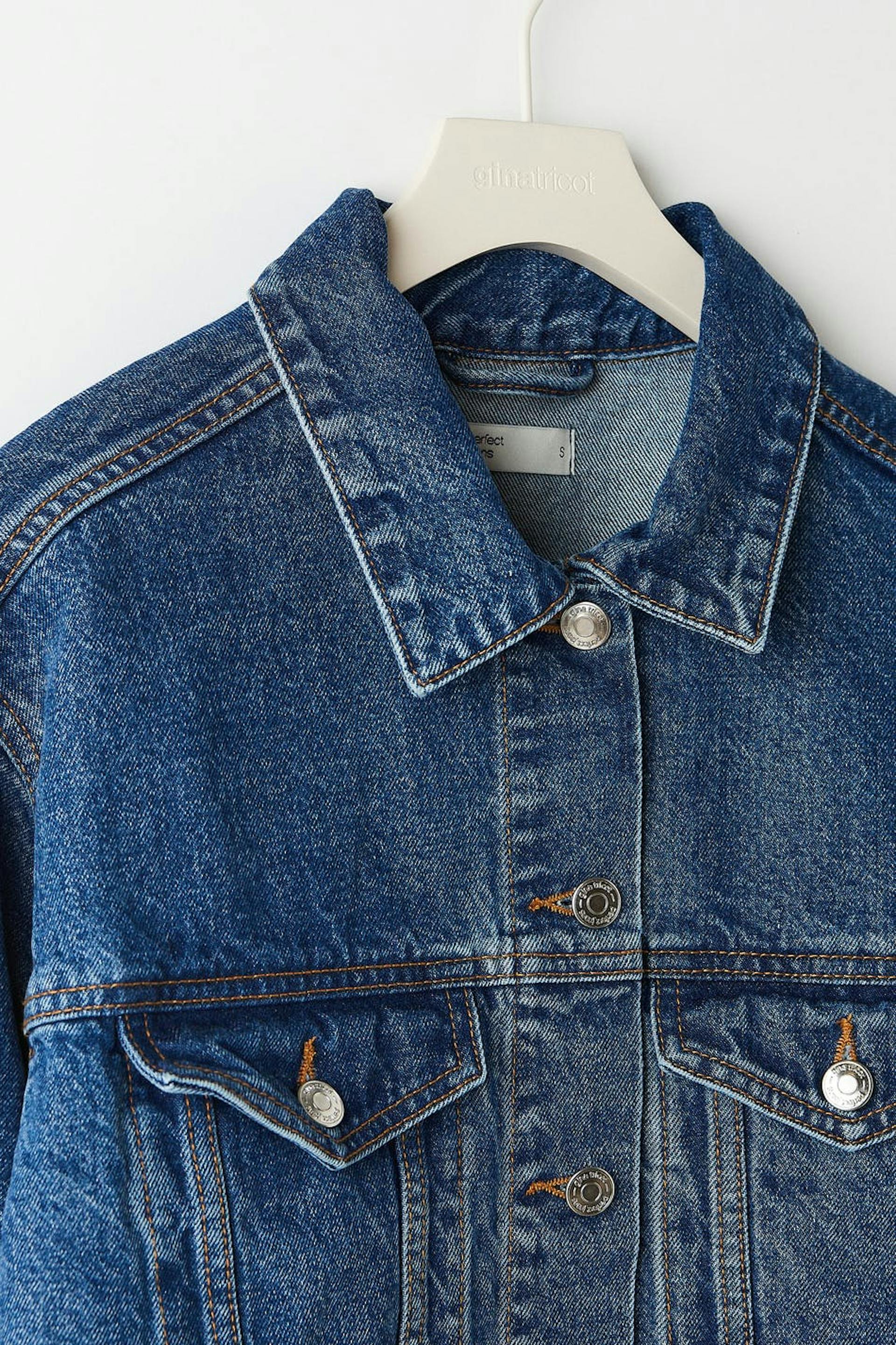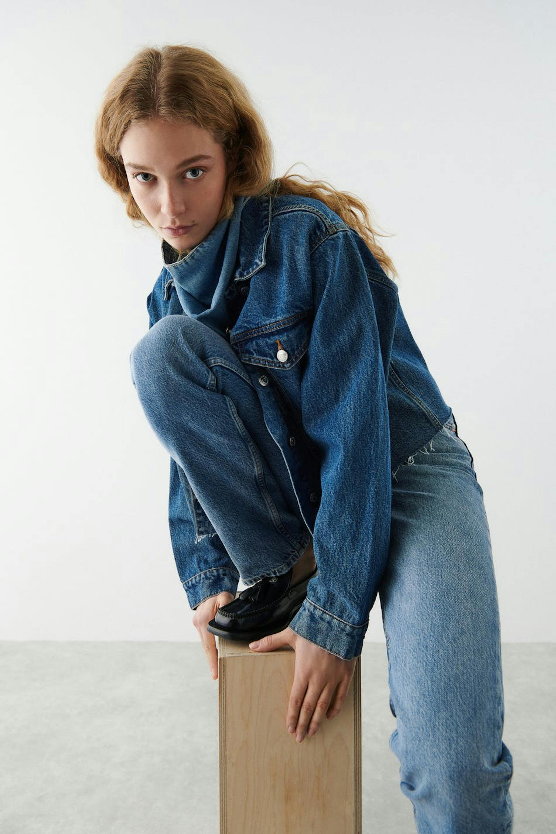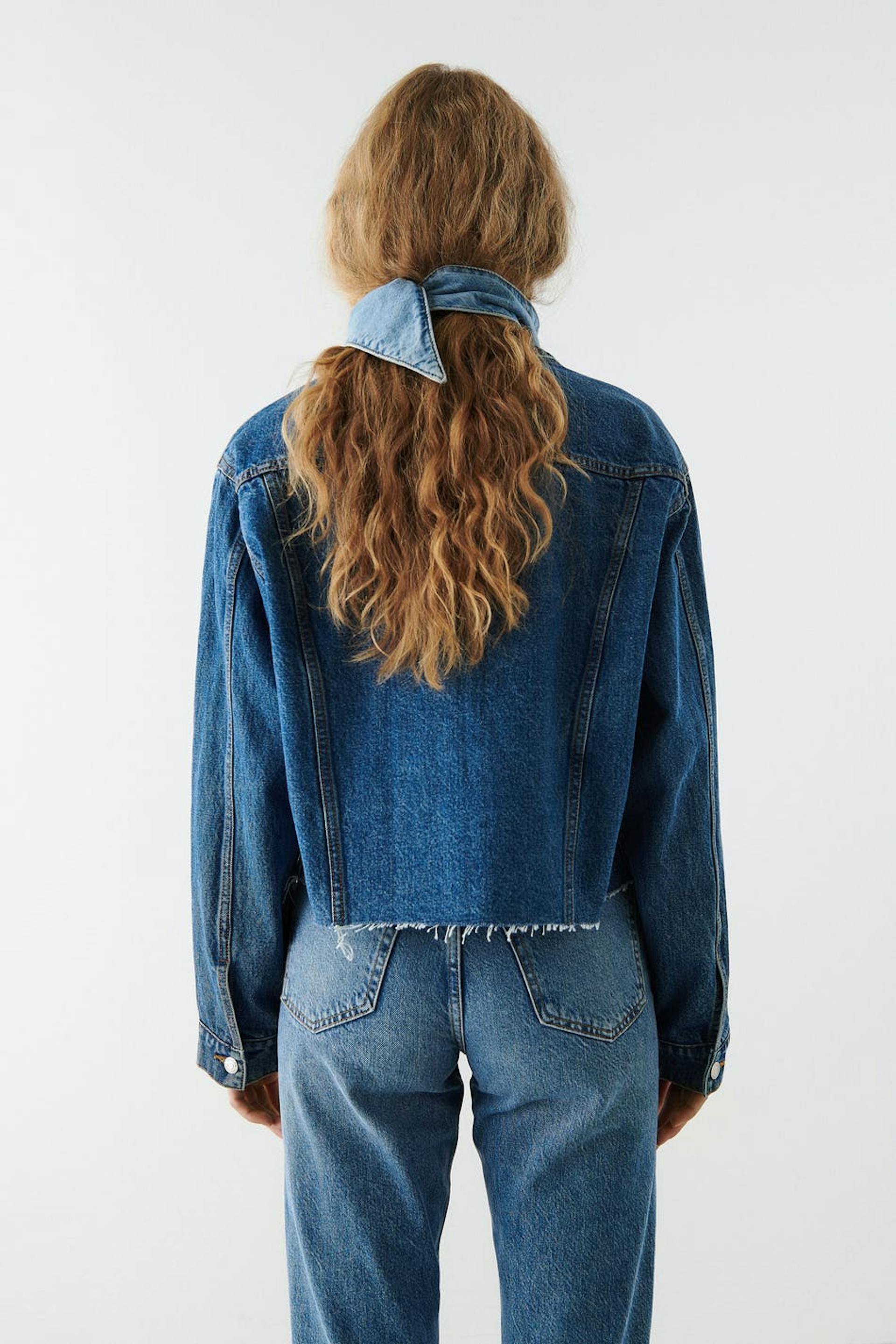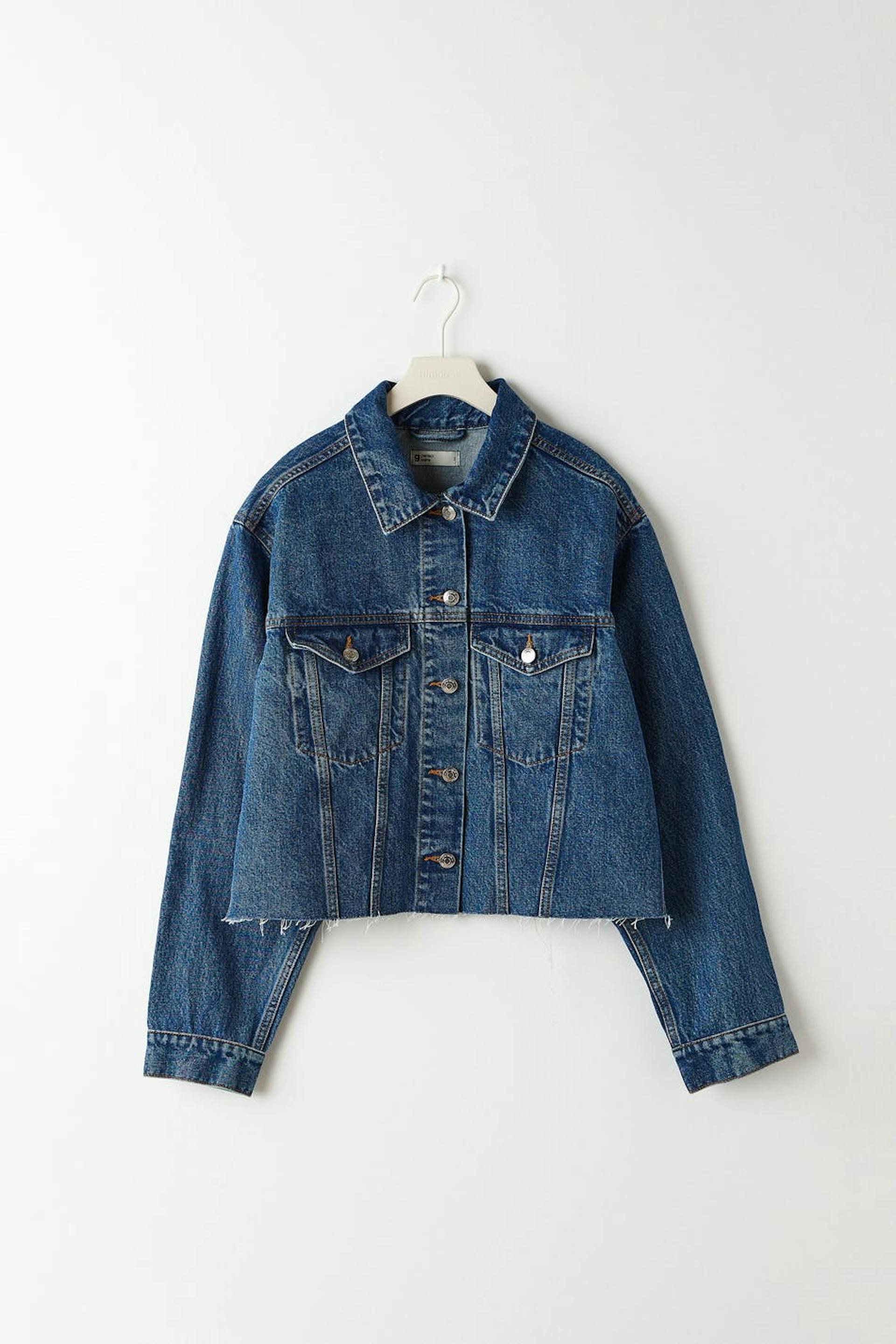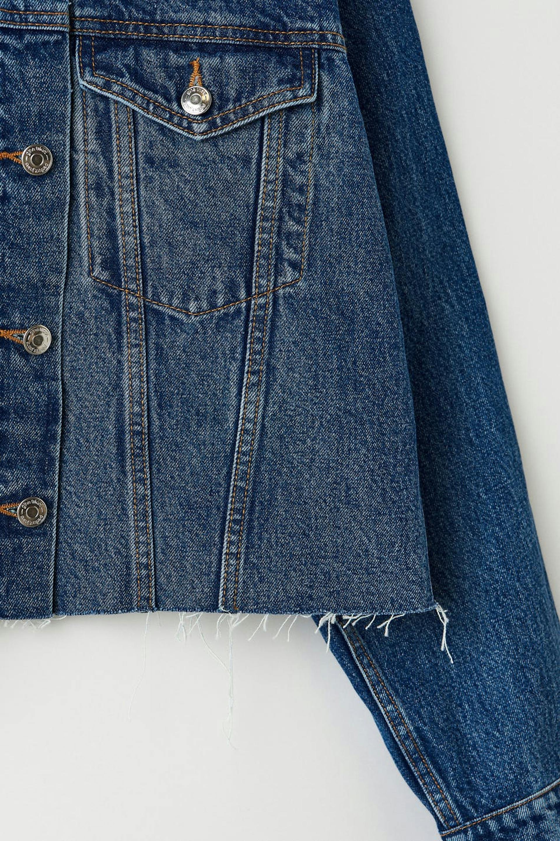 Korte denim jas met ruwe rand aan de onderkant. De jas is blauw en heeft boxy pasvorm van niet-elastisch denim. Het heeft kraag, borstzakken en knooppas aan de voorzijde.