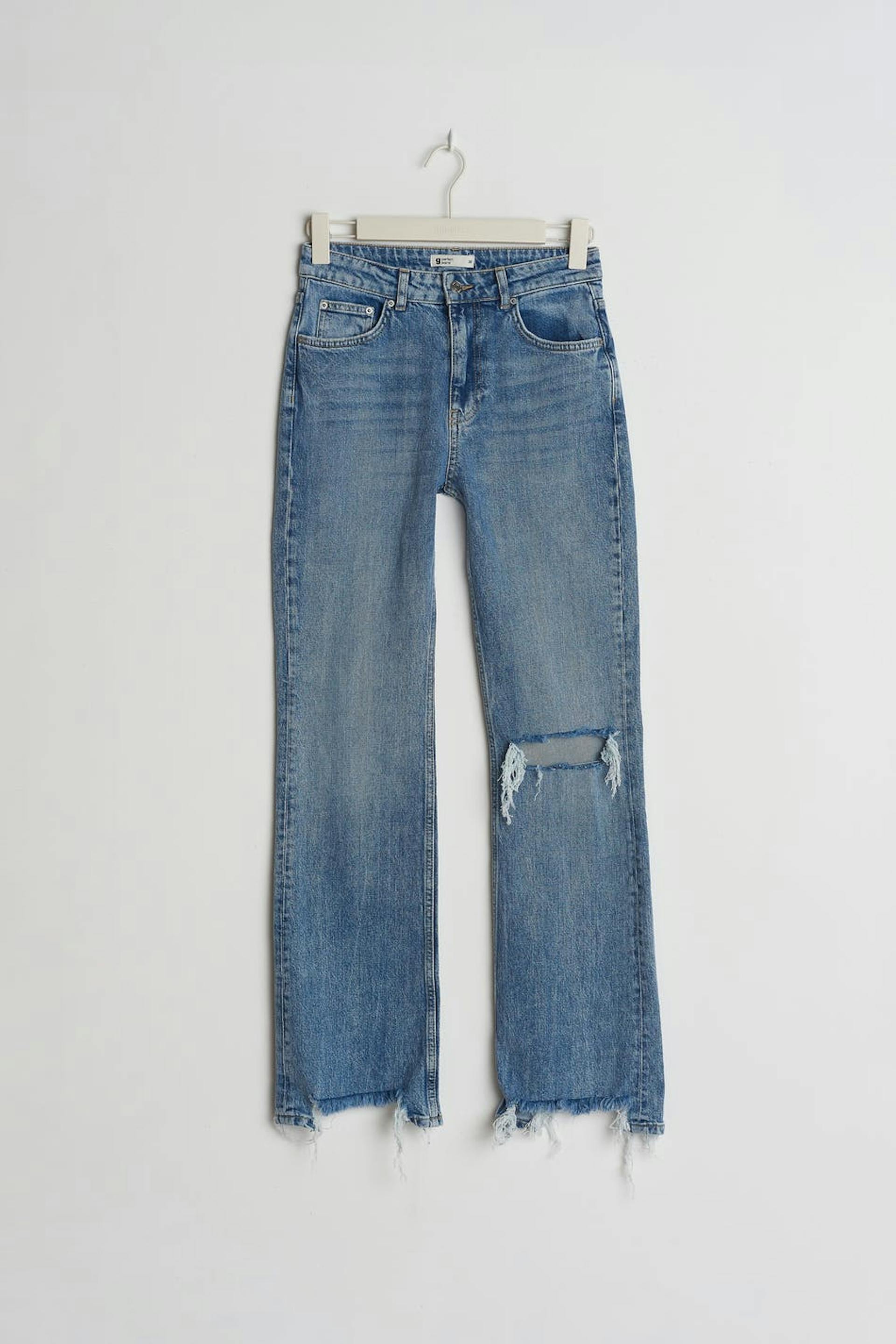 Petite bootcut jeans met gescheurde knie. De spijkerbroek is blauw en heeft midden taille. Het heeft een slanke pasvorm van stretch denim, flared benen met volledige lengte en gulp. Perfect voor personen die 160 cm (5 ft 3 in.) of kleiner zijn. Gebruik onze maattabel om je maat te vinden.