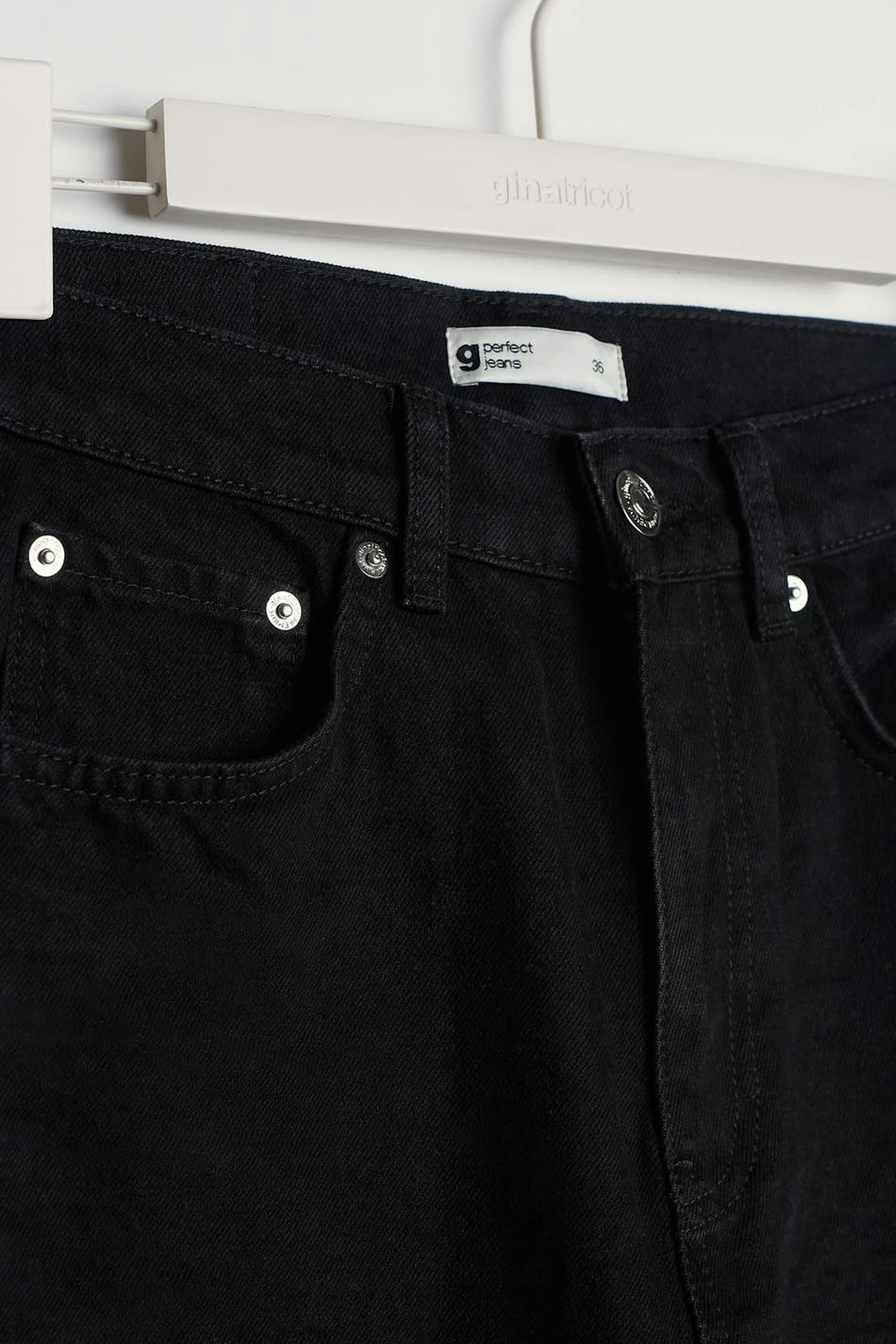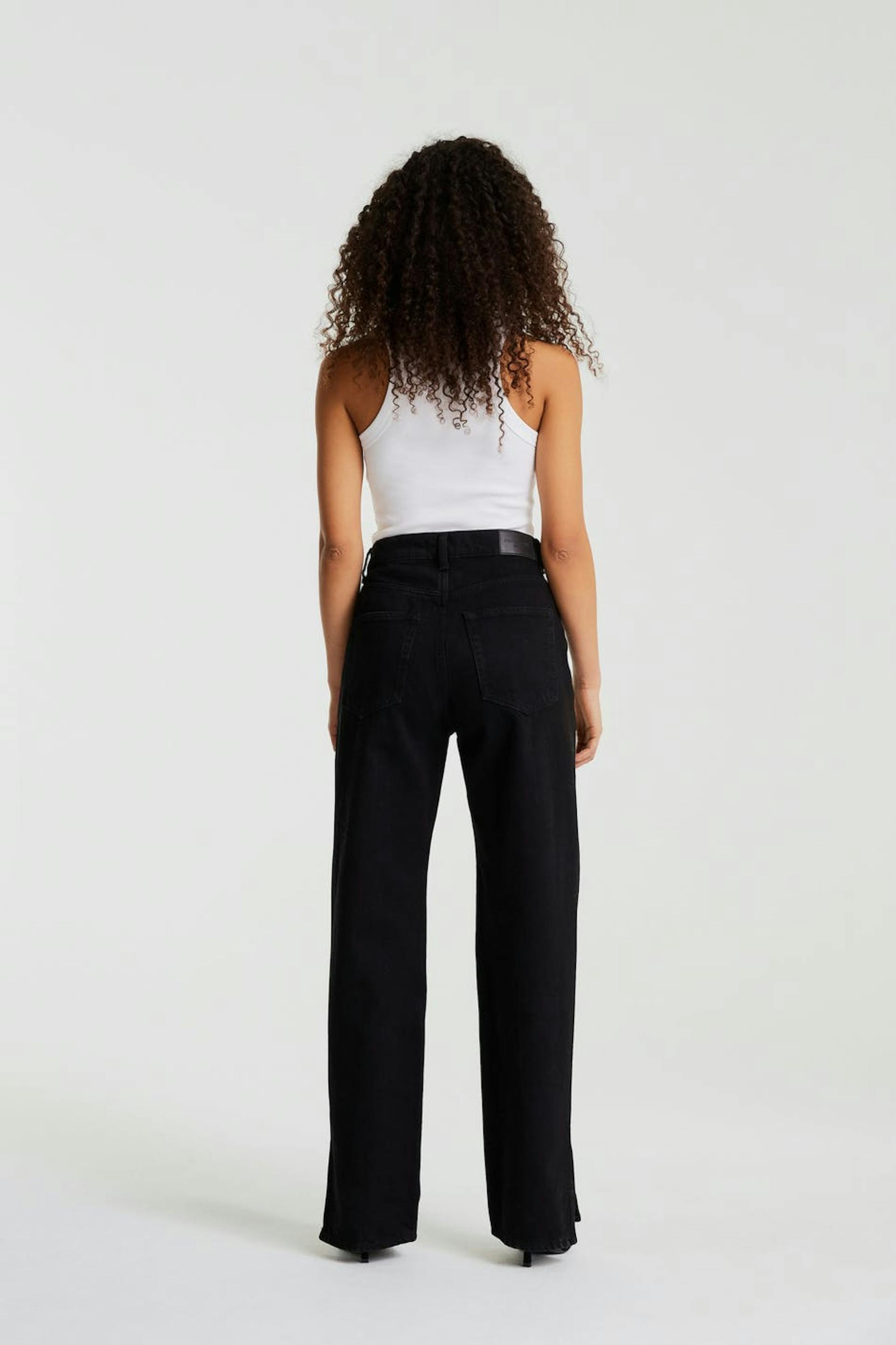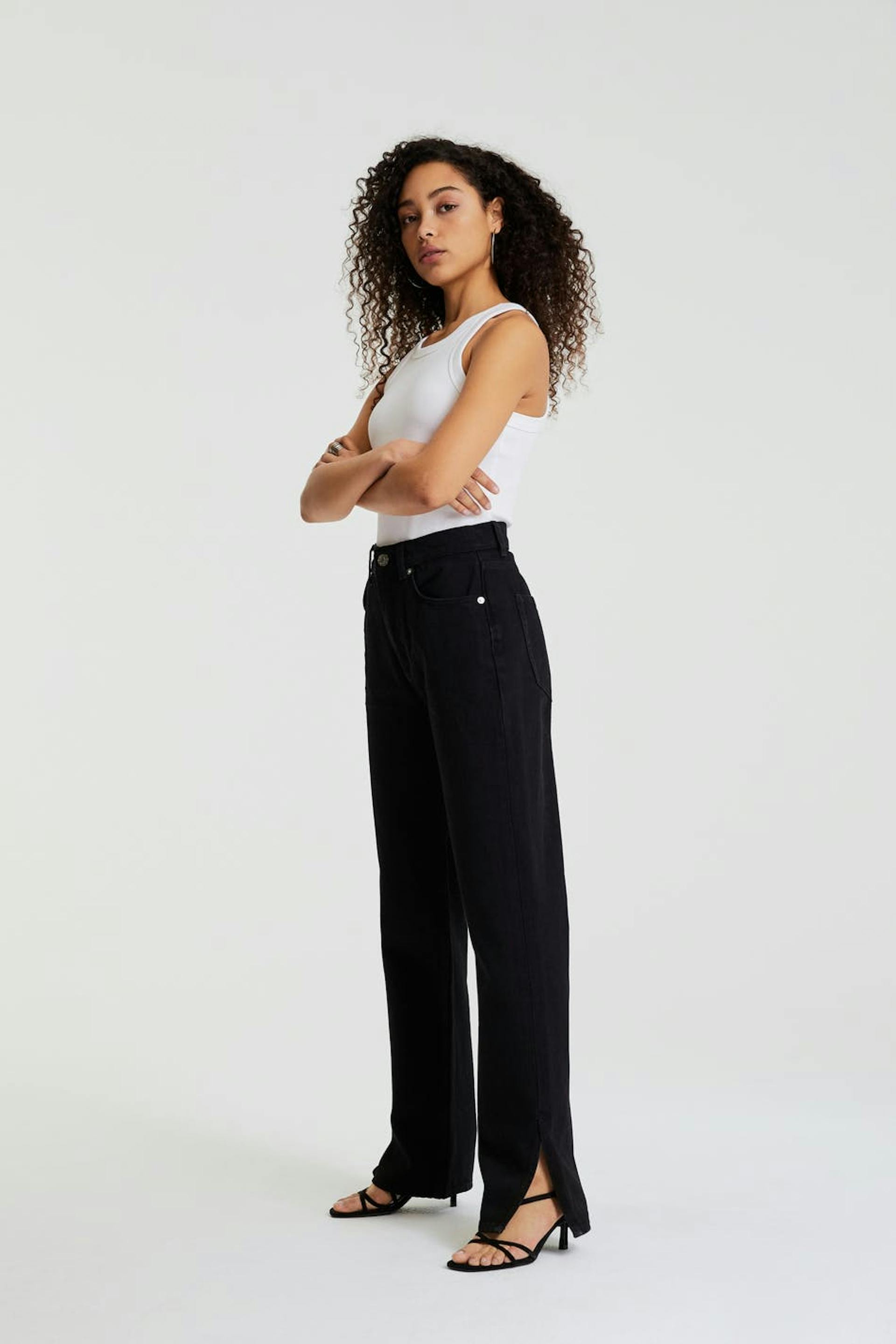 Petite spijkerbroek met hoge taille. De spijkerbroek is zwart en heeft een geïnspireerd op de jaren'90 pasvorm. Het is gemaakt van niet-elastisch denim en heeft broekspijpen met volledige lengte, spleet aan het uiteinde van de benen en zakken aan de voor- en achterzijde. Perfect voor personen die 160 cm (5 ft 3 in.) of kleiner zijn..