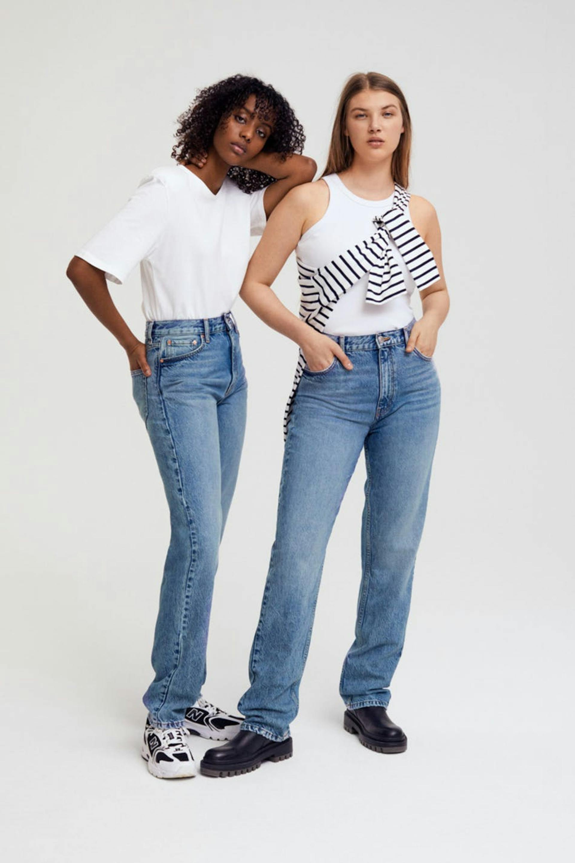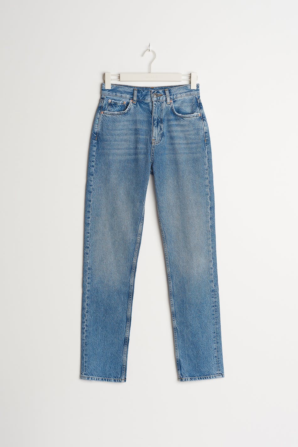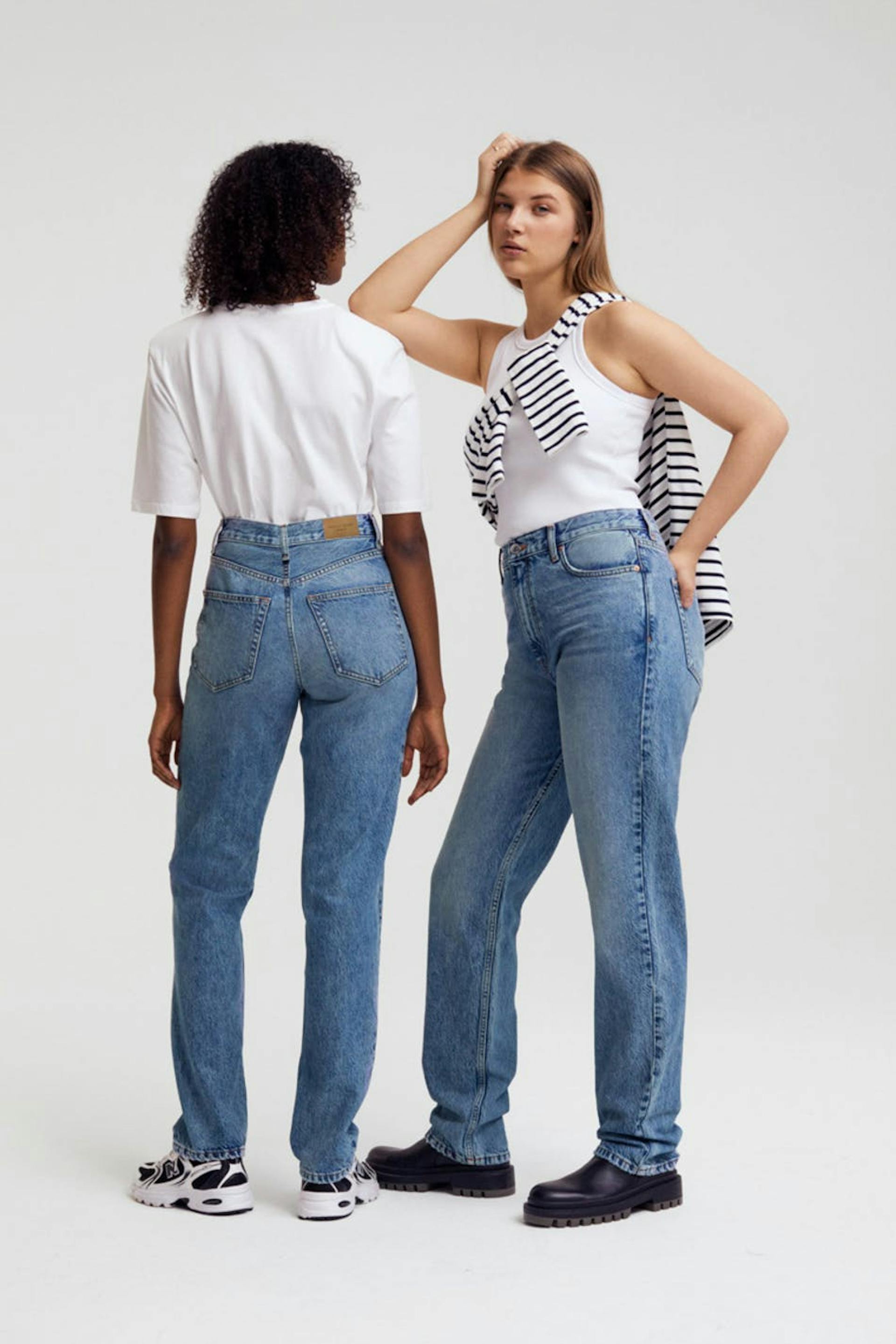 Rekvrije spijkerbroek met een nauwsluitende en rechte pasvorm. De spijkerbroek is blauw en heeft een midden taille. Het heeft een gulp, rechte broekspijpen met volledige lengte en zakken aan de voor- en achterzijde. Gebruik onze maattabel om je maat te vinden.
