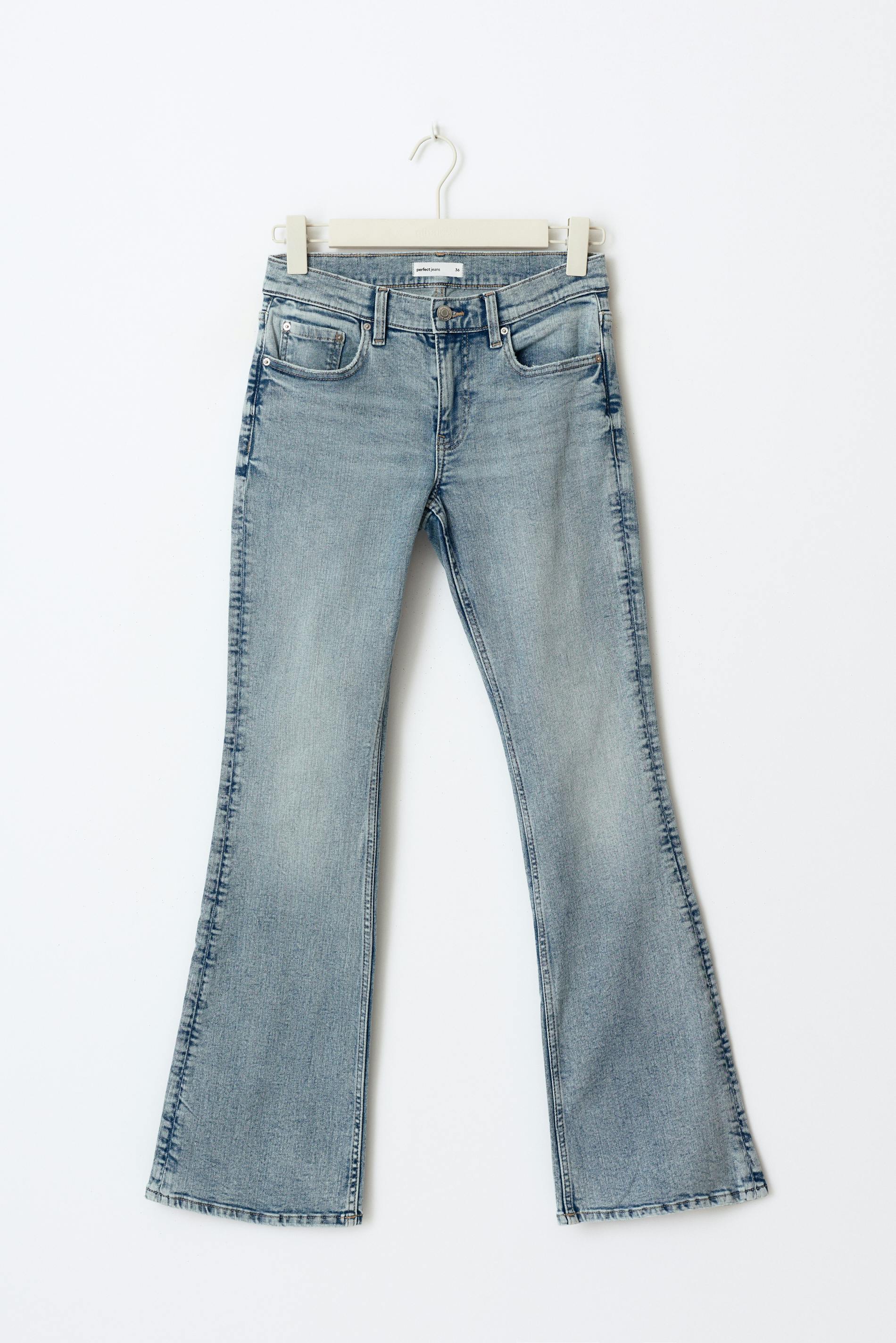 Bootcut jeans met extra-lange benen. De spijkerbroek is licht blauw en heeft lage taille. Het heeft uitlopende pijpen, nauwsluitende pasvorm, elastische kwaliteit, gulp en zakken aan de voor- en achterzijde. Perfect voor personen die 175 cm (5 ft 9 in.) of groter zijn.