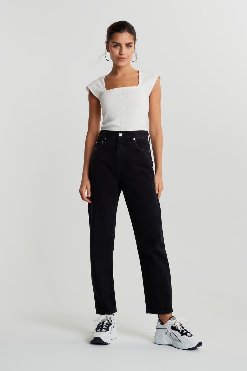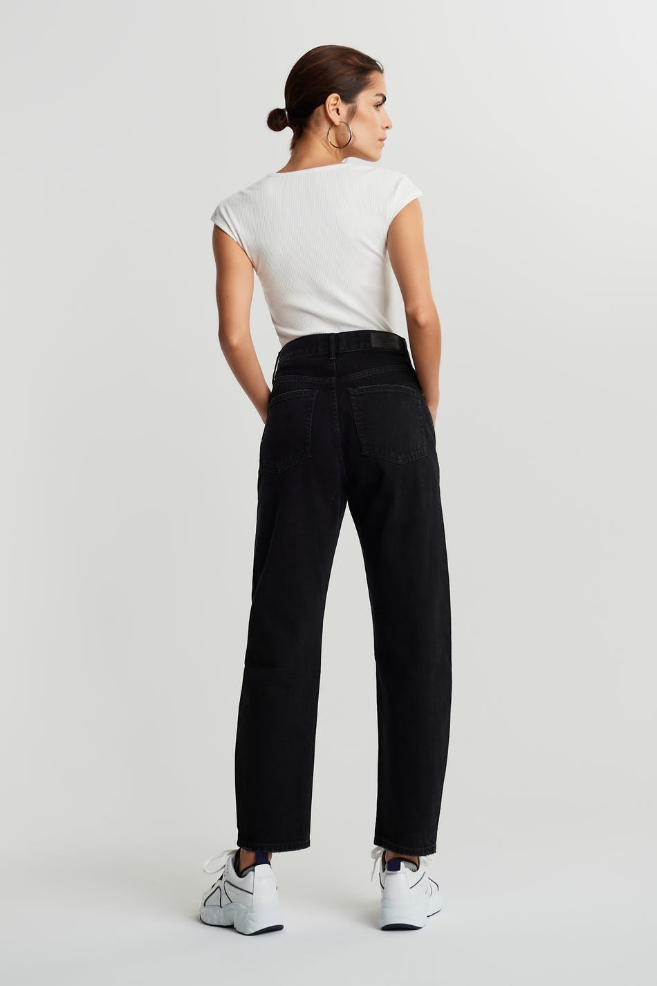 5-pocket relaxed mom jeans with high waist, zip fly and barrel legs. 100% authentic premium denim with no stretch in vintage wash. Supplier: Baykanlar Tekstil Sanayi Ve Ticaret Anonim Sirketi. Production Unit: Baykanlar Tekstil.