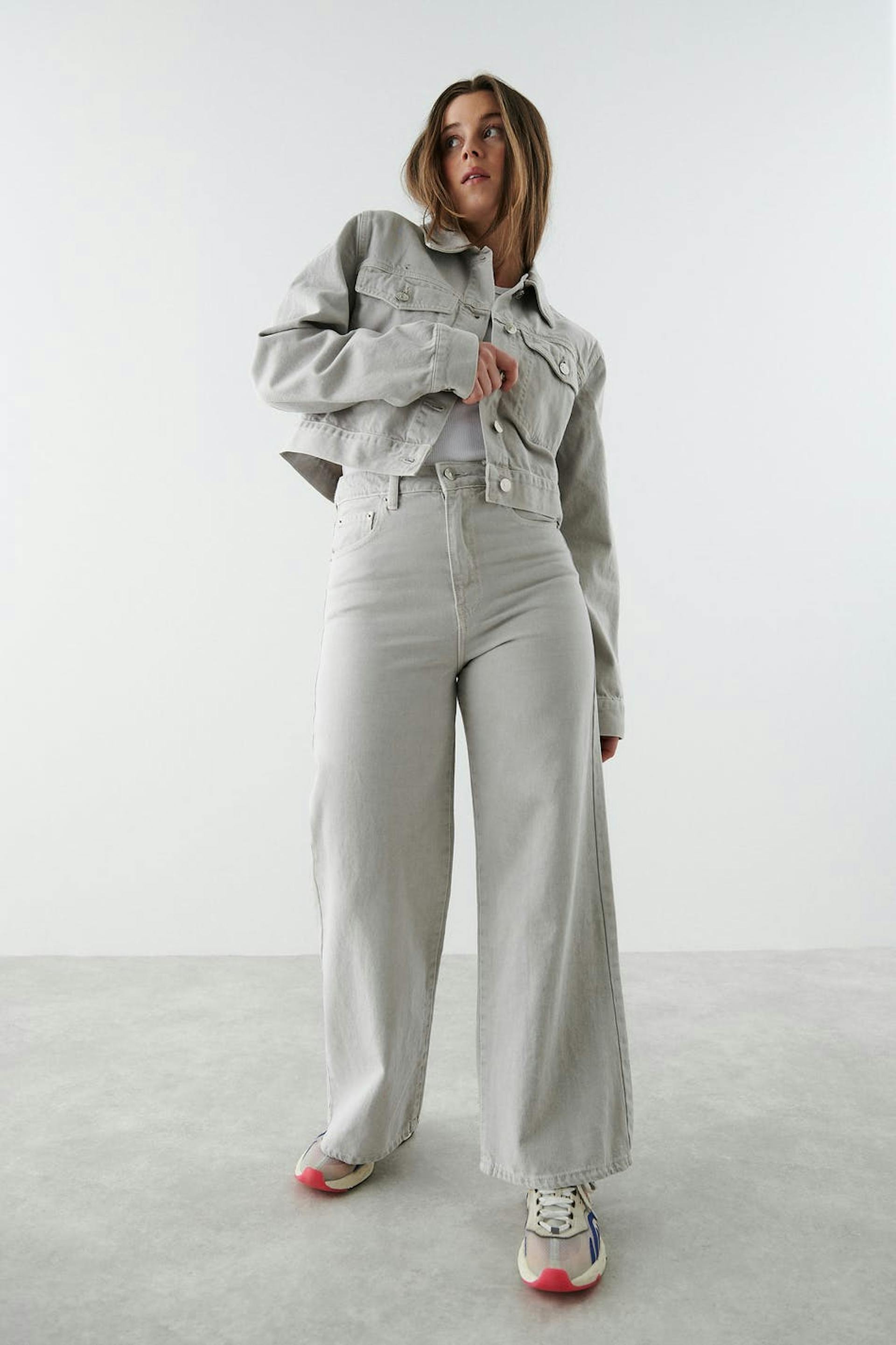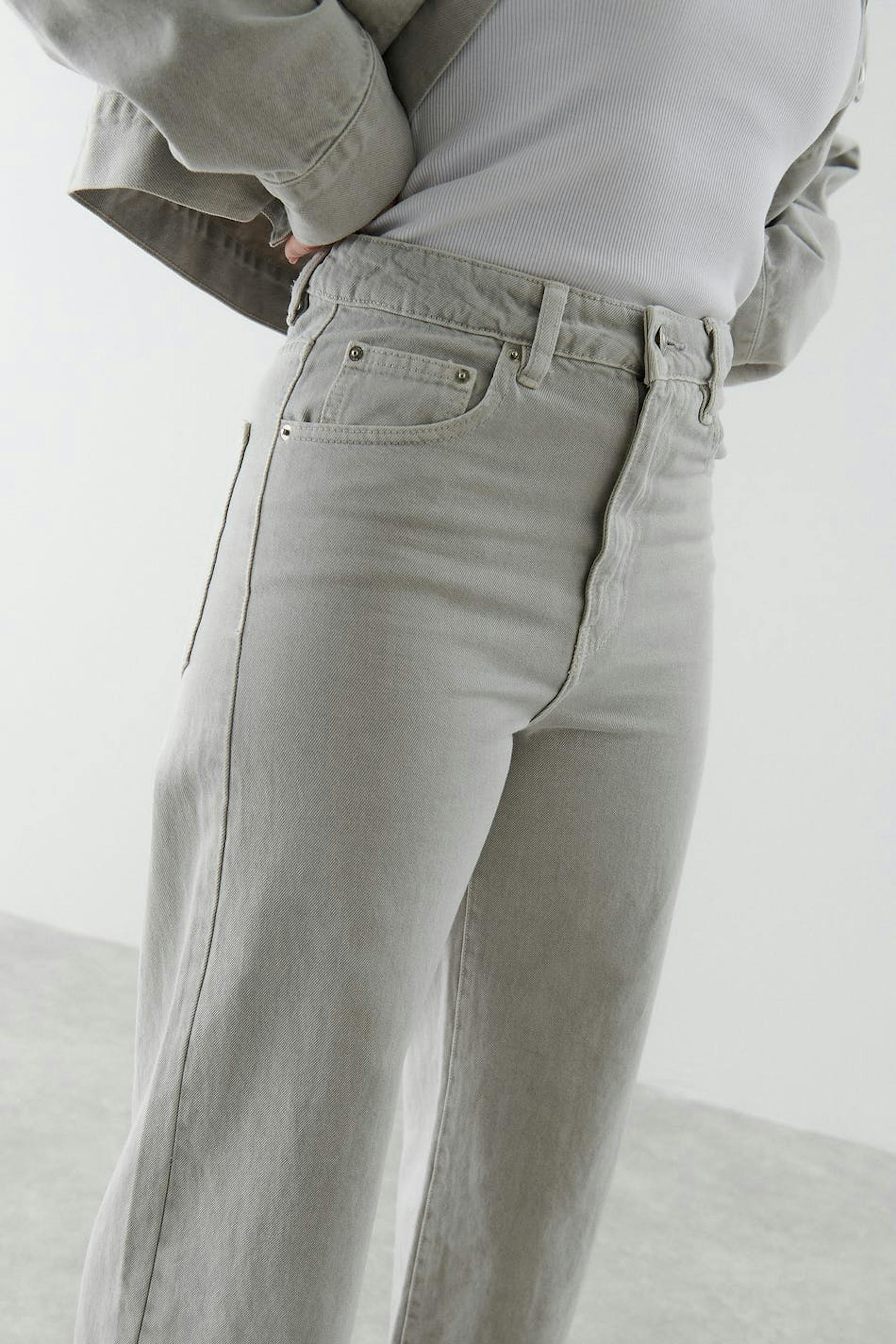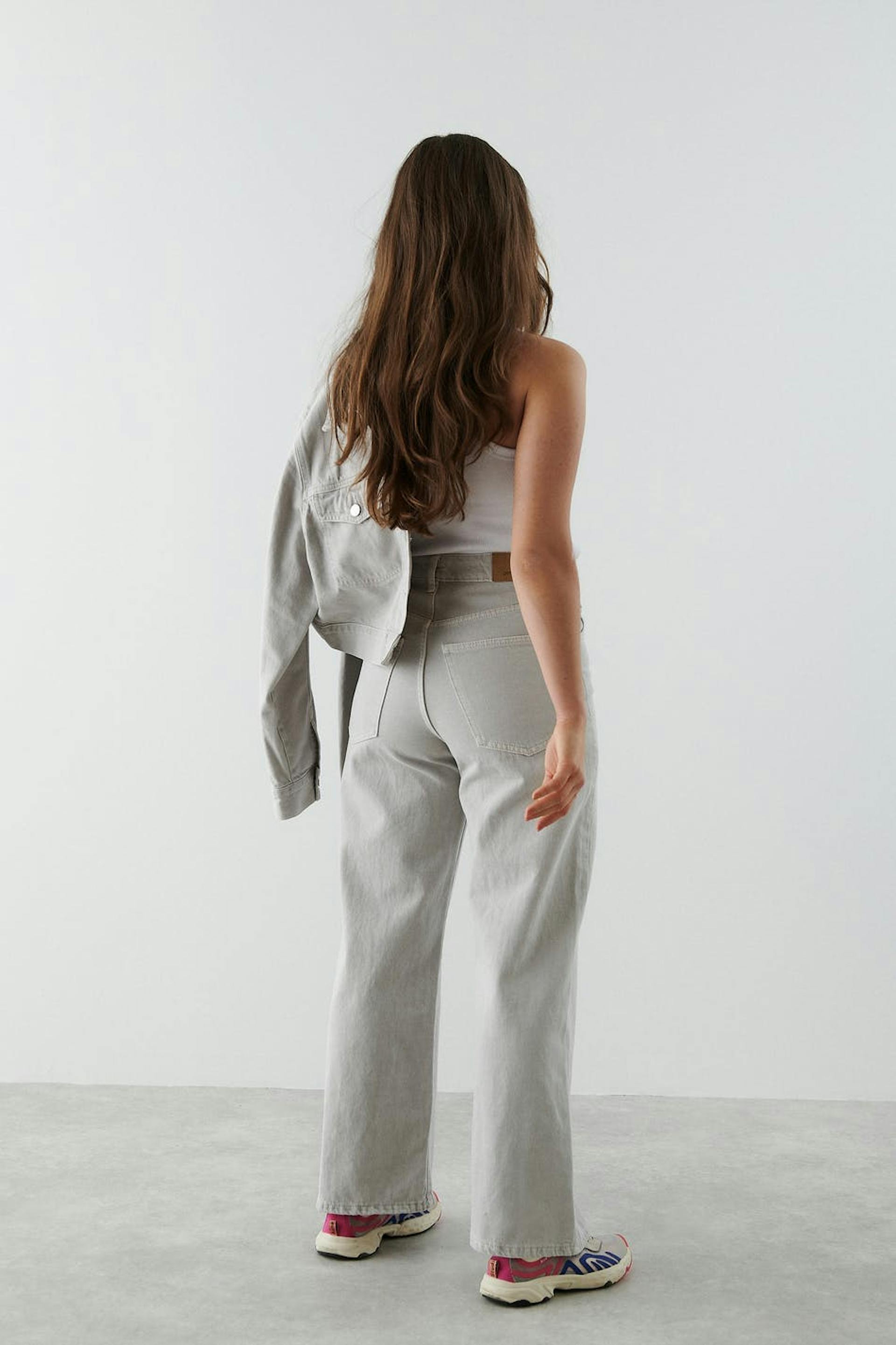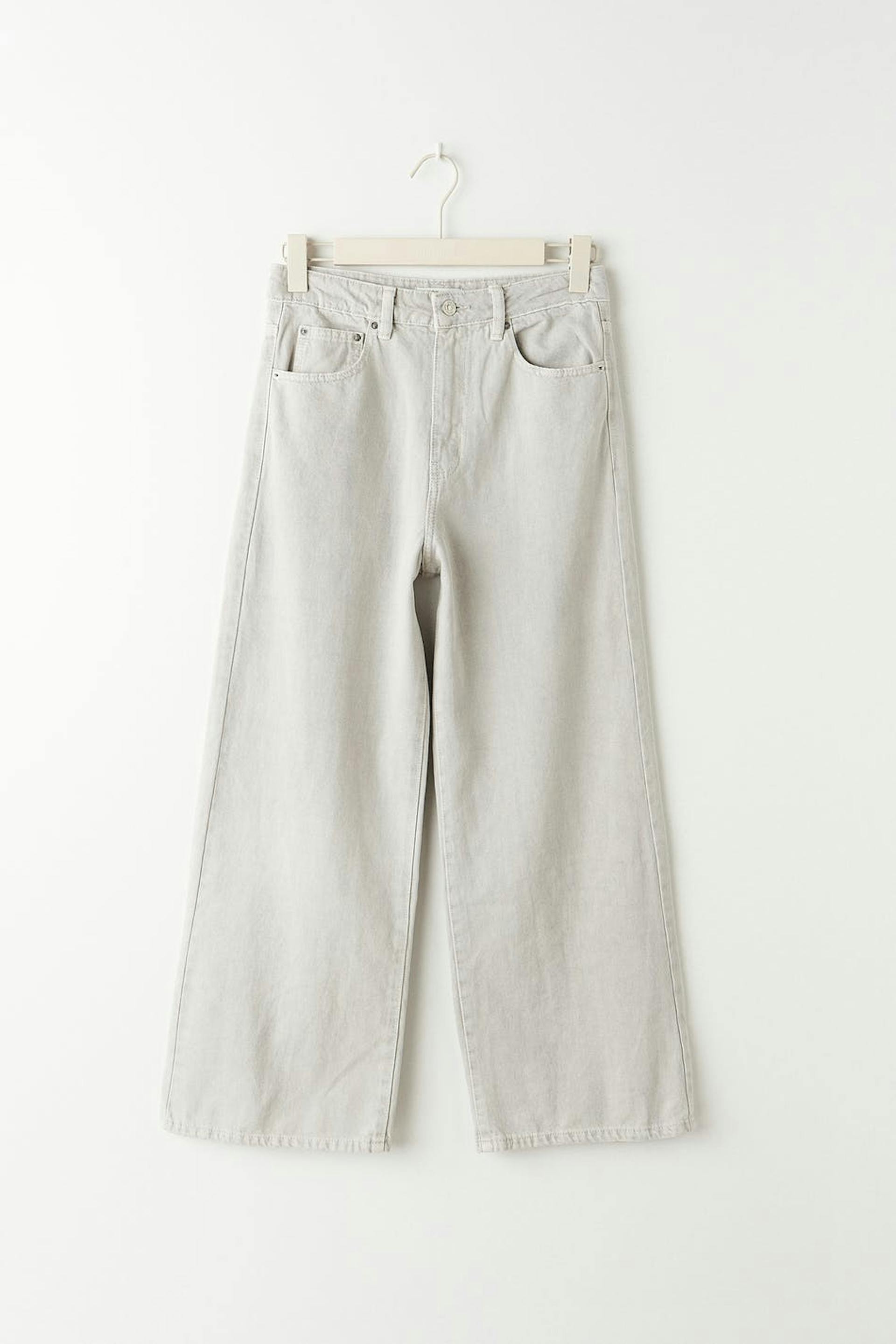Petite spijkerbroek met hoge taille van niet-elastisch denim. De spijkerbroek is grijs en heeft een gulp. Het heeft brede broekspijpen met normale lengte en zakken aan de voor- en achterzijde. Perfect voor personen die 160 cm (5 ft 3 in.) of kleiner zijn. Gebruik onze maattabel om je maat te vinden.