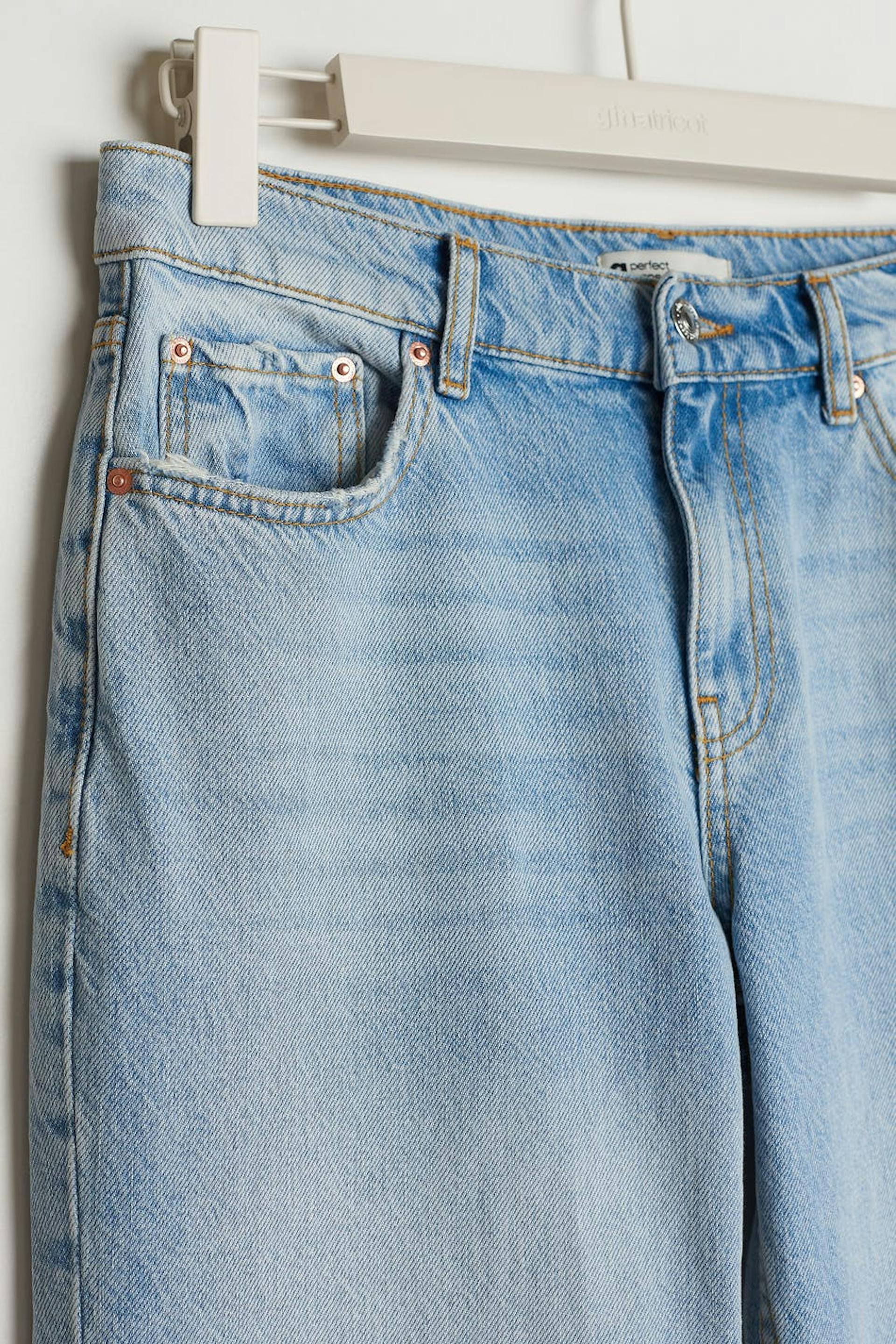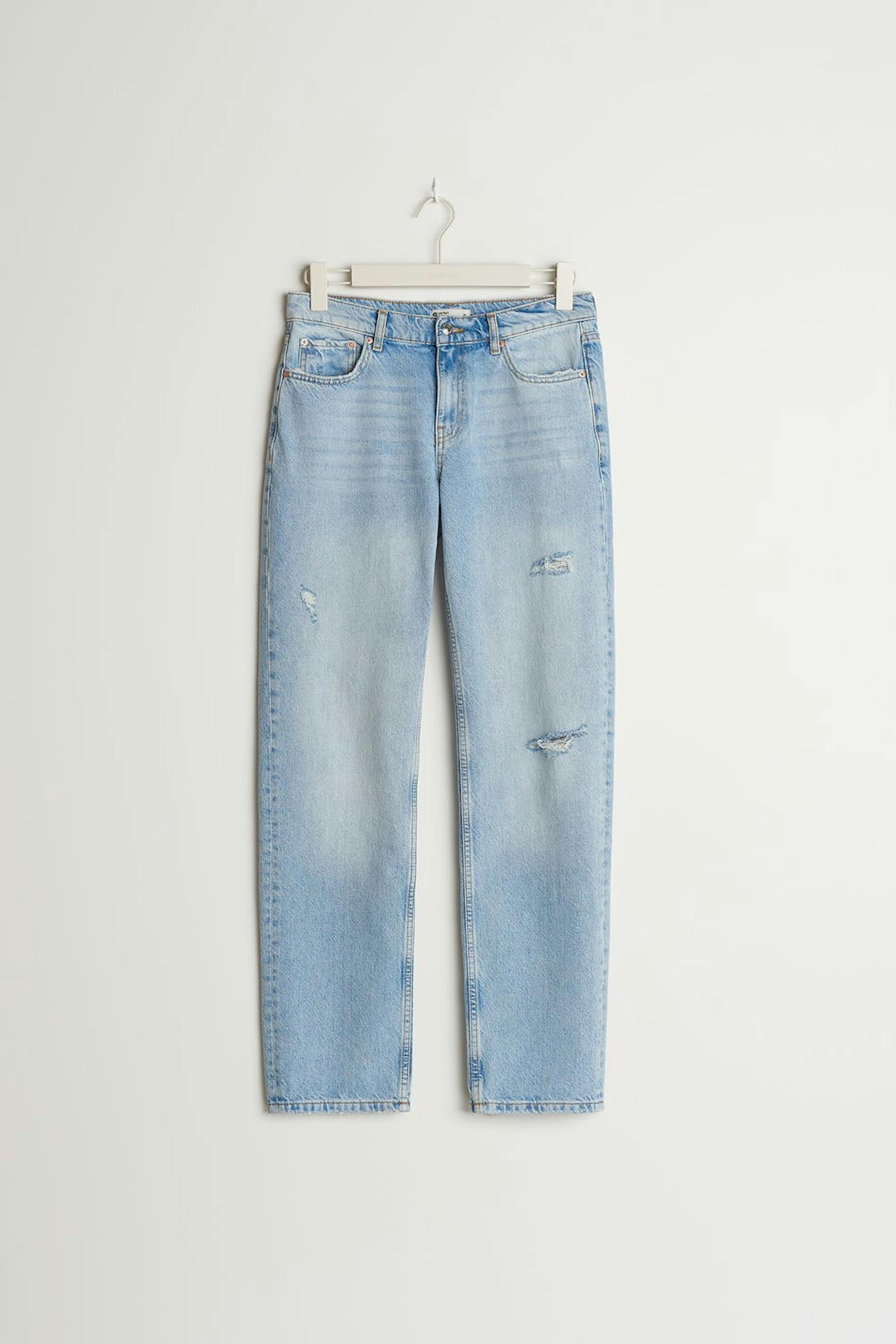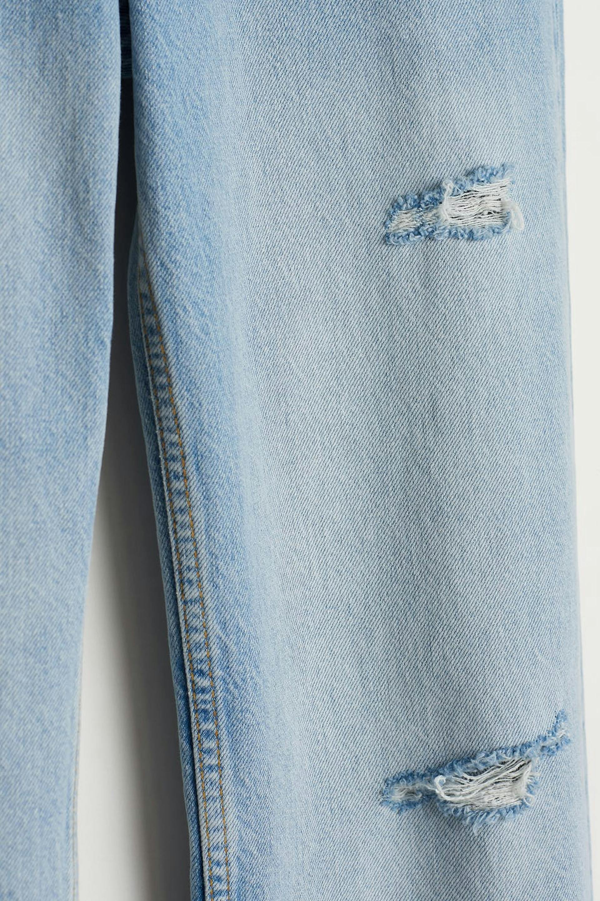 Straight-jeans met een rechte en geïnspireerd op de jaren'90 pasvorm. De spijkerbroek is licht blauw en heeft scheuren. Het is gemaakt van denim en heeft een lage taille, een rits met rits en zakken aan de voor- en achterzijde.