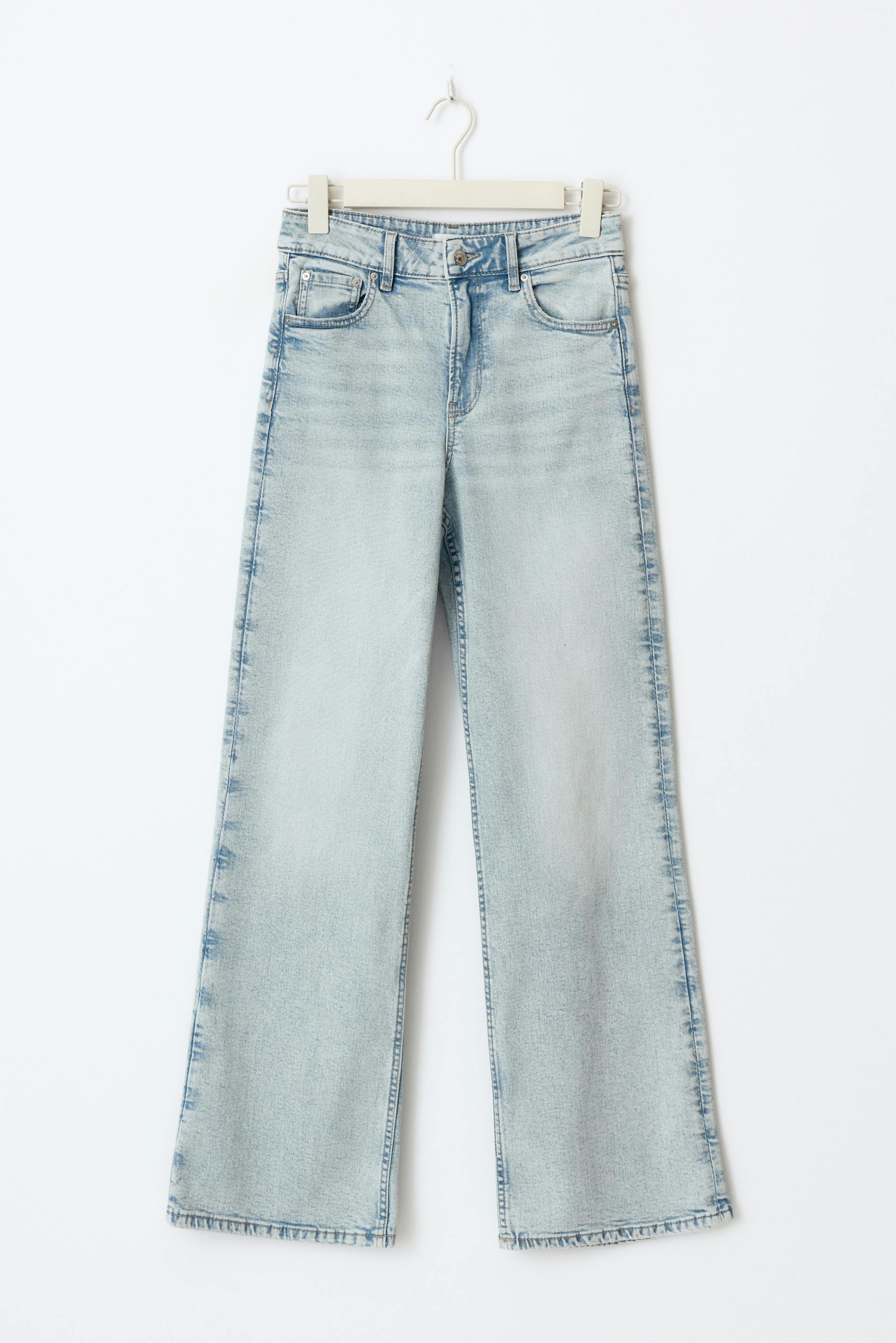 Petite spijkerbroek met korter been. De spijkerbroek is licht blauw en heeft hoge taille. Het heeft brede broekspijpen, elastische kwaliteit en zakken aan de voor- en achterzijde.