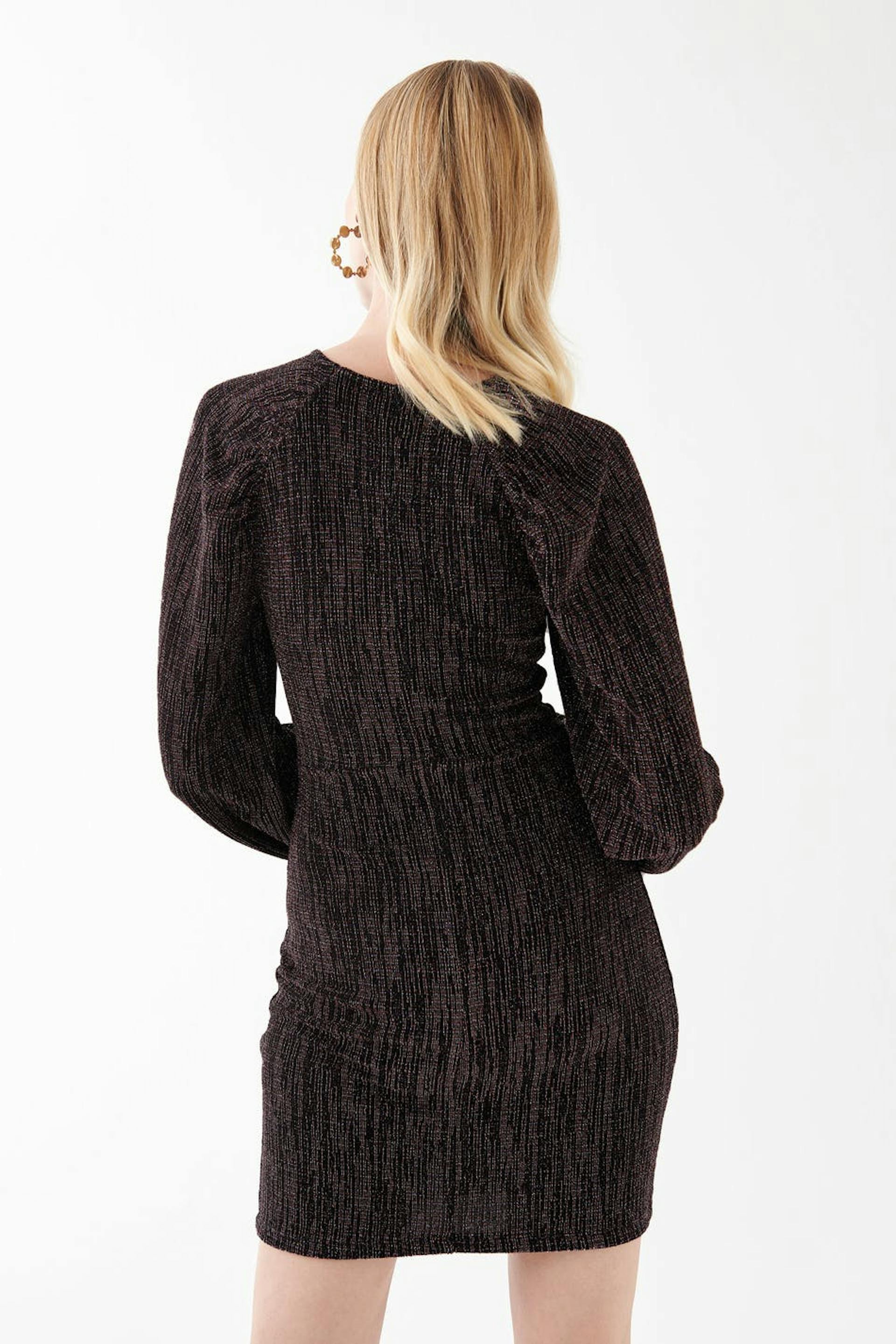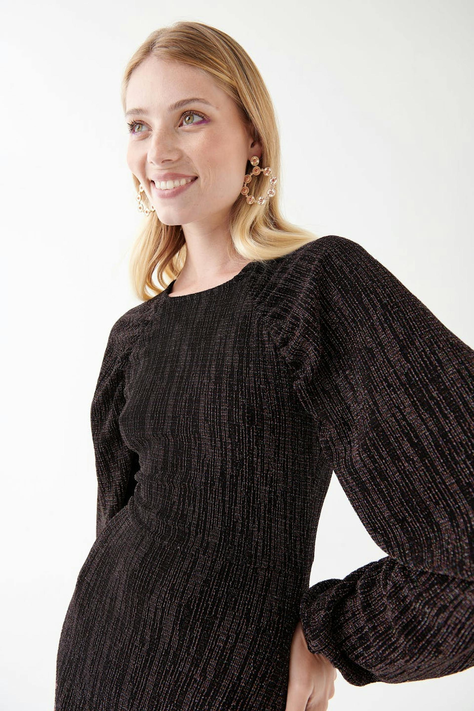 Korte jurk met een nauwsluitende pasvorm. De jurk is perfect voor het feest, zwart en glanzend. Het is gemaakt uit tricot en heeft een lange pof mouw.
