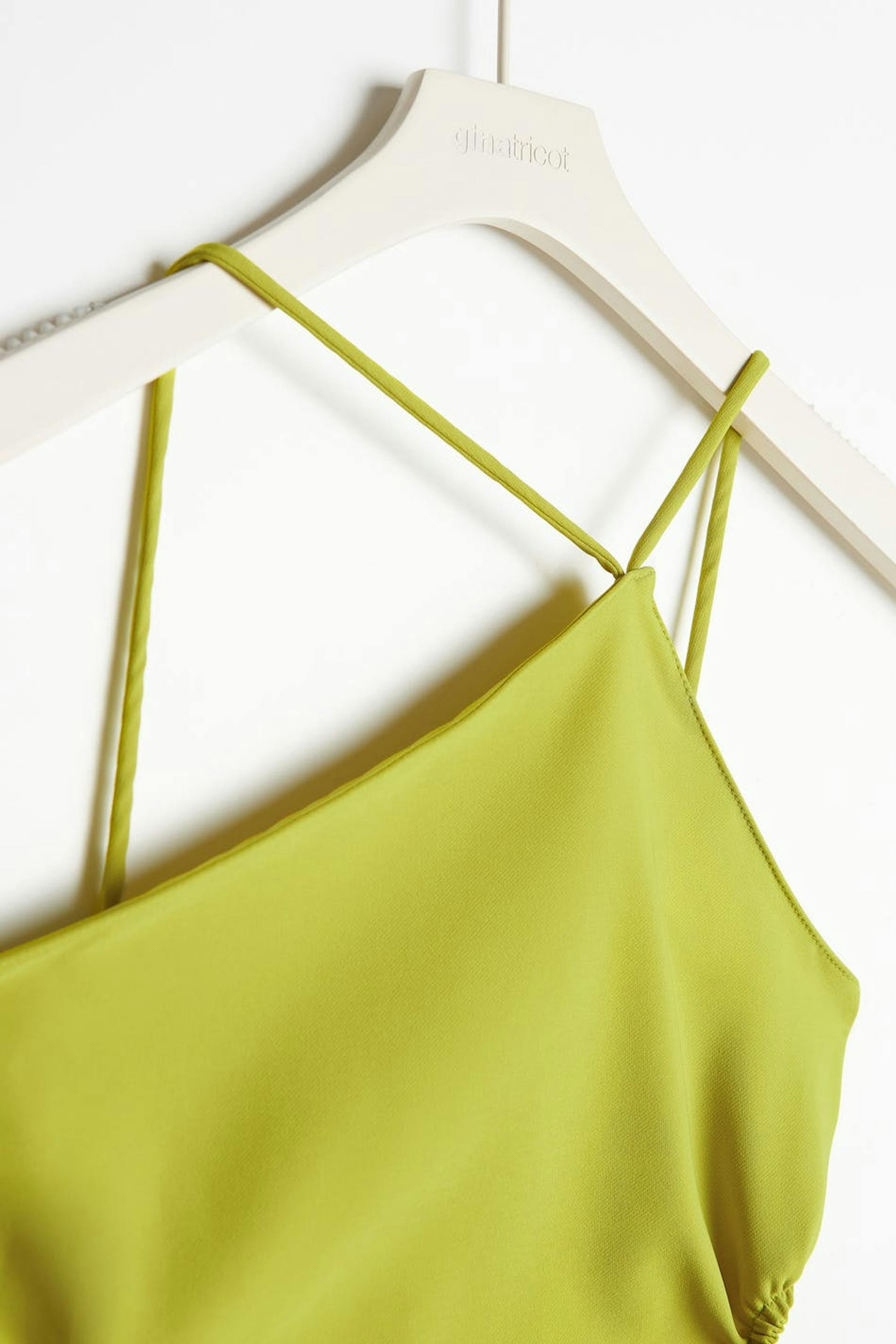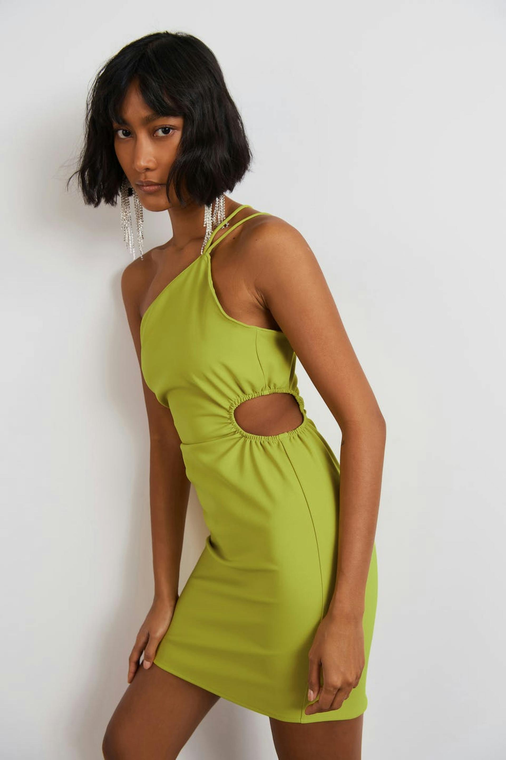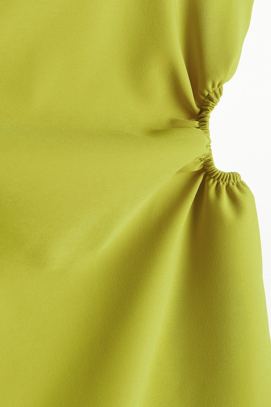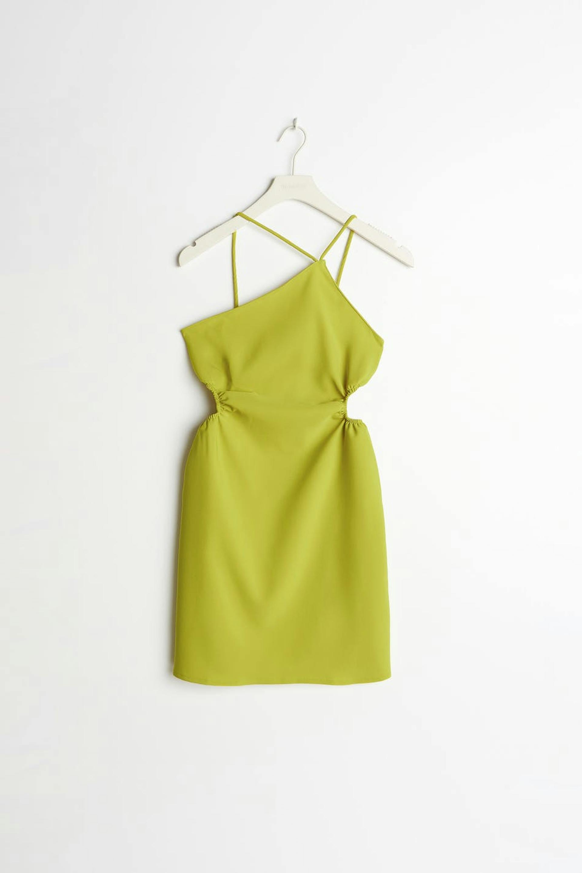 Korte jurk met uitgesnedene details aan de zijkanten. De jurk is perfect voor het feest, geel en mouwloos. Het heeft een gevlochten en elastische kwaliteit, een asymmetrische neklijn, dubbele schouderriemen aan de zijde en een verborgen rits op de rug.