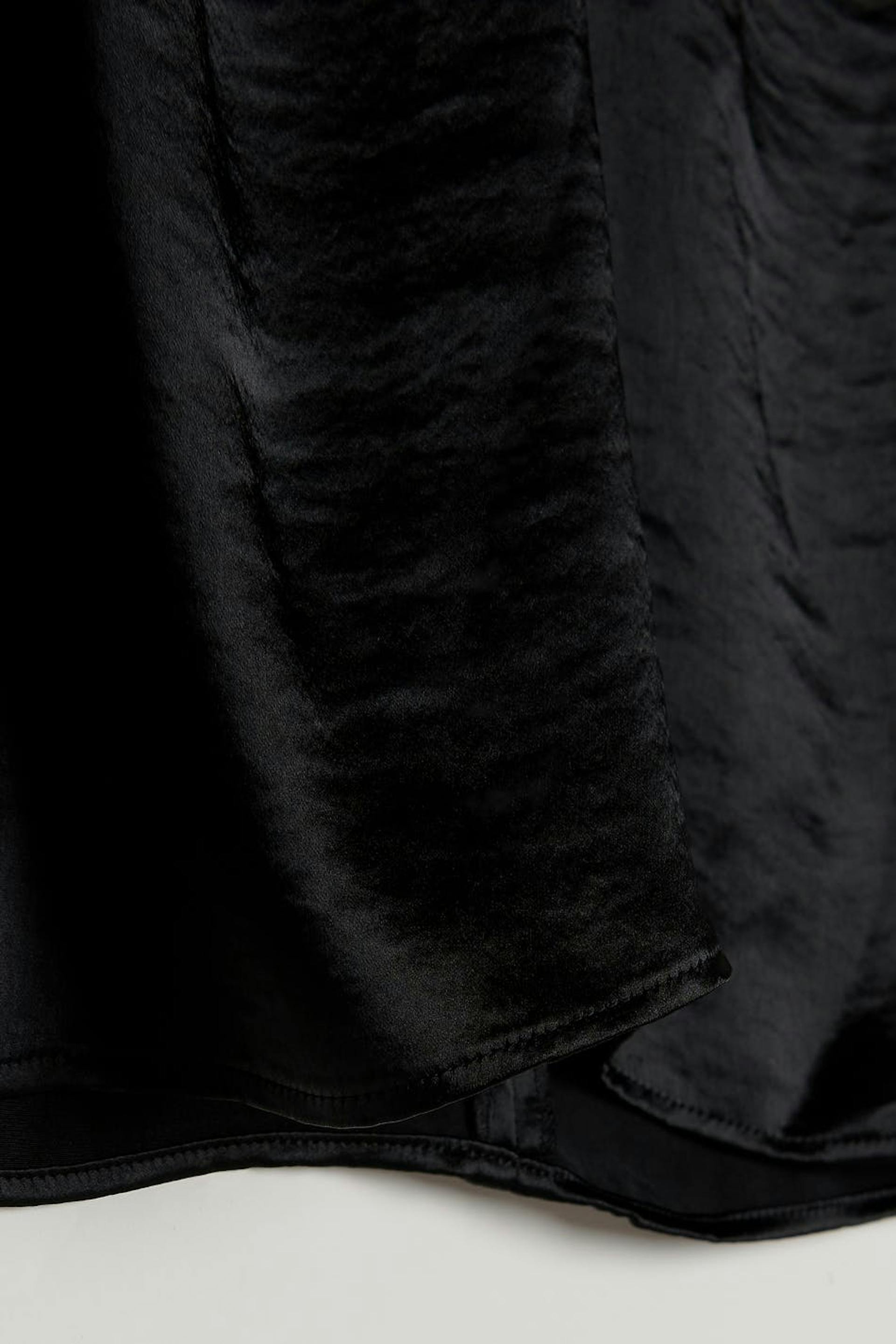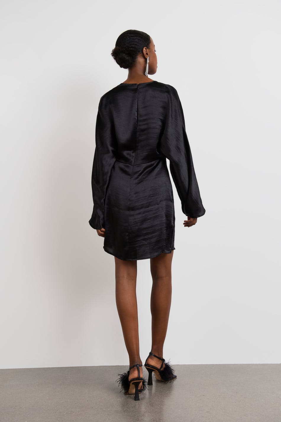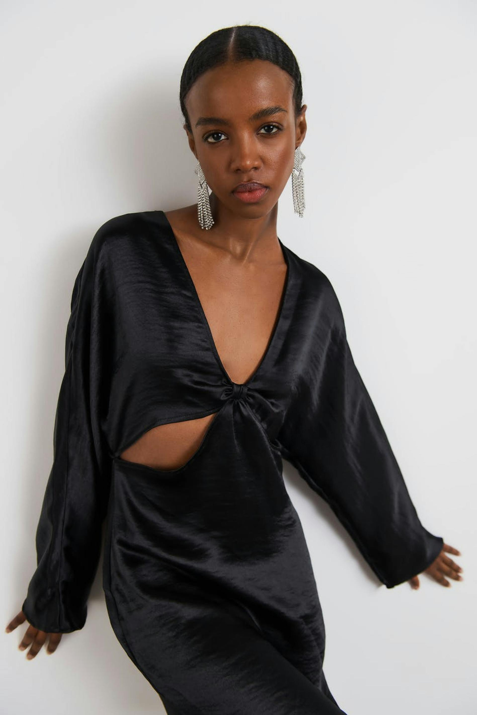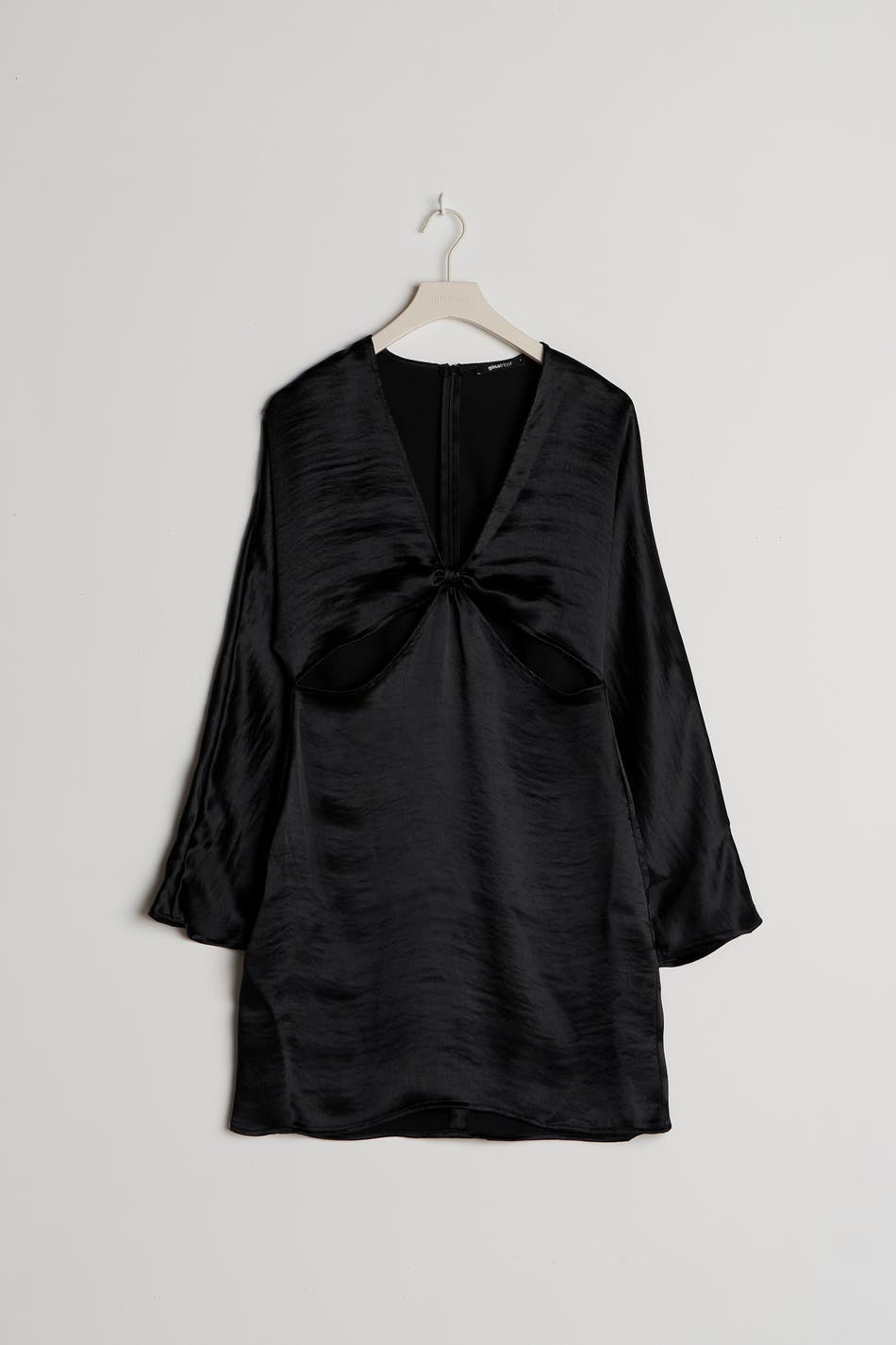 Korte jurk met uitgesnedene details aan de voorkant. De jurk is perfect voor het feest, zwart en met lange mouwen. Het heeft een satijnachtig materiaal en een v-hals met een knoop detail.