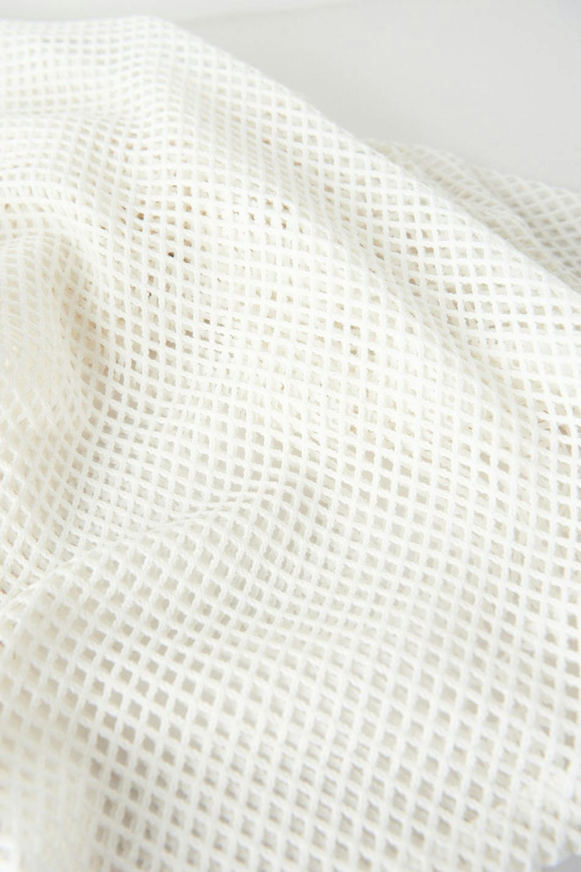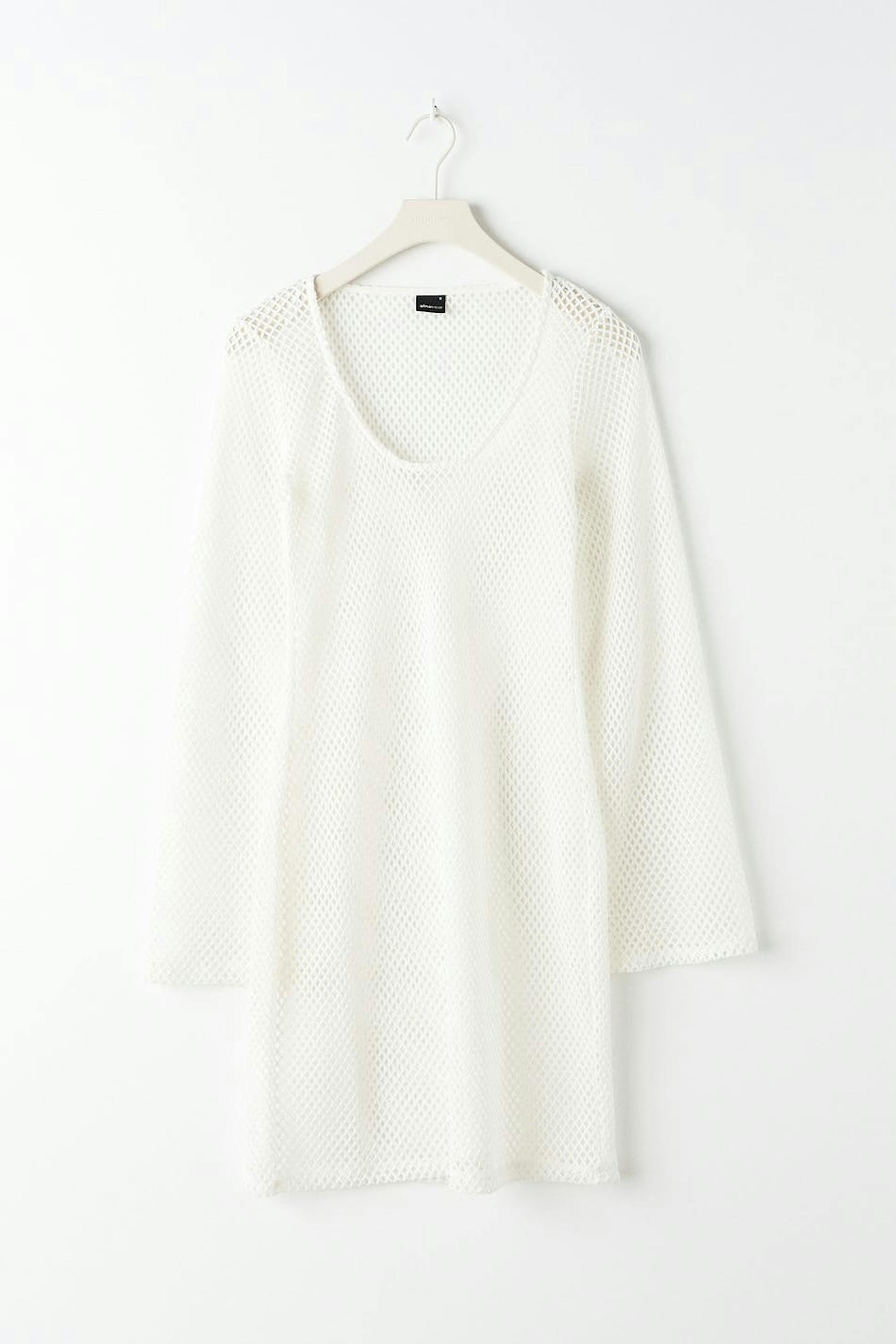 Strandjurk met lange mouwen van tricot met u-hals. De jurk is wit en heeft een normale pasvorm. Het heeft lantaarnmouwen en een korte lengte.