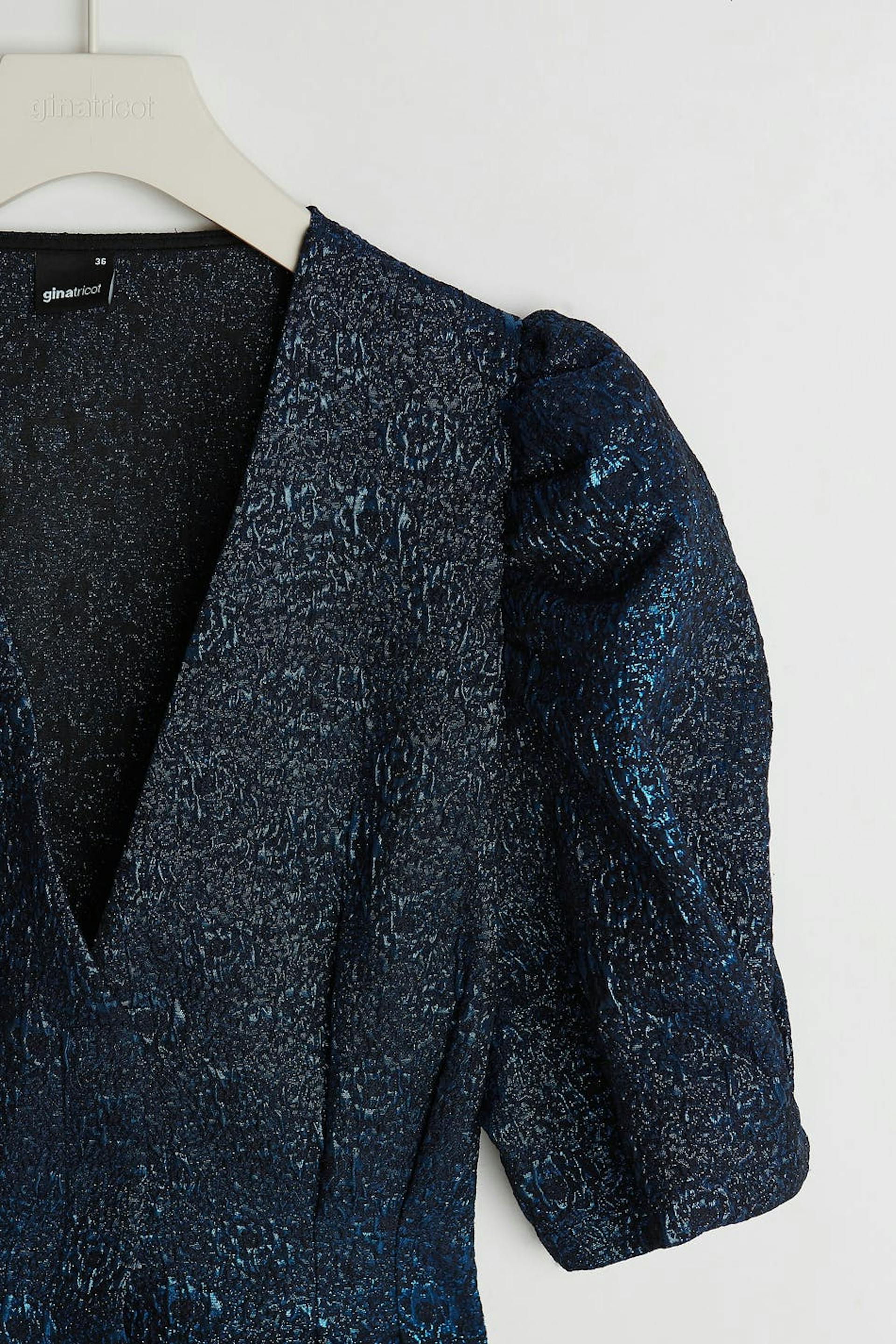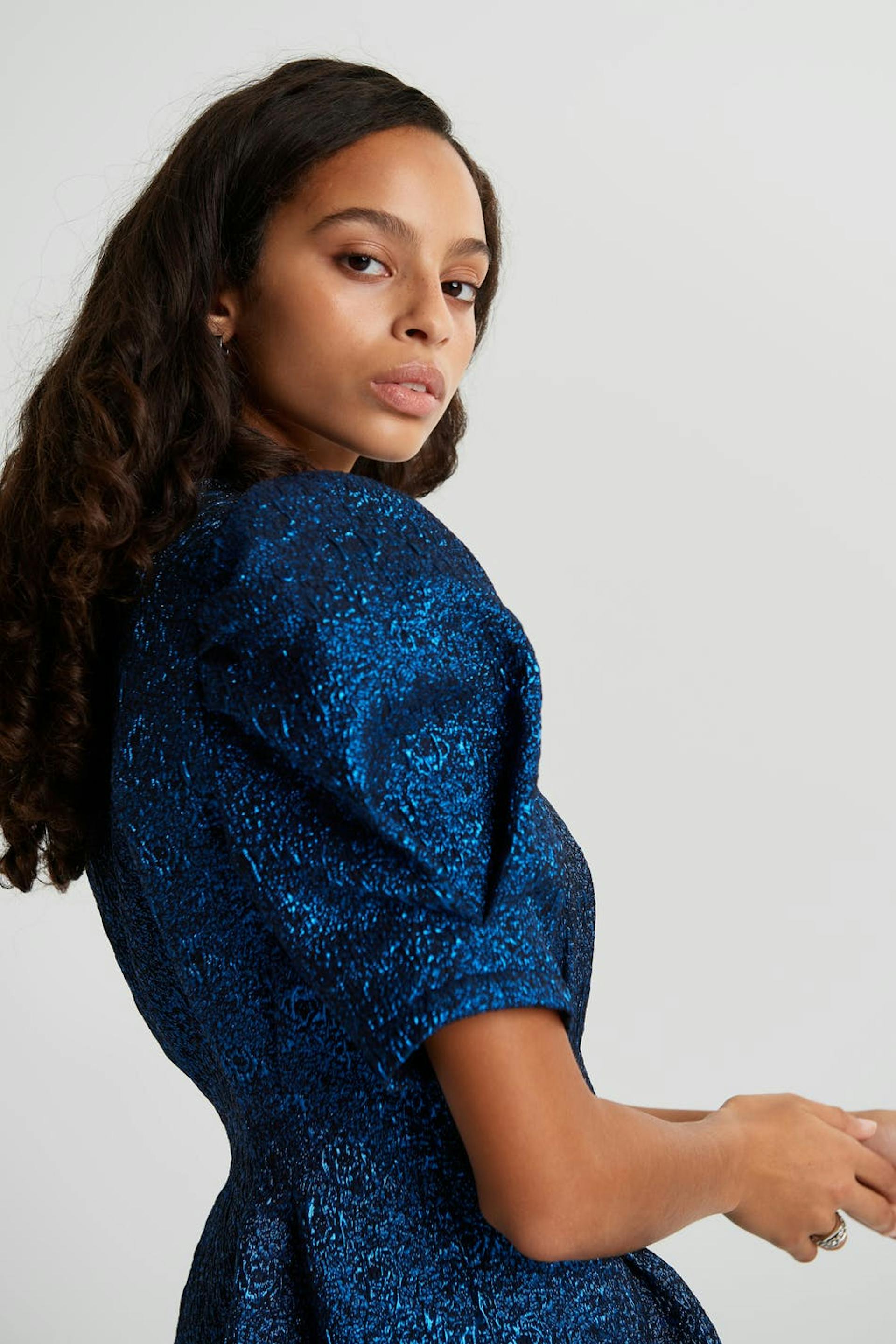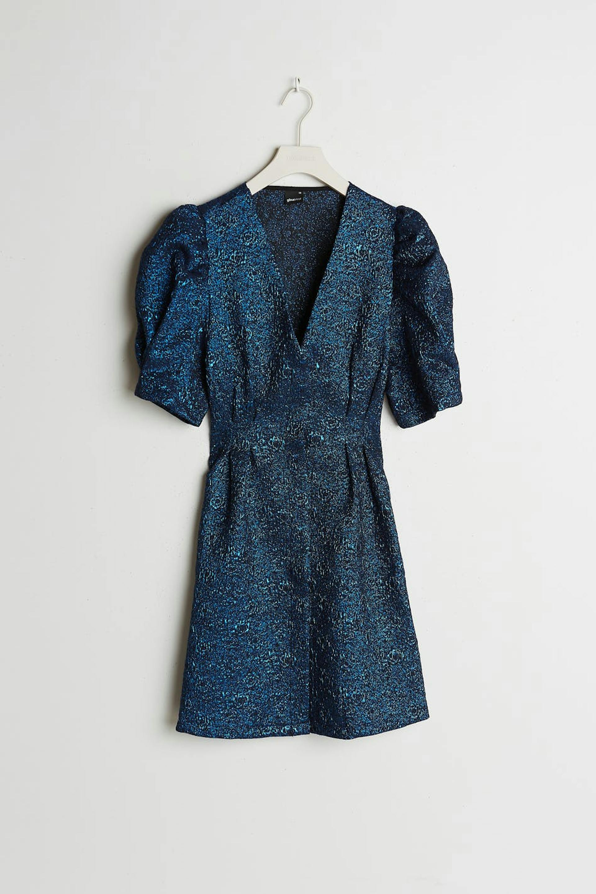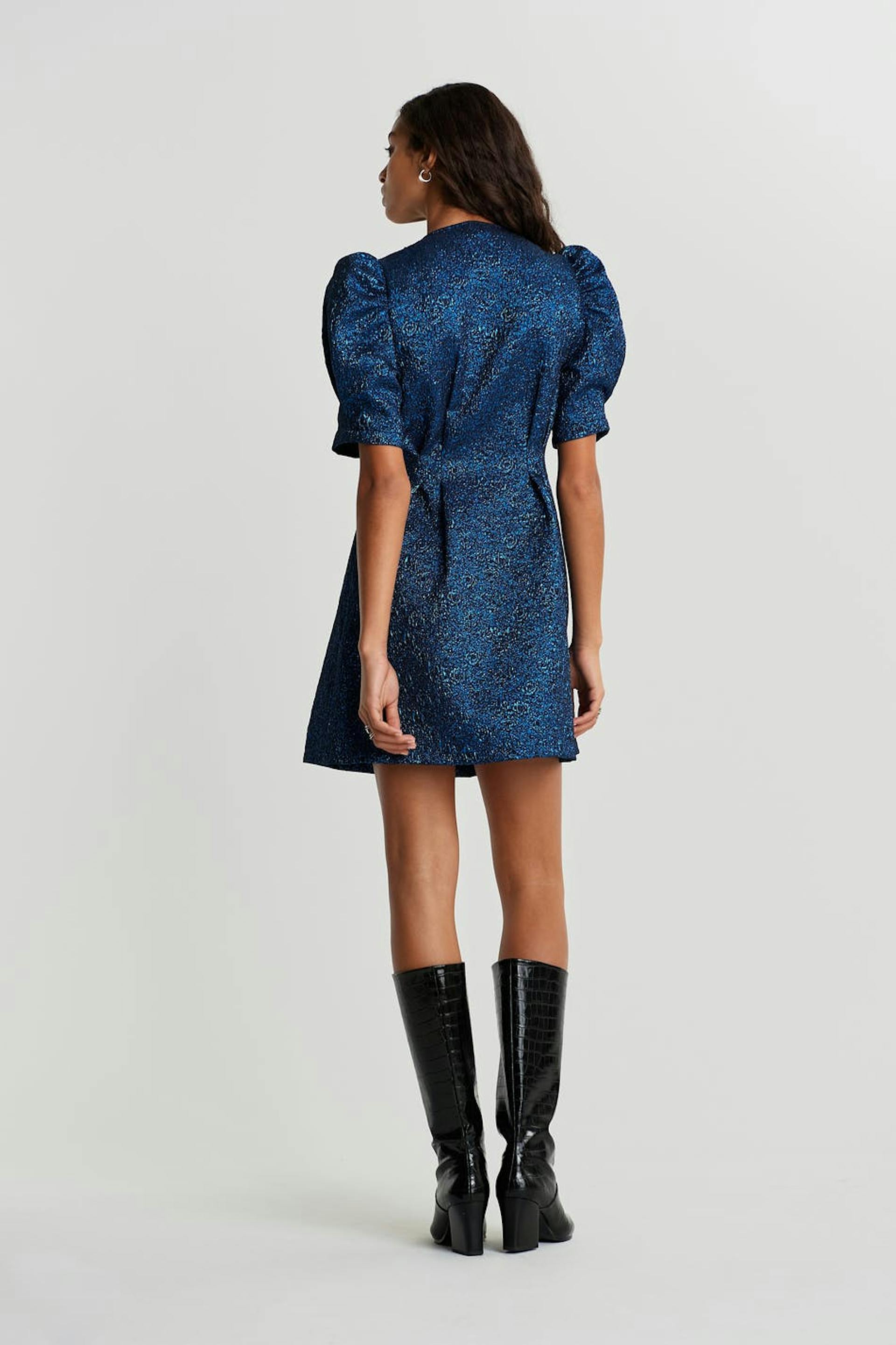 Dress with short puff sleeves. V-neck. Supplier: Huzi Tekstil Ltd Sti Production unit: Yesim Tekstil-Hulya Karacoban
