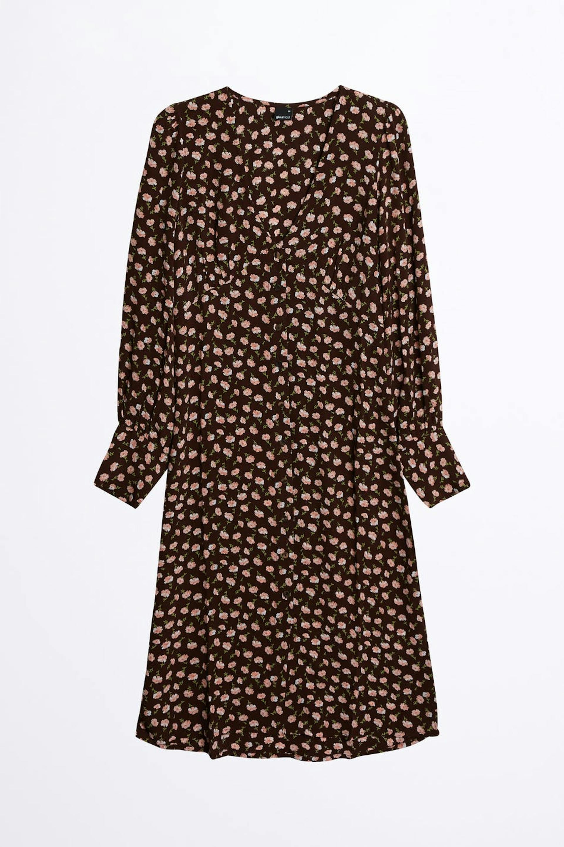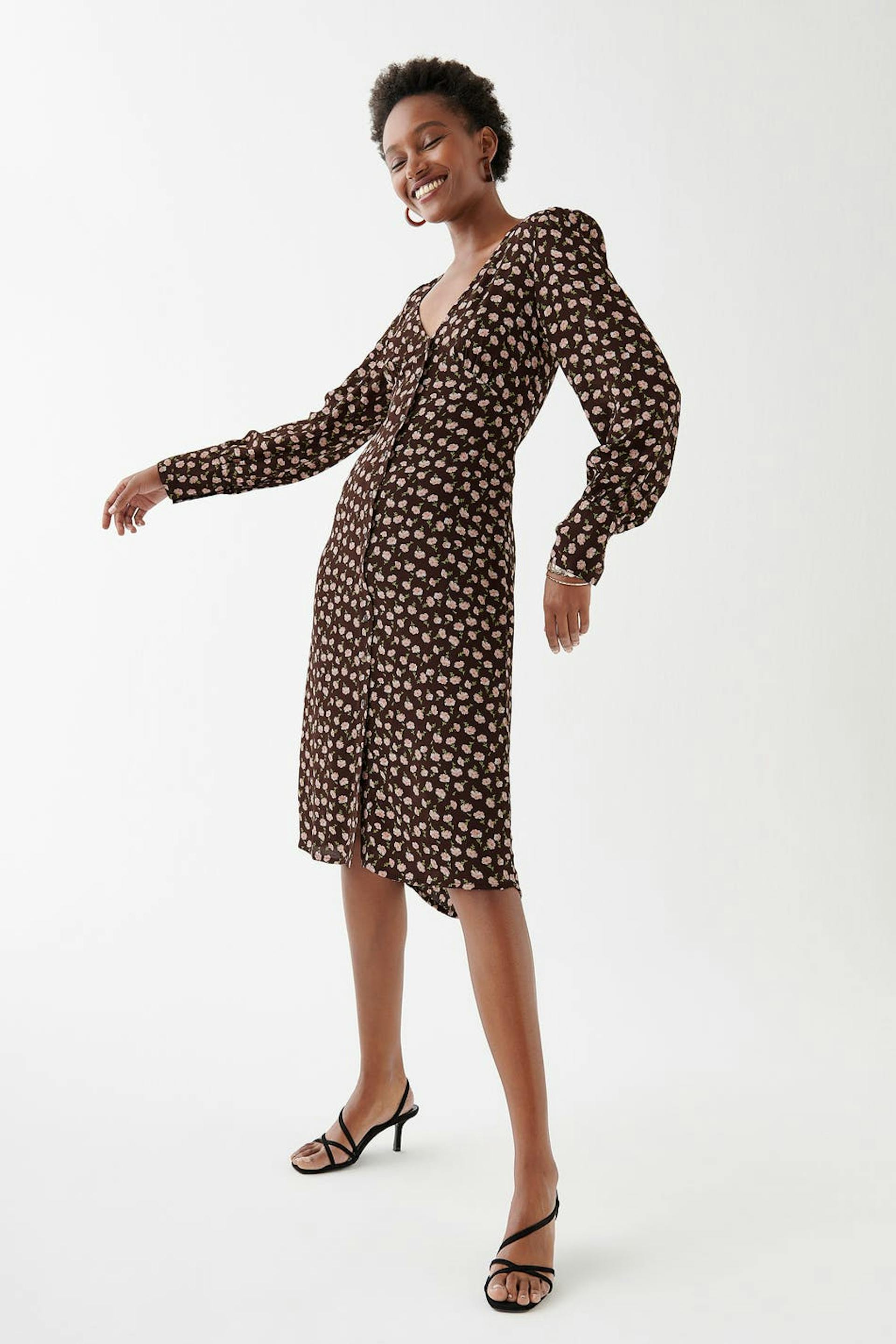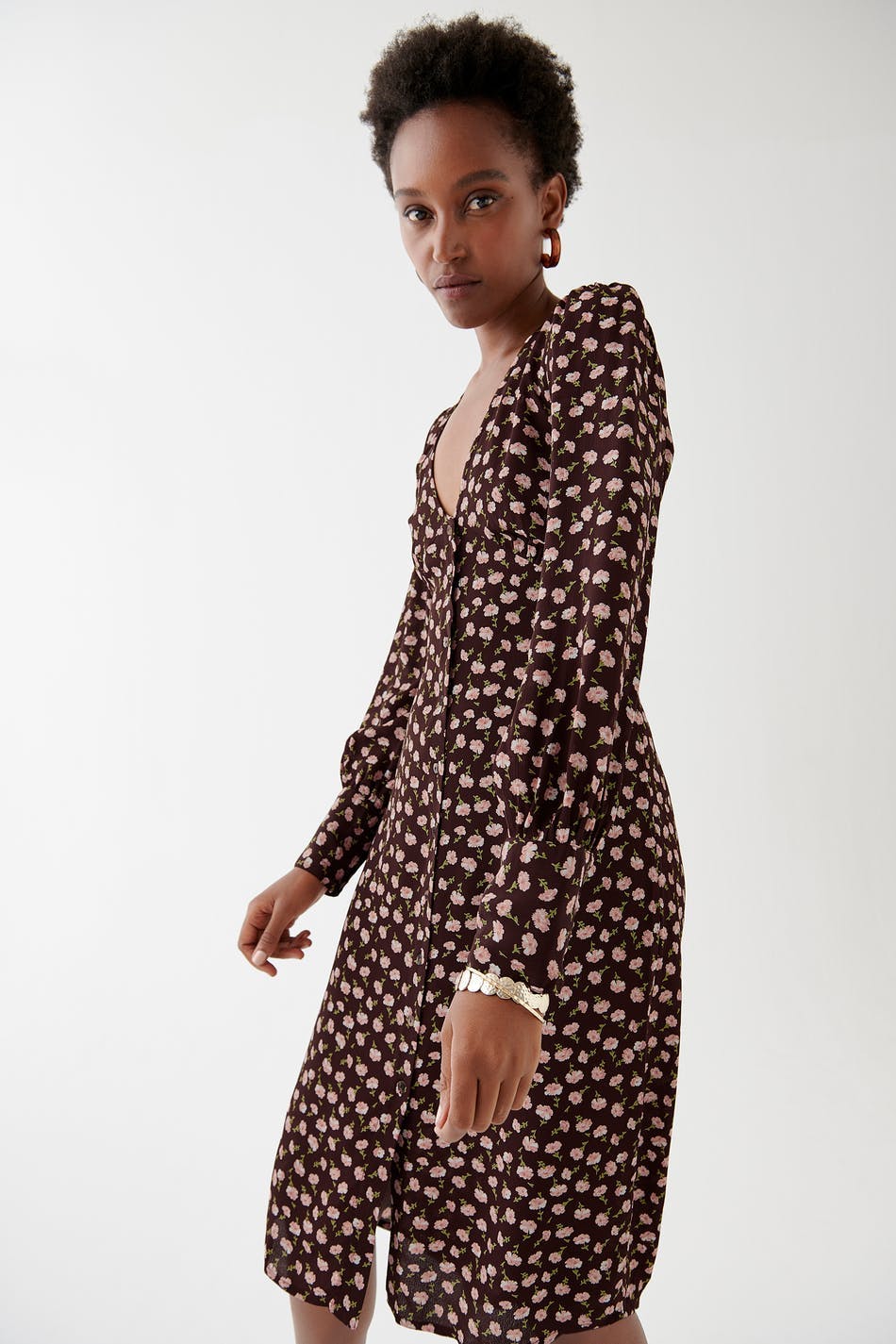 Woven midi dress with long sleeve and slight balloon shape. Buttons along front.