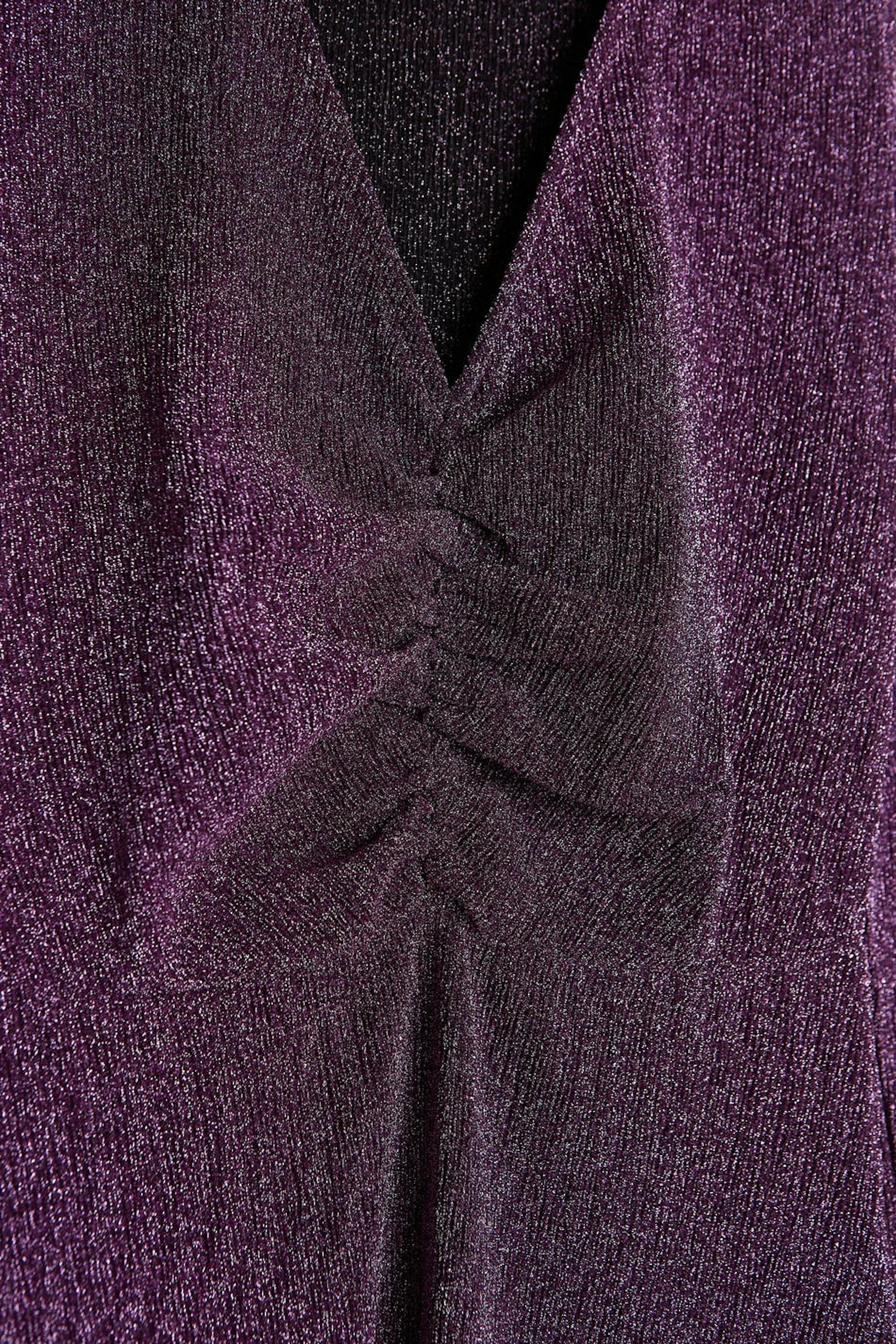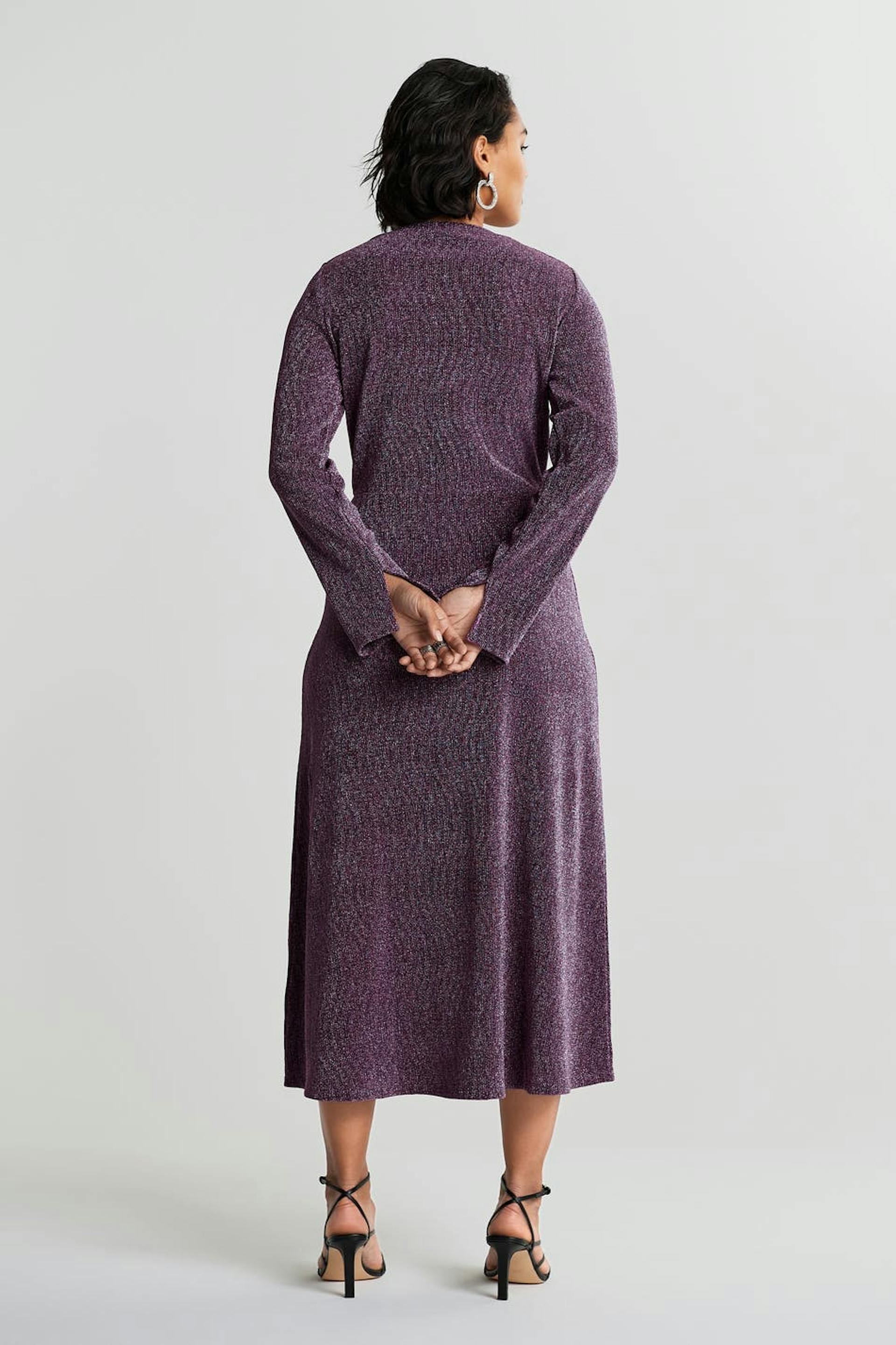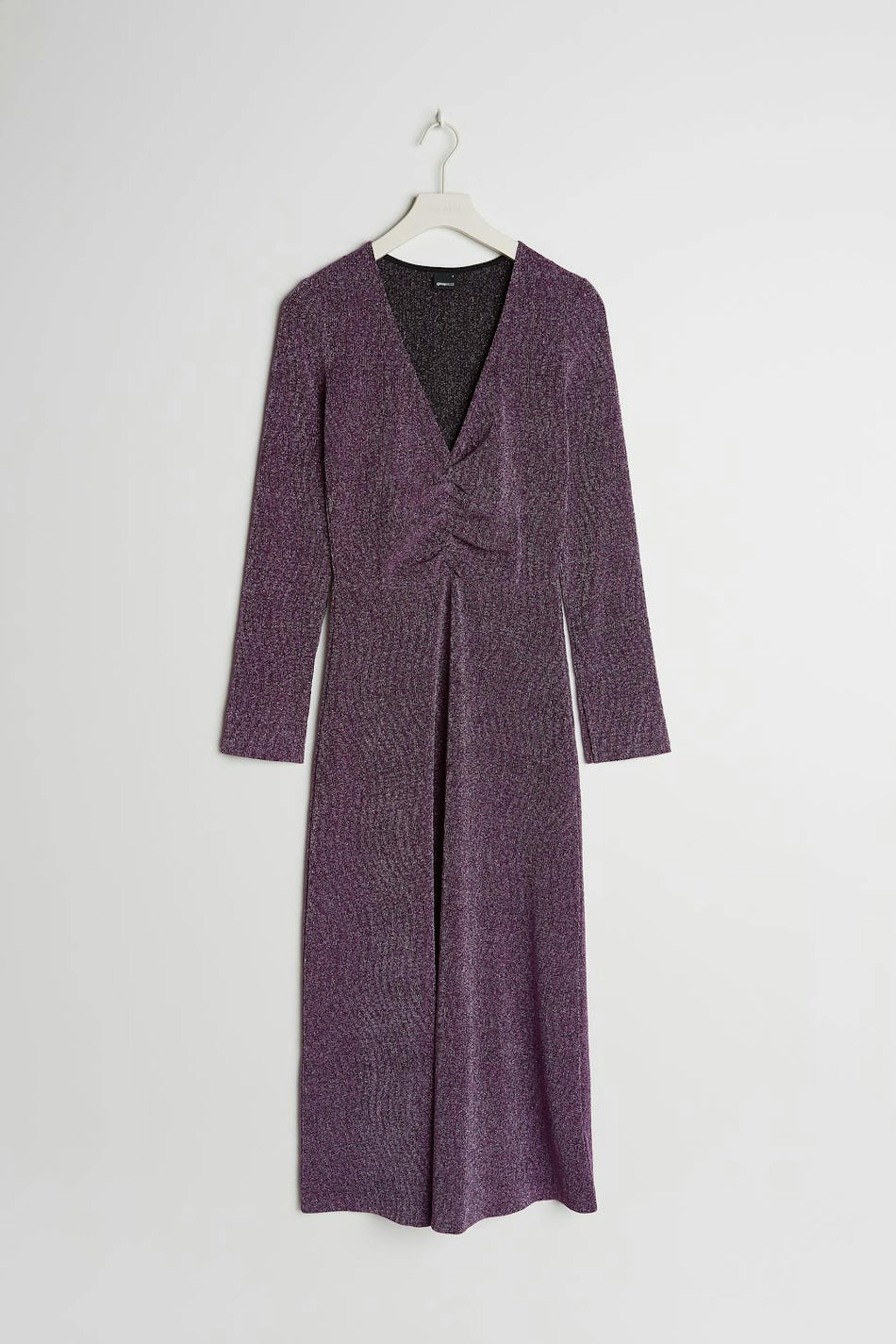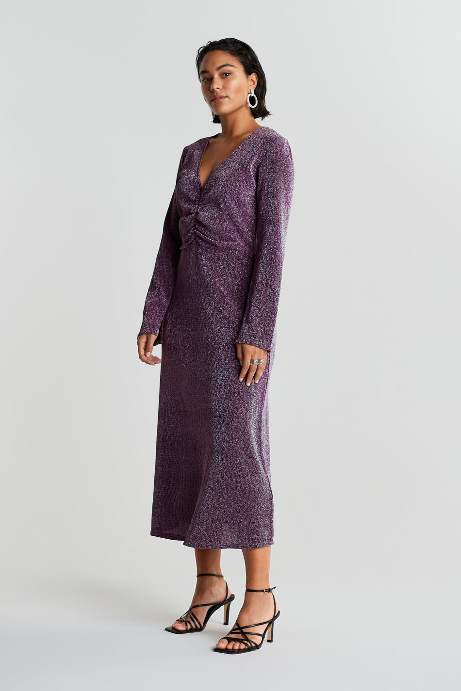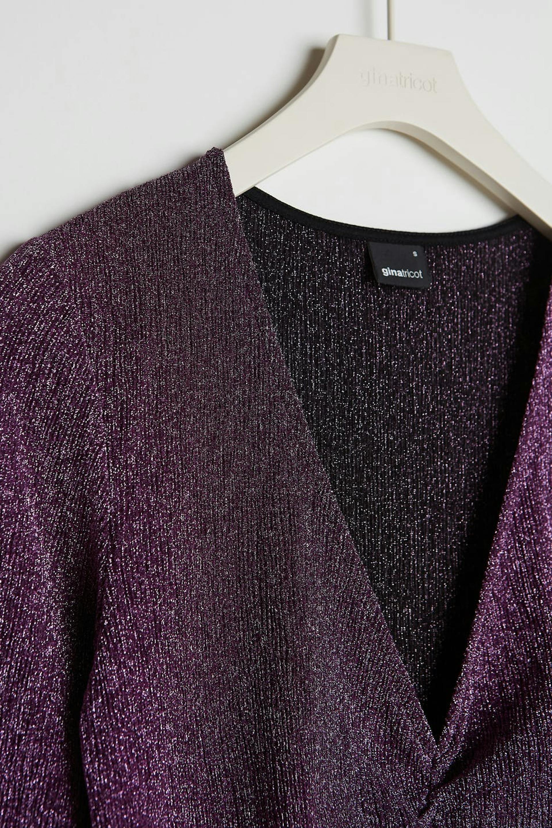 Glanzende jurk met een nauwsluitende pasvorm. Perfect voor het feest, paars en halfhoog en lange mouwen. Het heeft een v-necksnit en een vergaring aan de voorkant.