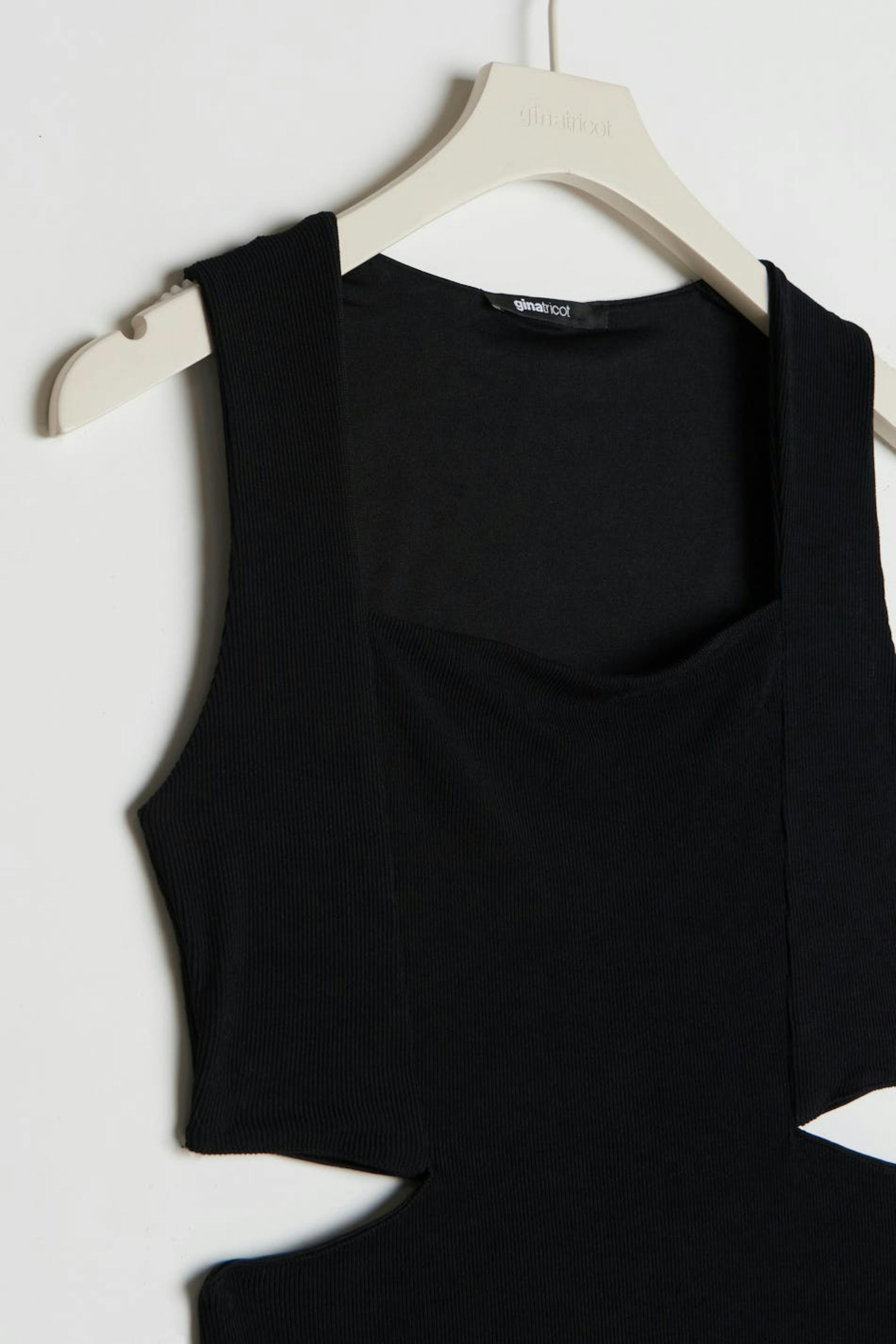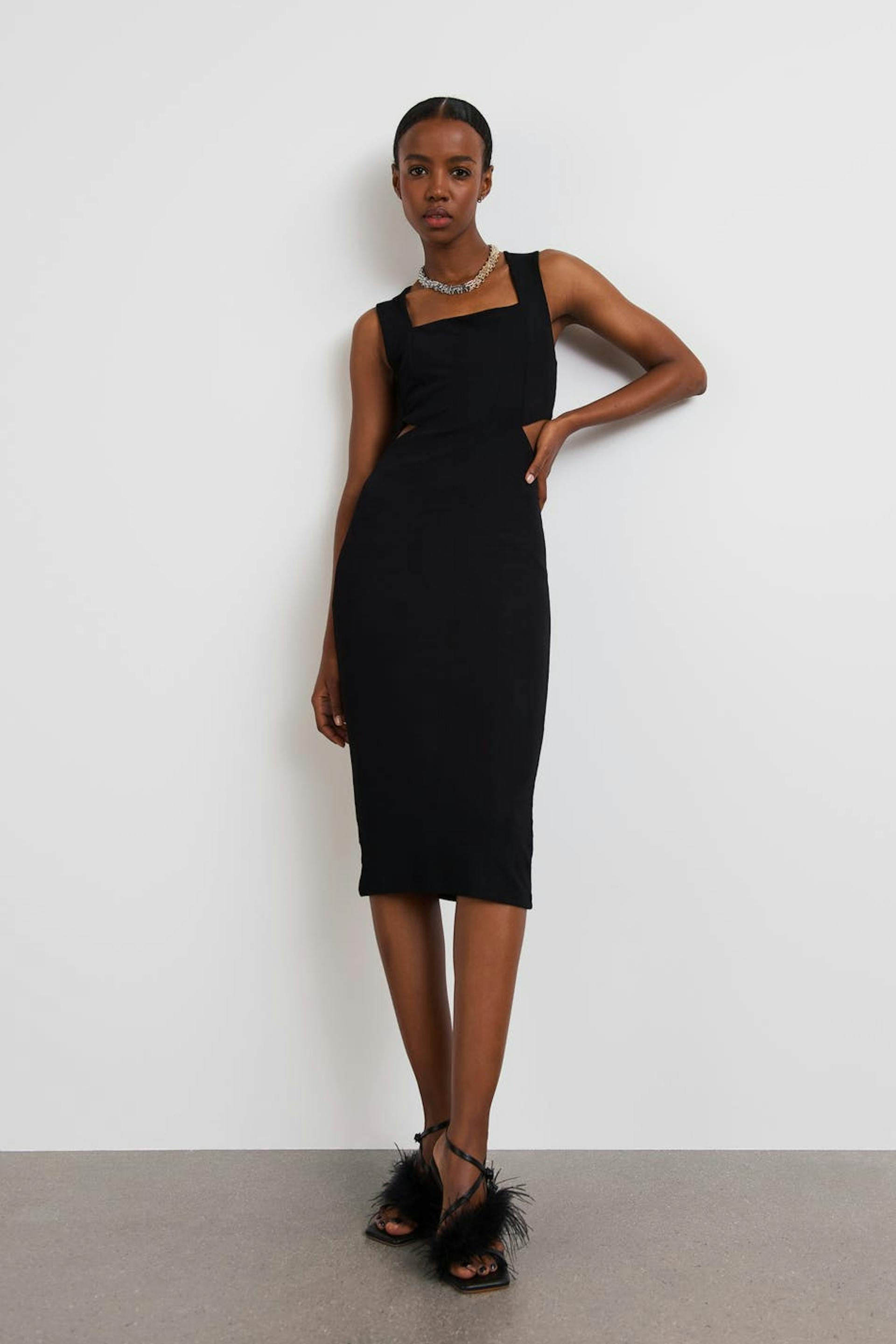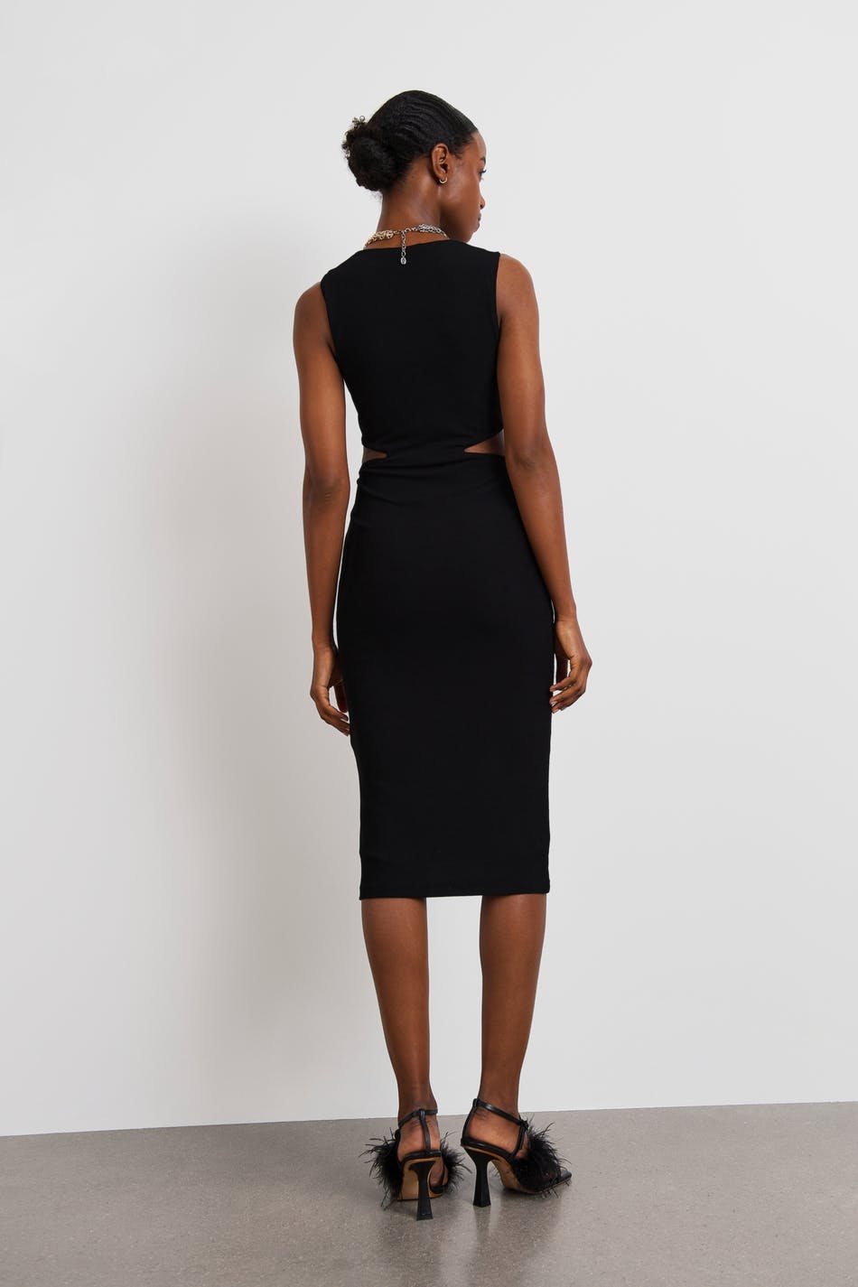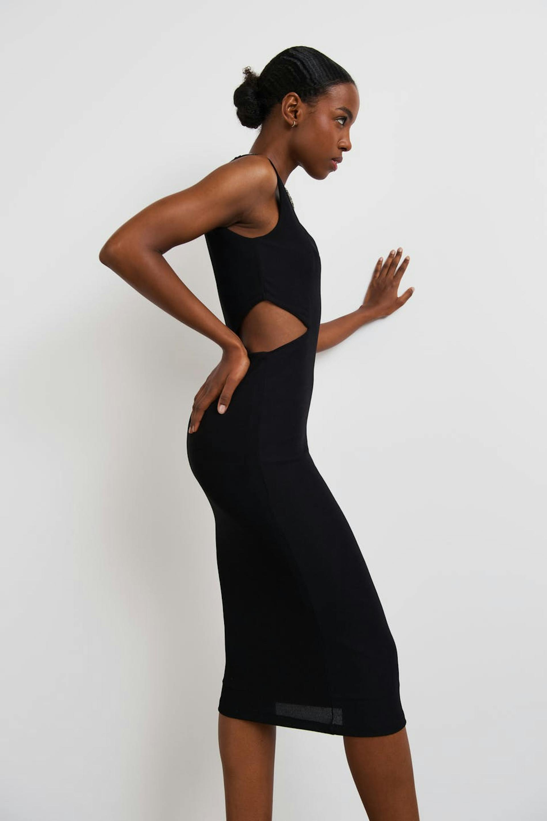 Mouwloze jurk met een nauwsluitende pasvorm. De jurk is perfect voor het feest en zwart en heeft uitgesnedene details aan de zijkanten.