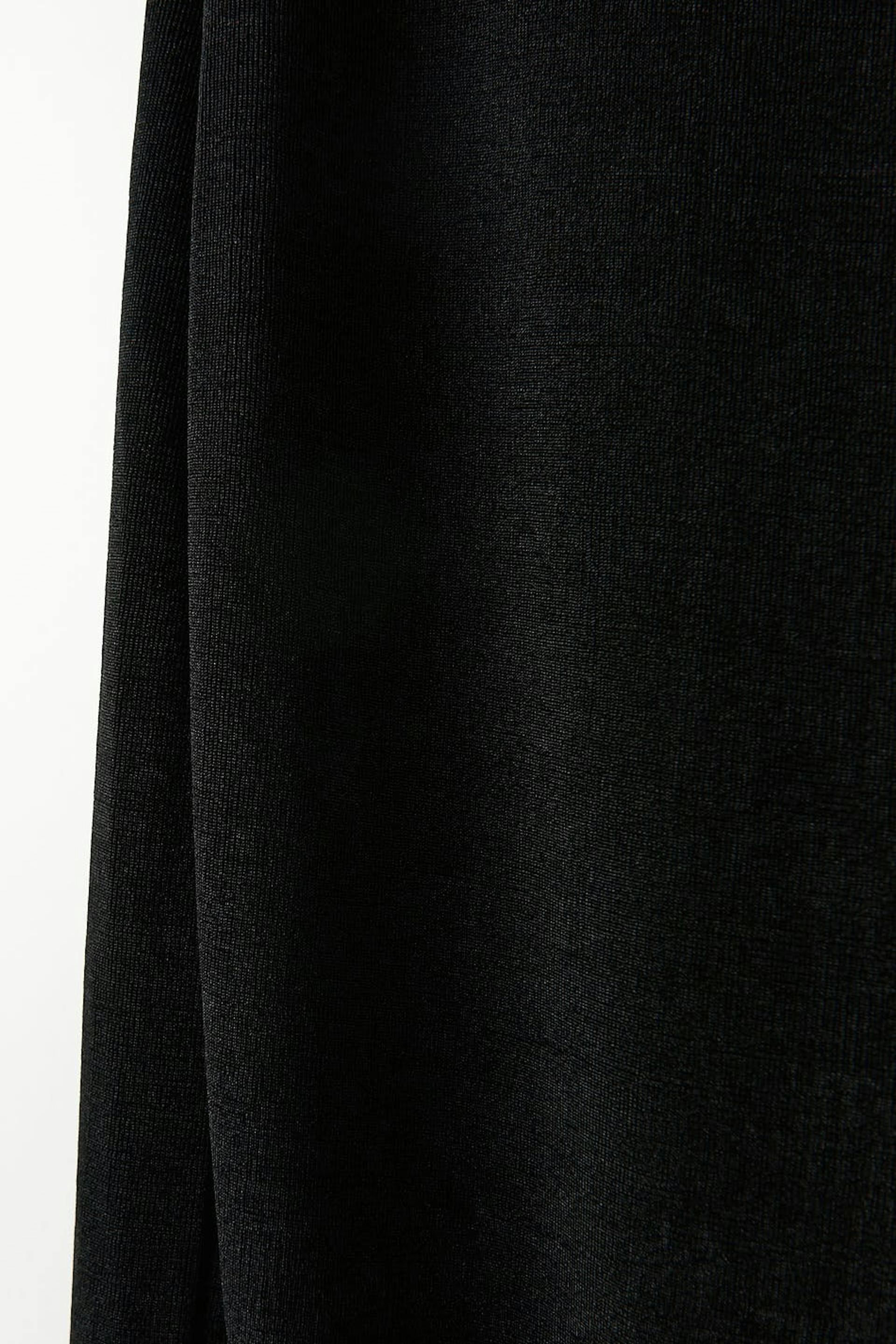 Kokerjurk met spleet op het achterpand. De jurk is zwart en heeft een nauwsluitende pasvorm.